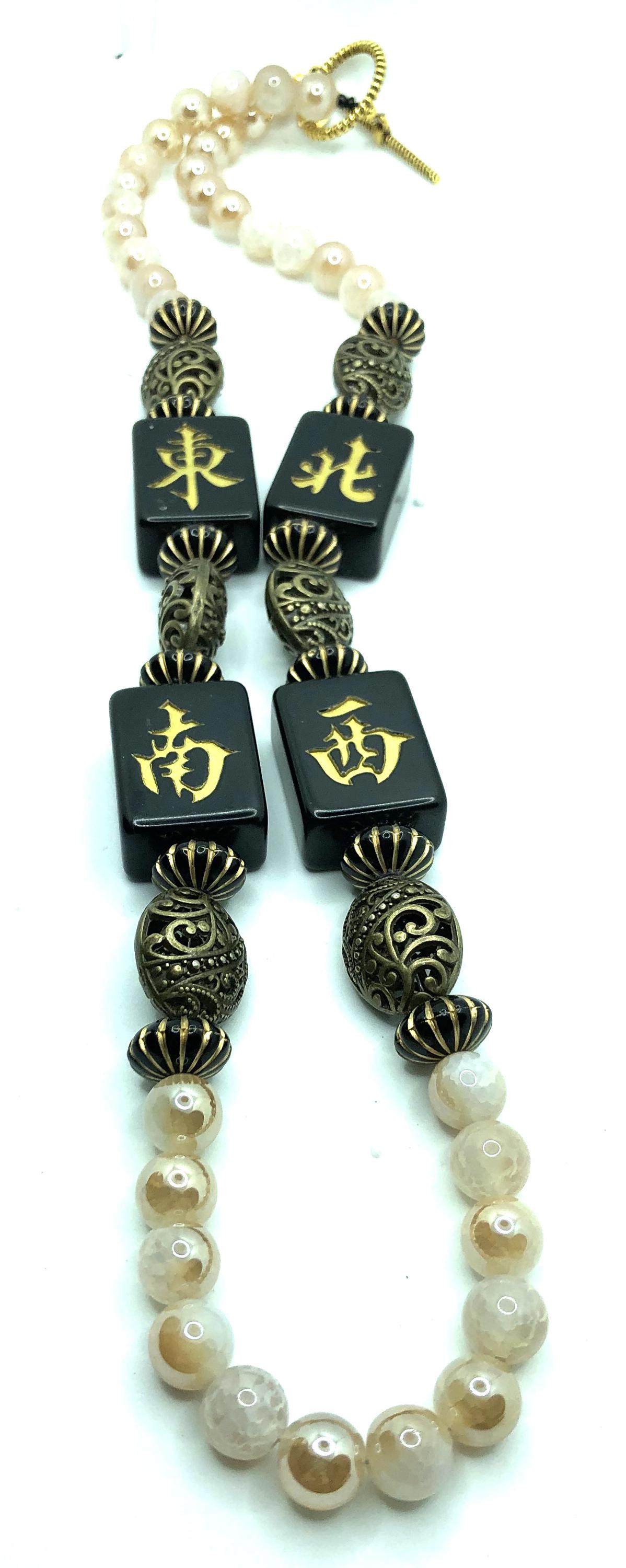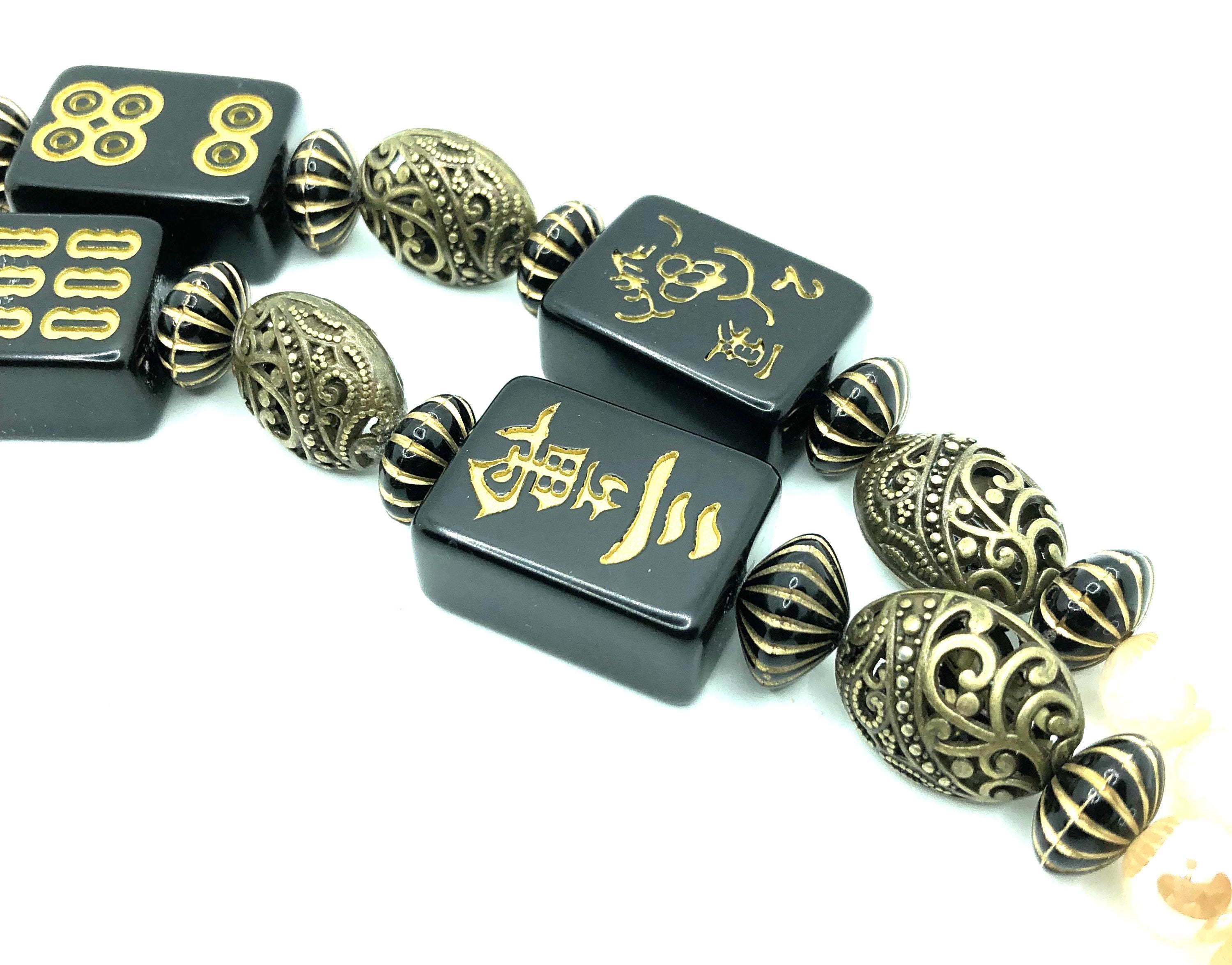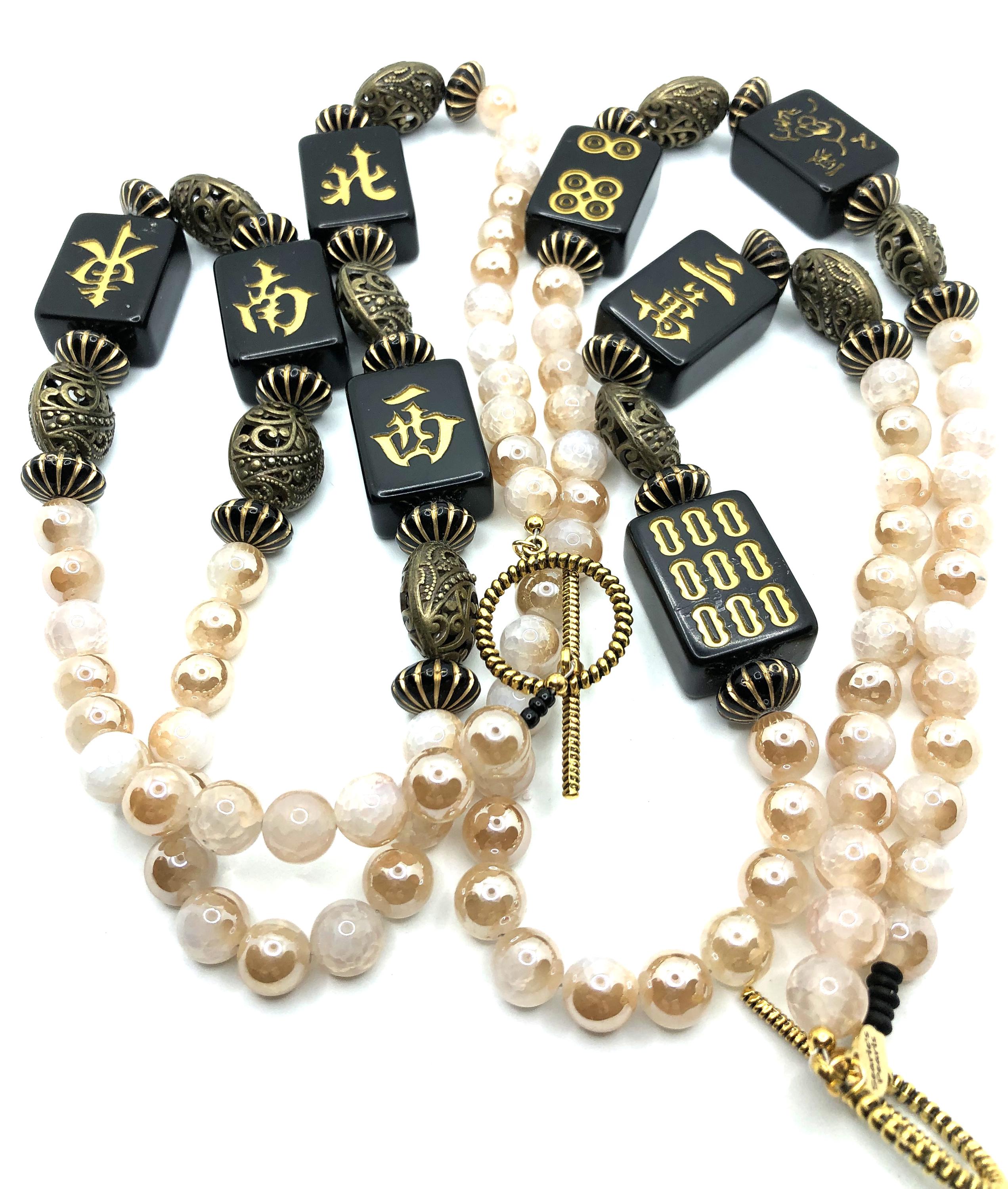 These two 30" necklaces are made with antique beads, black mahjong tiles, and champaign beads.