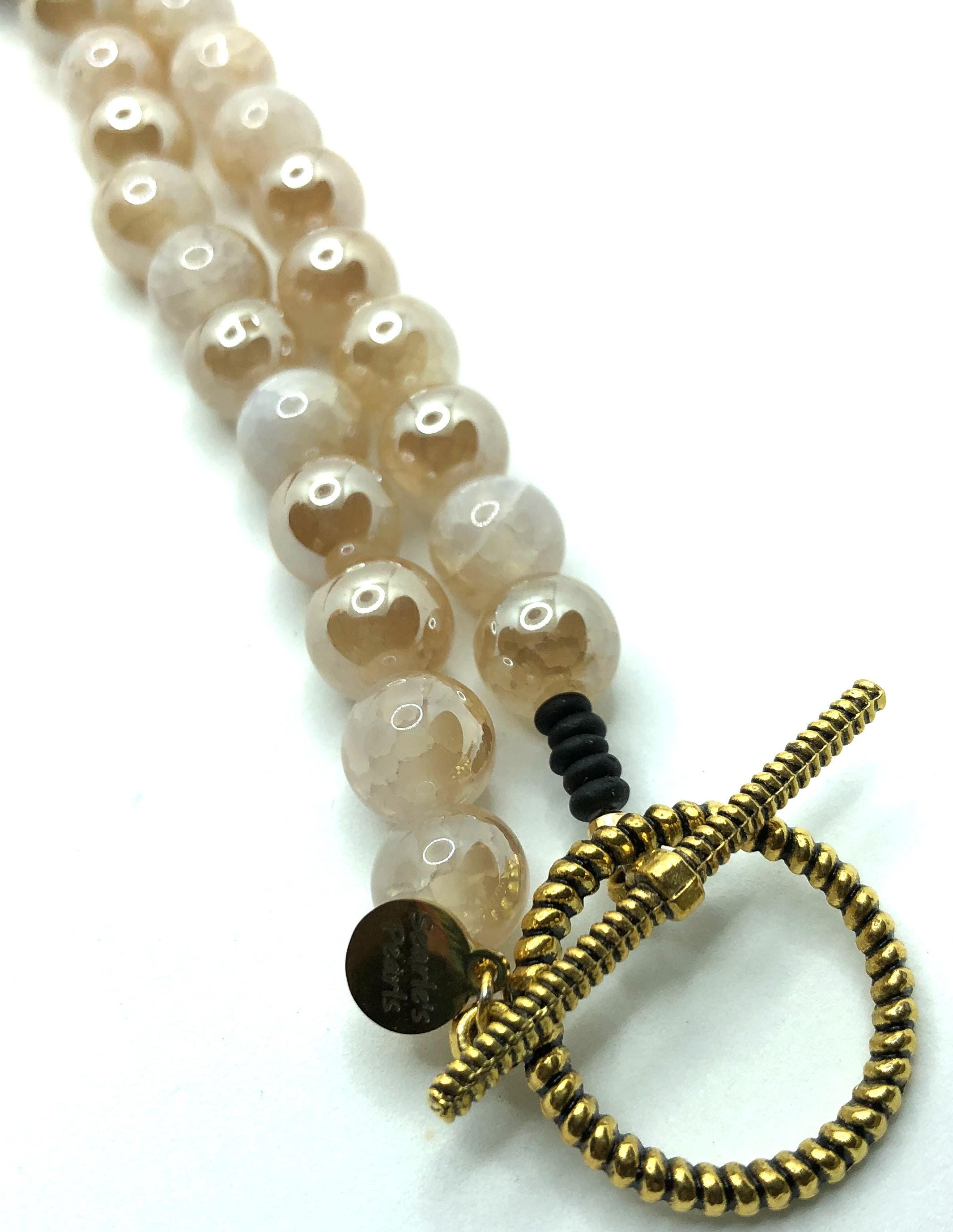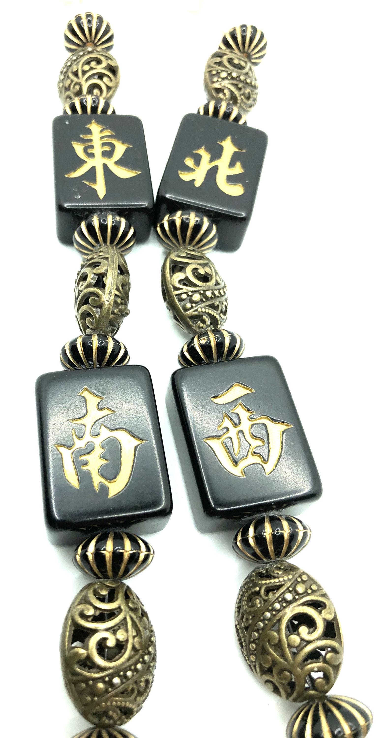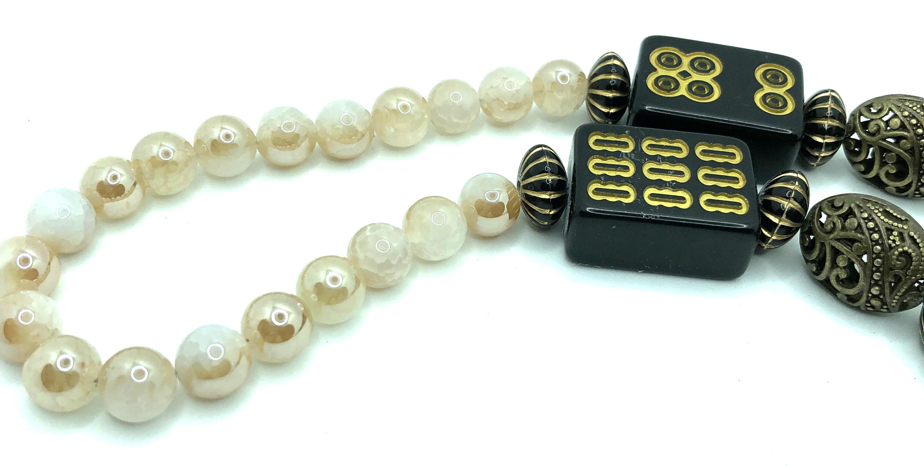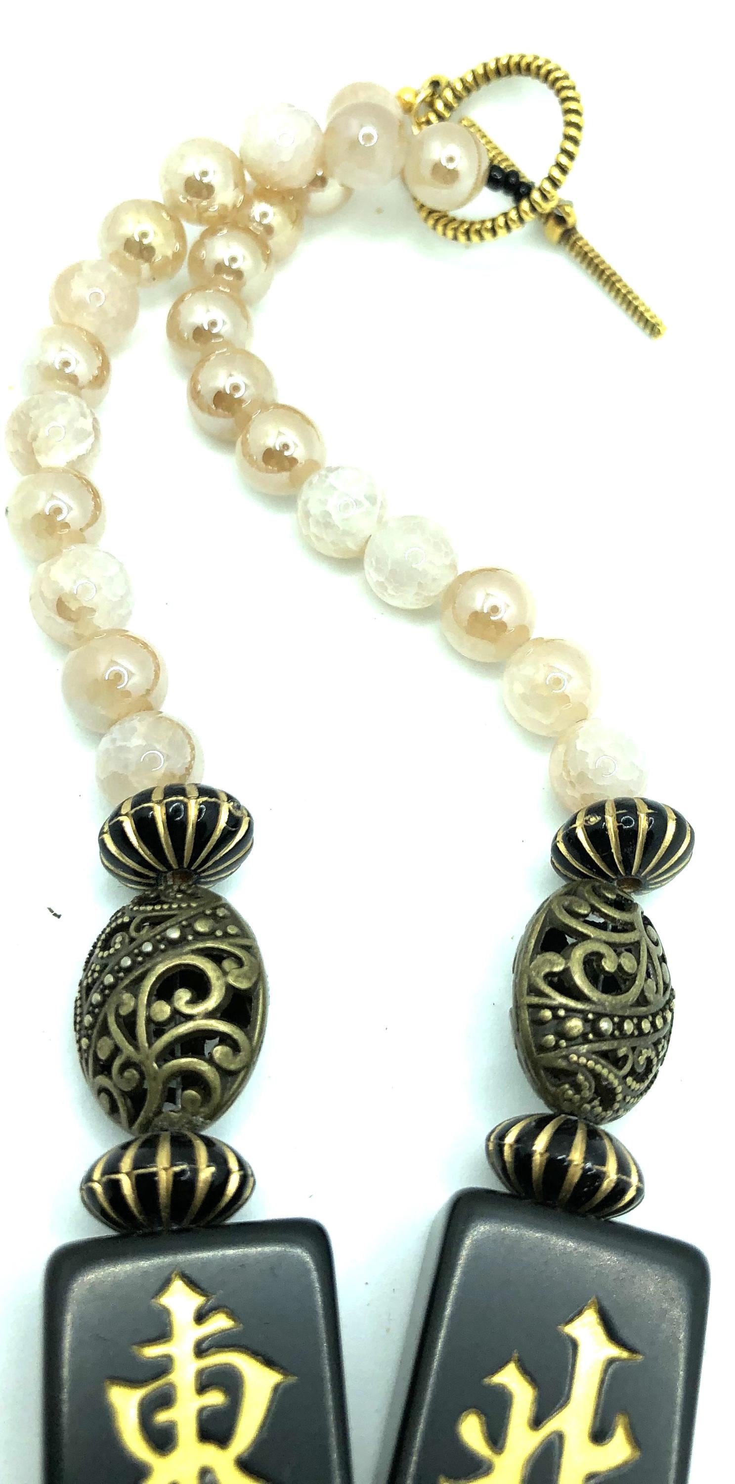 These two 30" necklaces are made with antique beads, black mahjong tiles, and champaign beads.