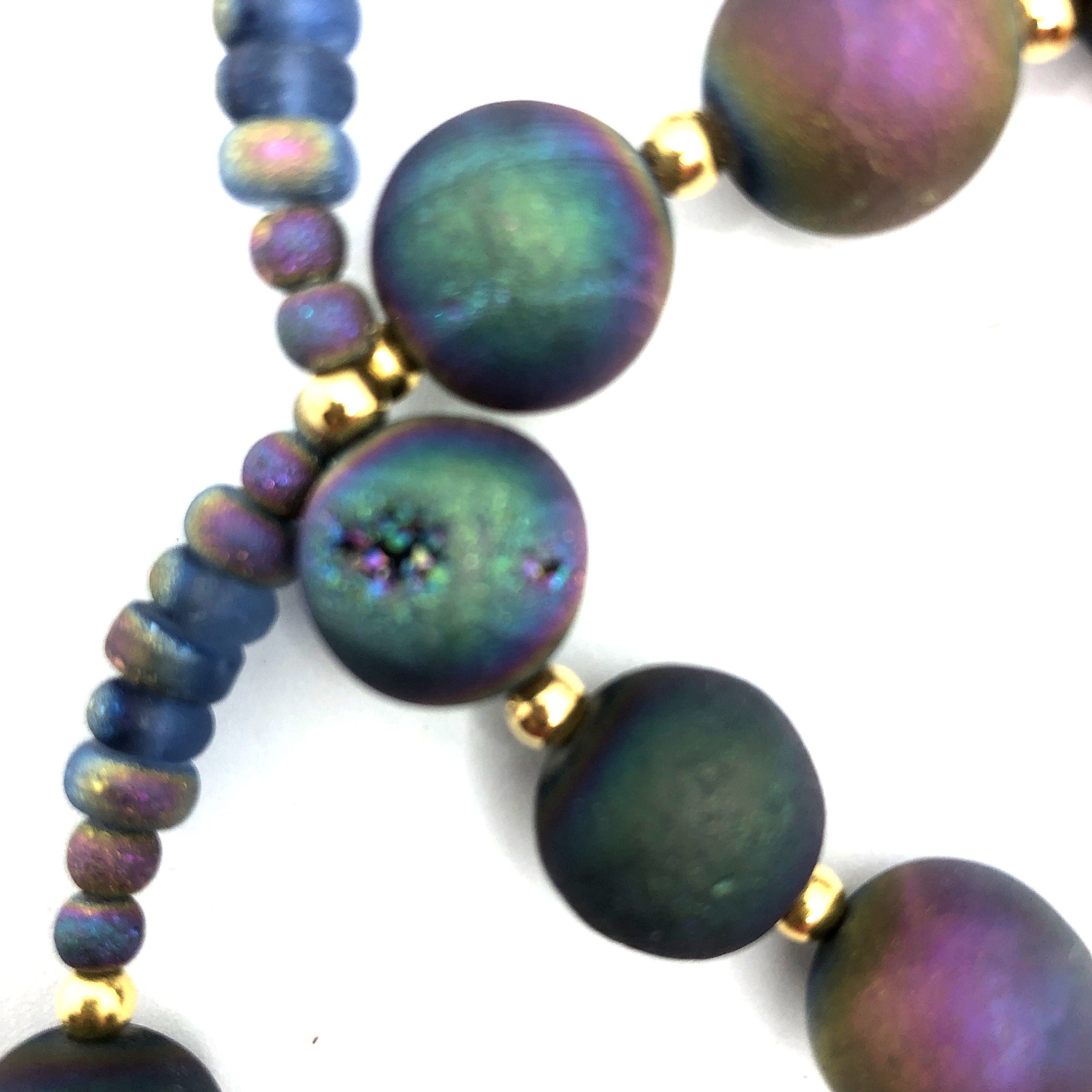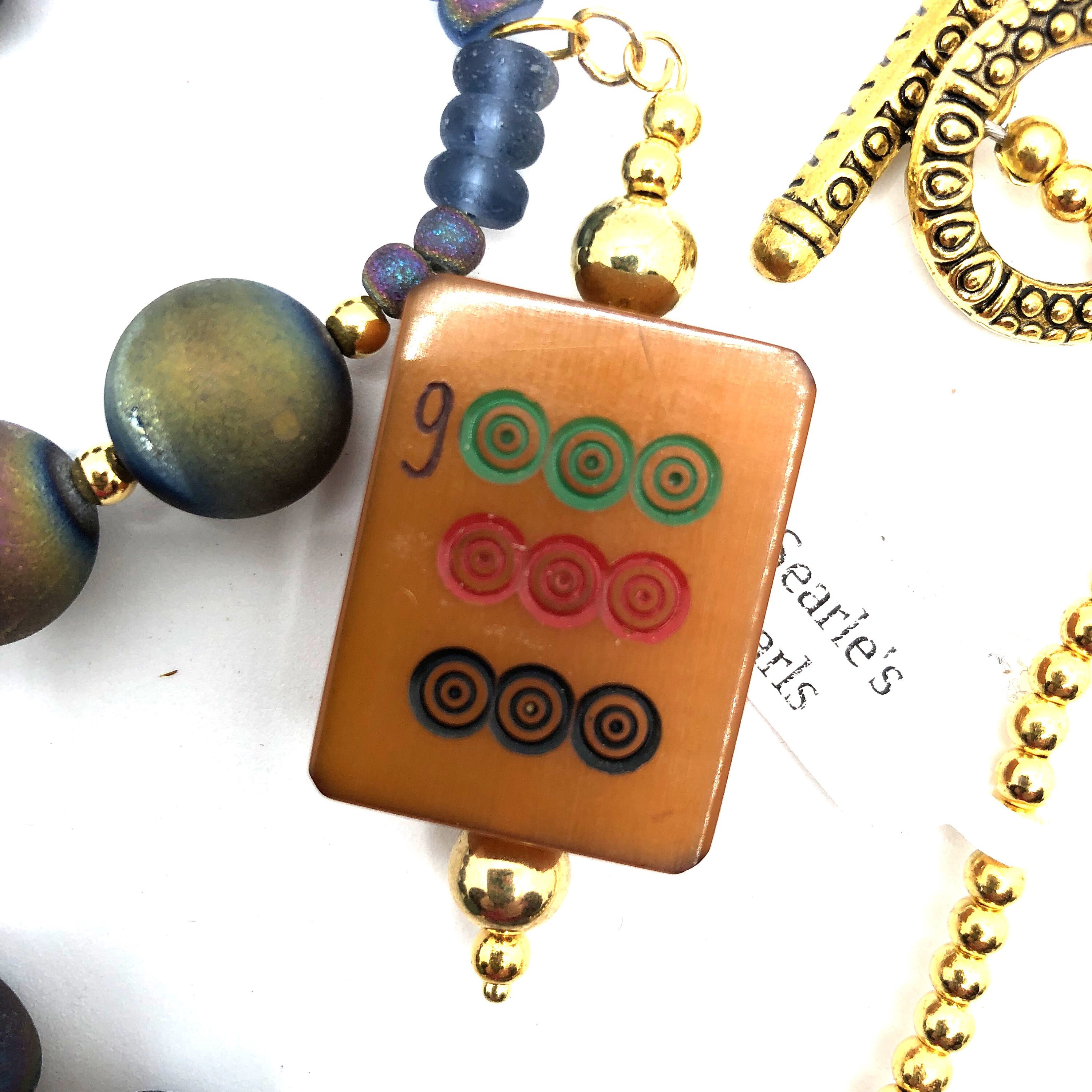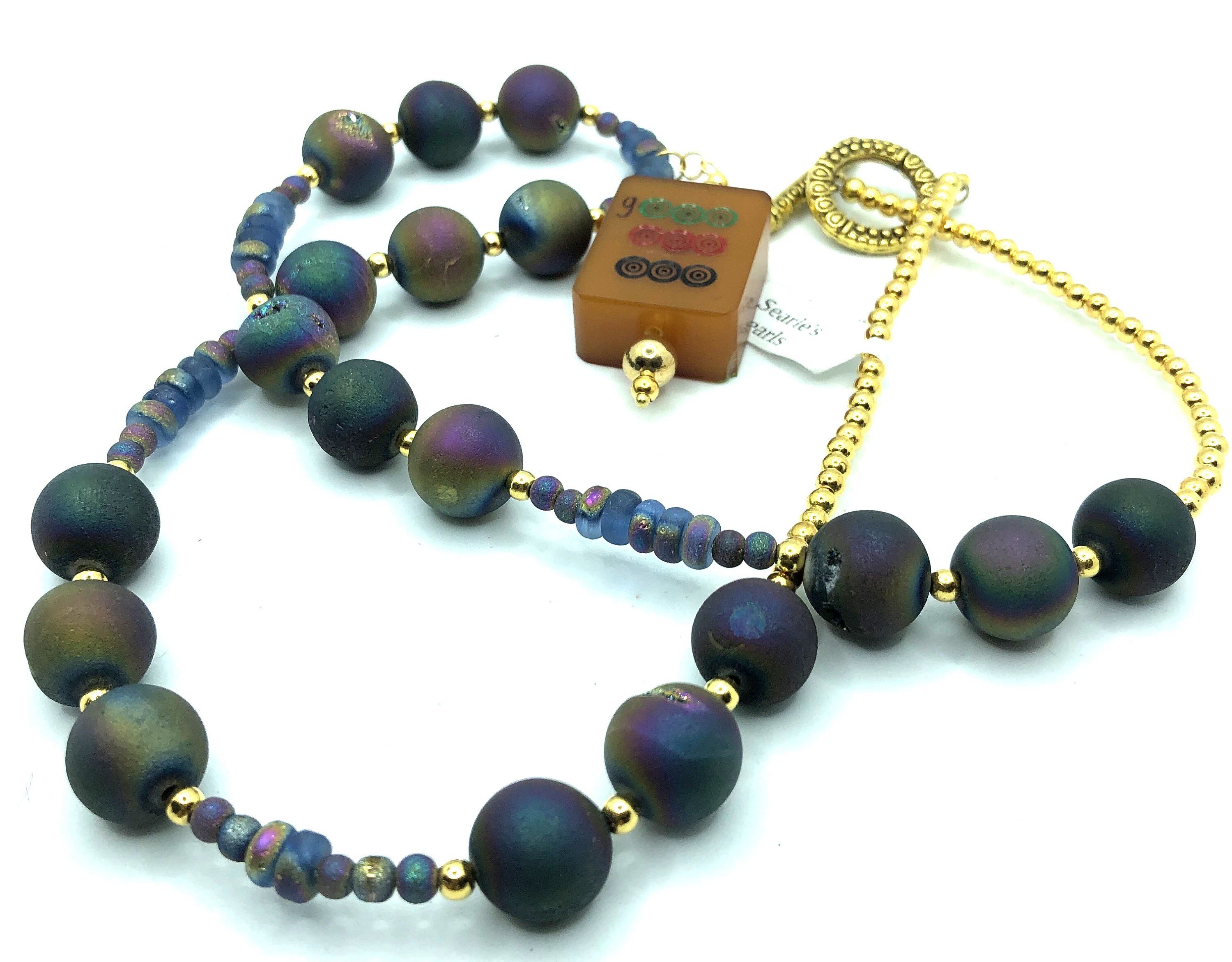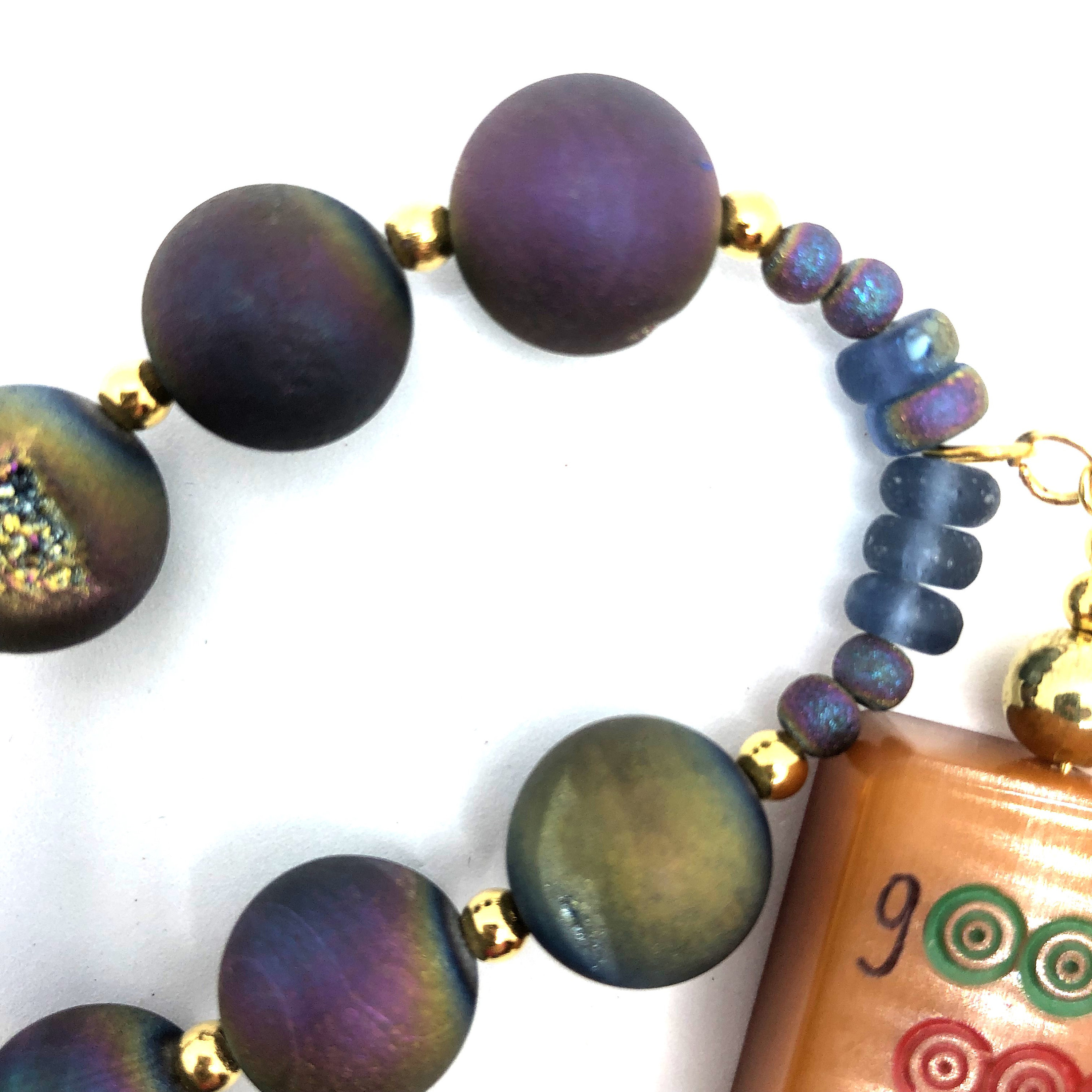 28" necklace made of purple/blue/green/gray druzy agates interspersed with glass and golden beads. The pendant has a 9 dot Bakelite antique tile and golden beads.