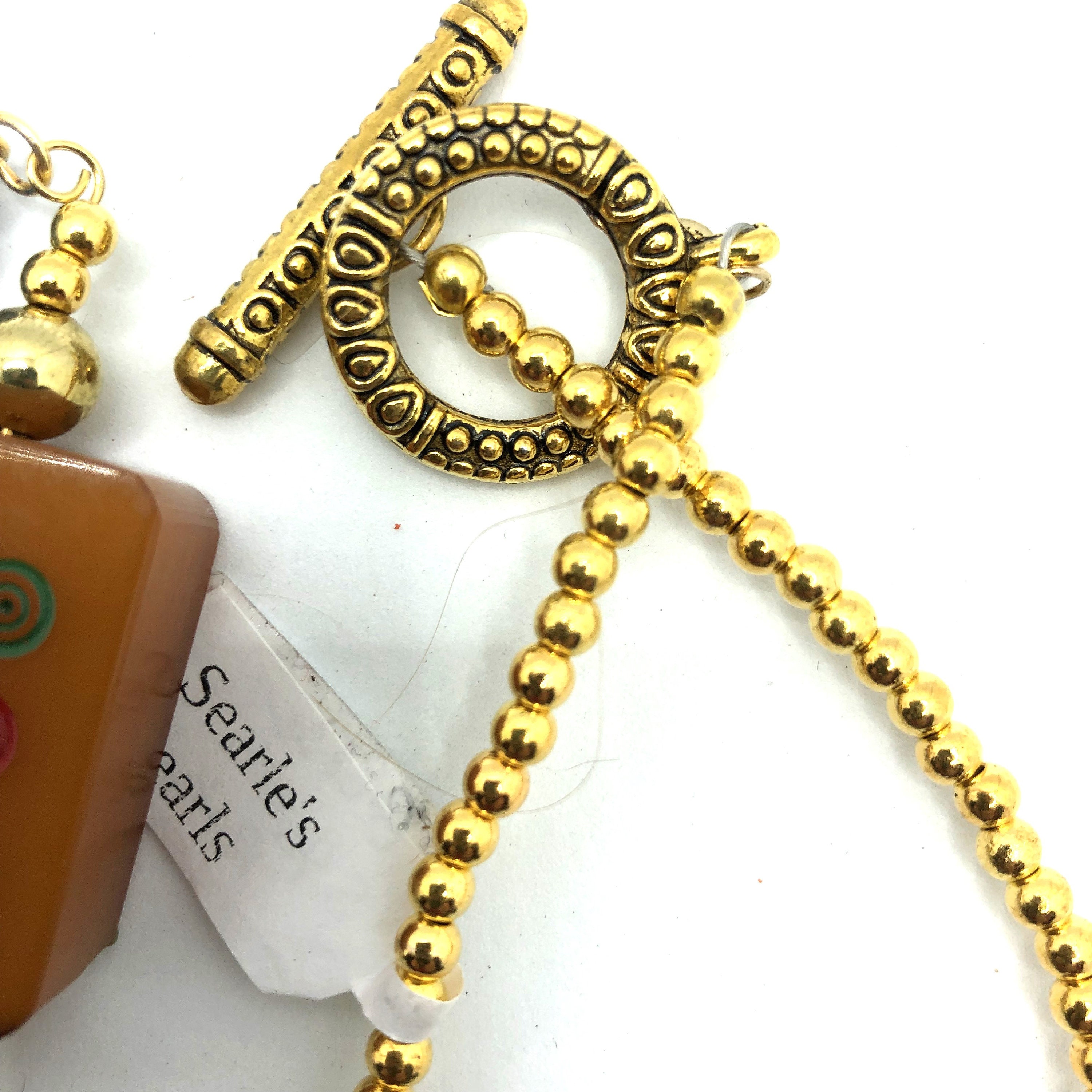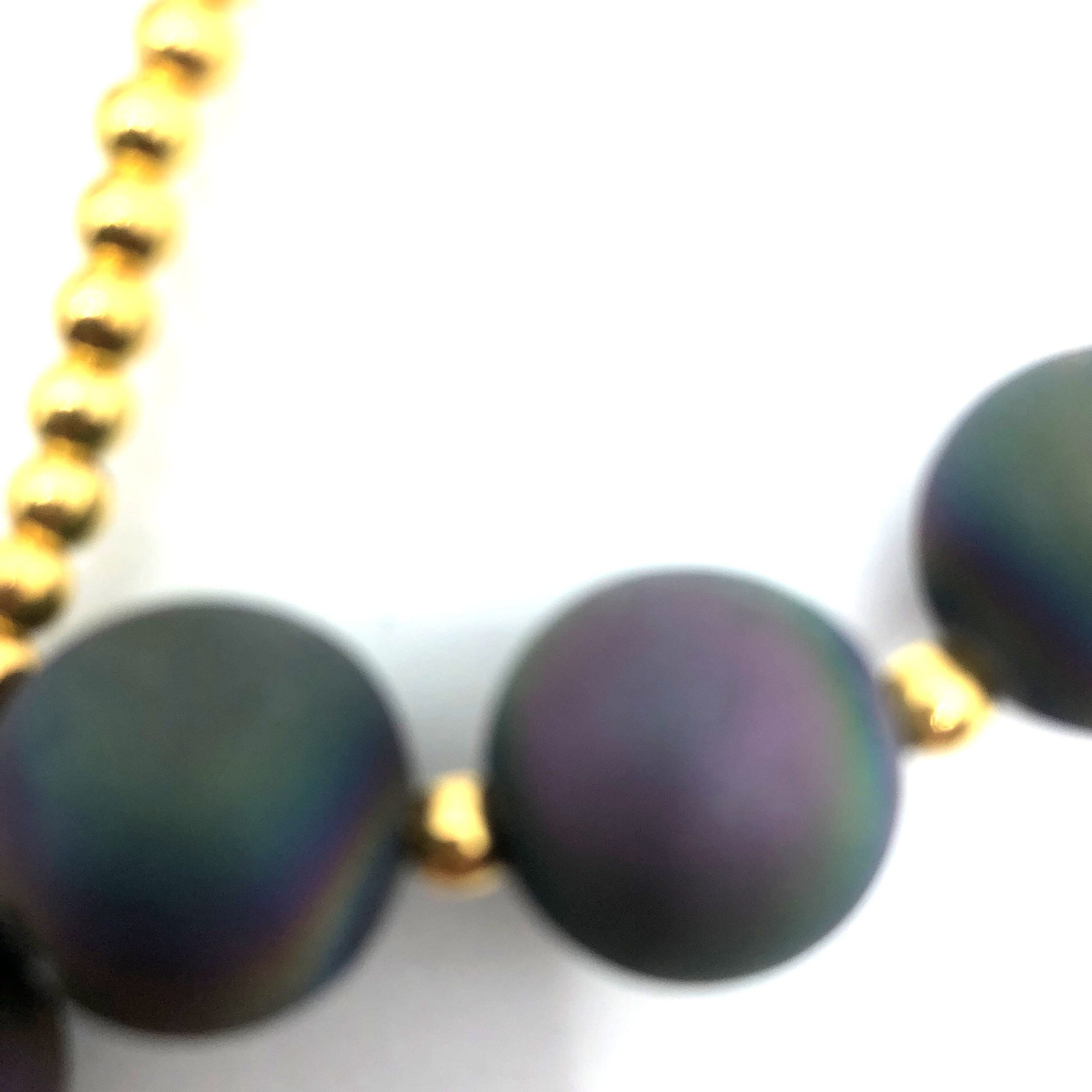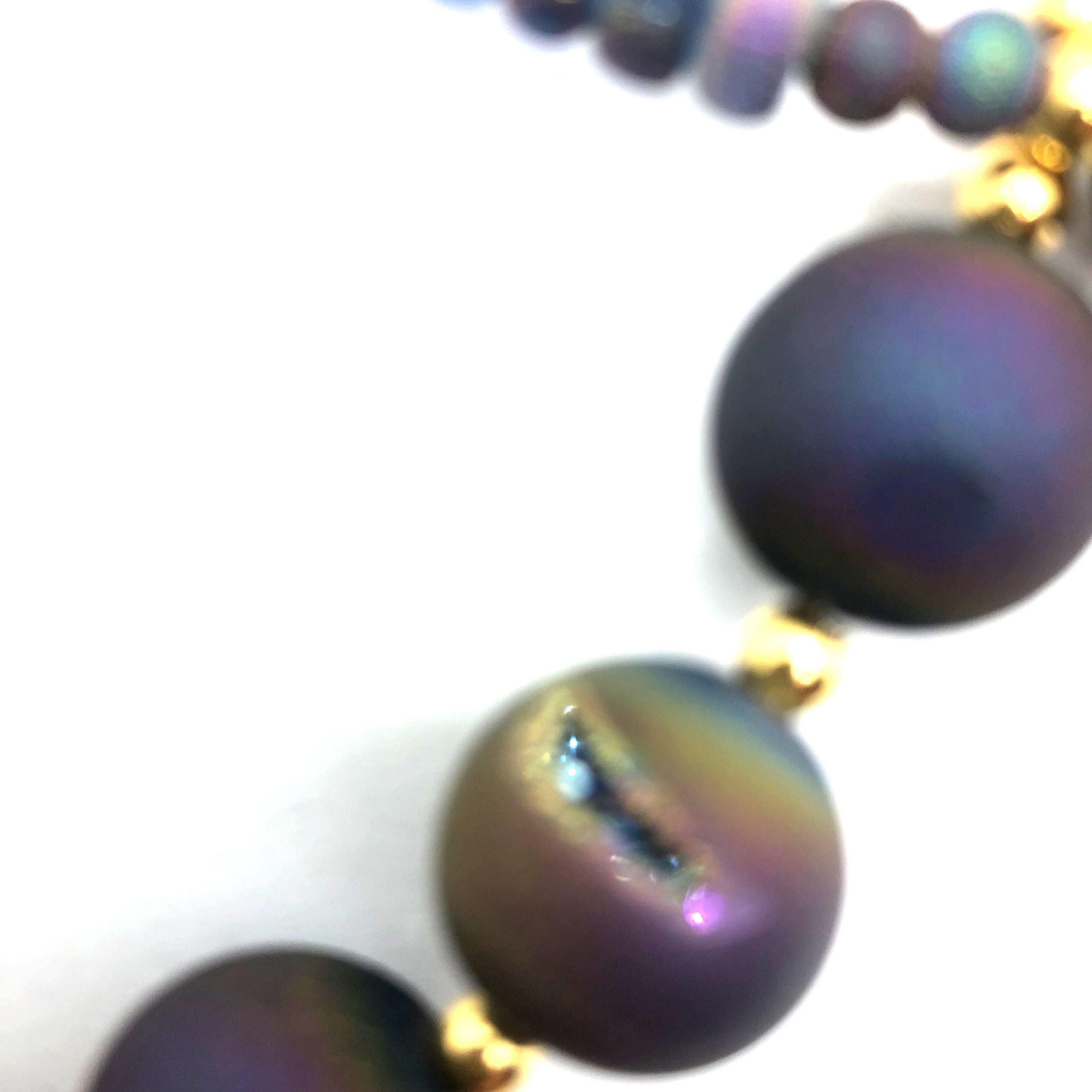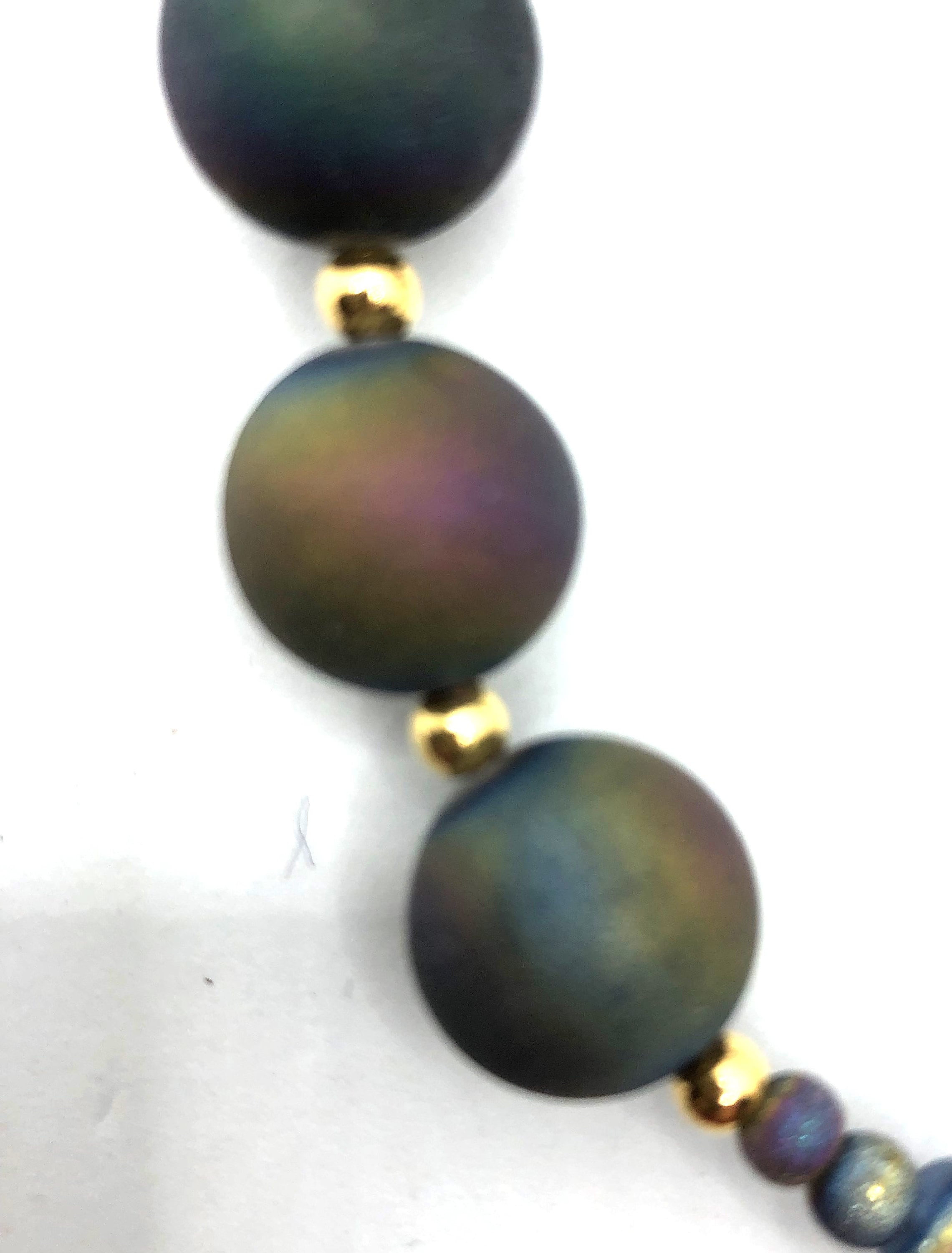 28" necklace made of purple/blue/green/gray druzy agates interspersed with glass and golden beads. The pendant has a 9 dot Bakelite antique tile and golden beads.