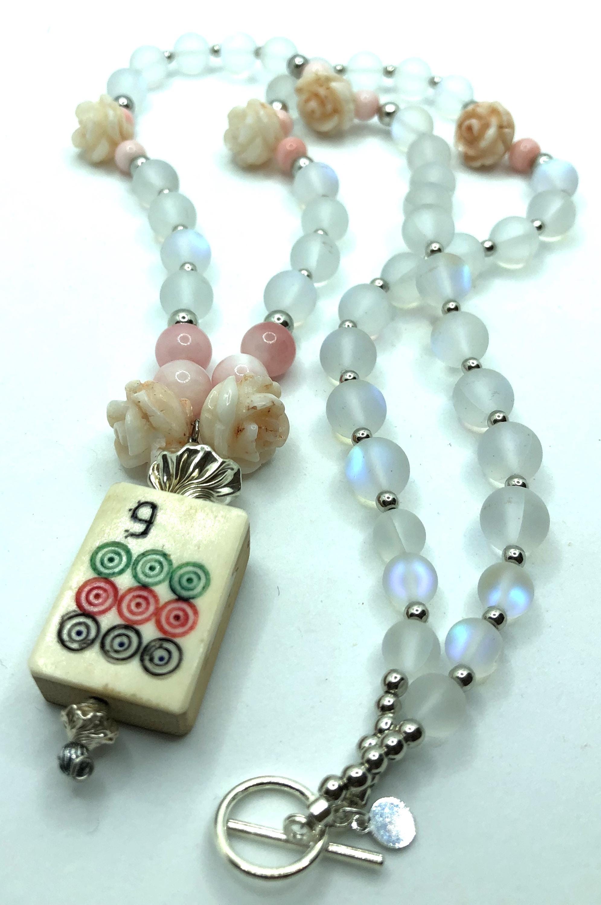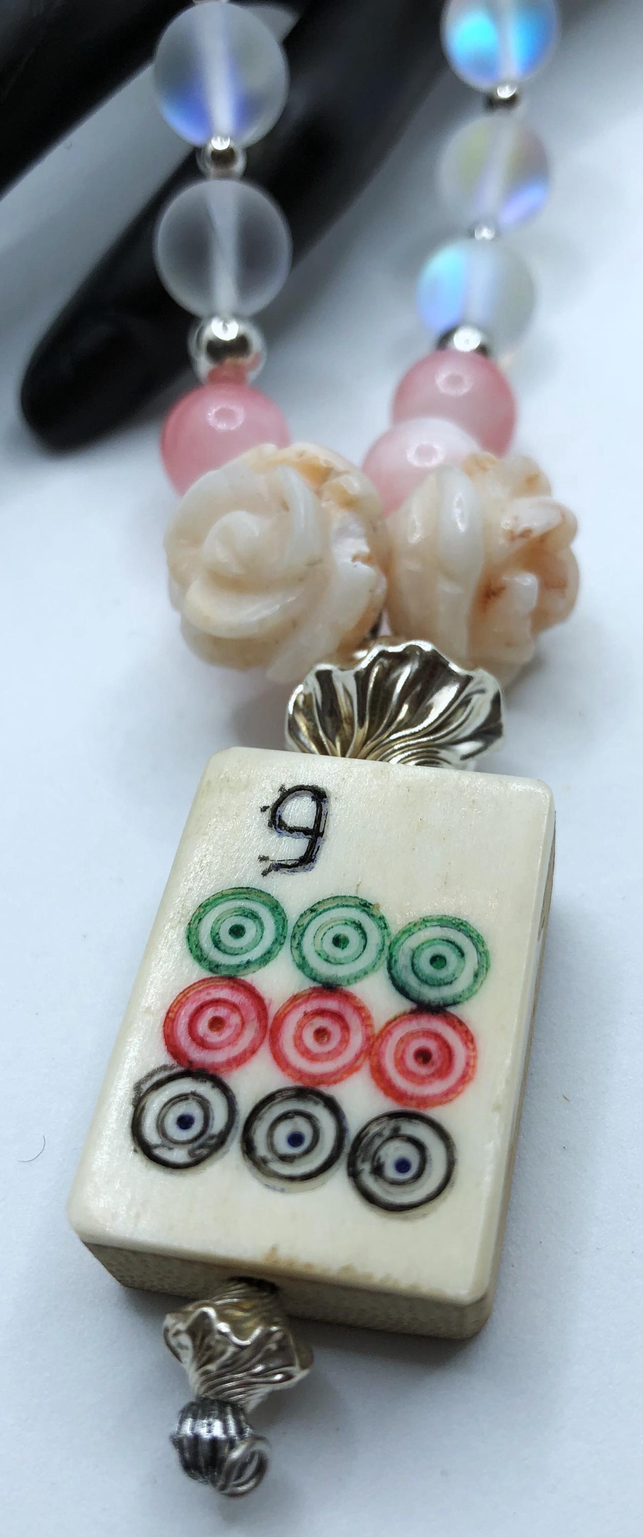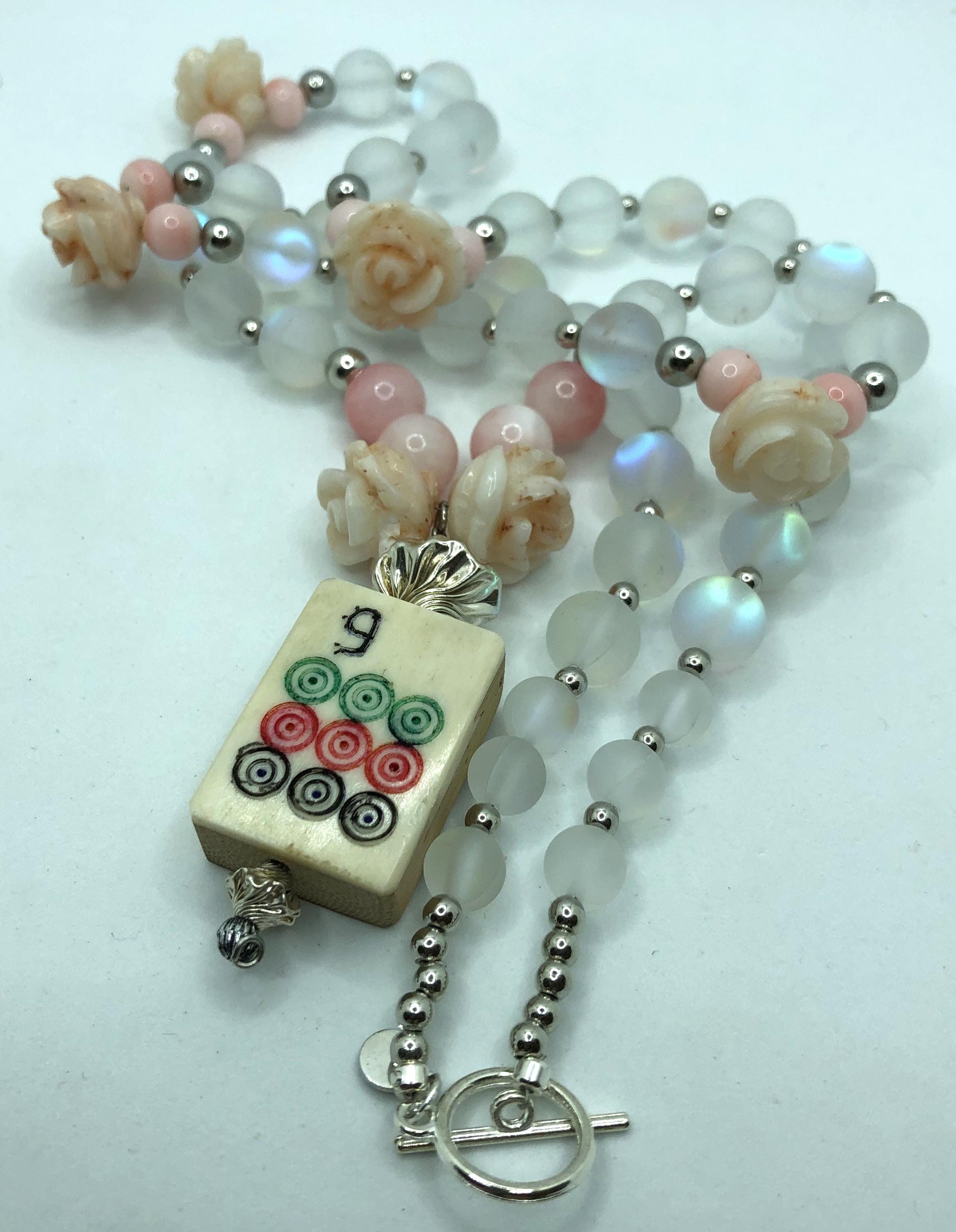 This 33" moonstone necklace has small silver and pink beads with 6 small roses and an old, antique , hand-painted 9 dot mahjong tile with toggle clasp.