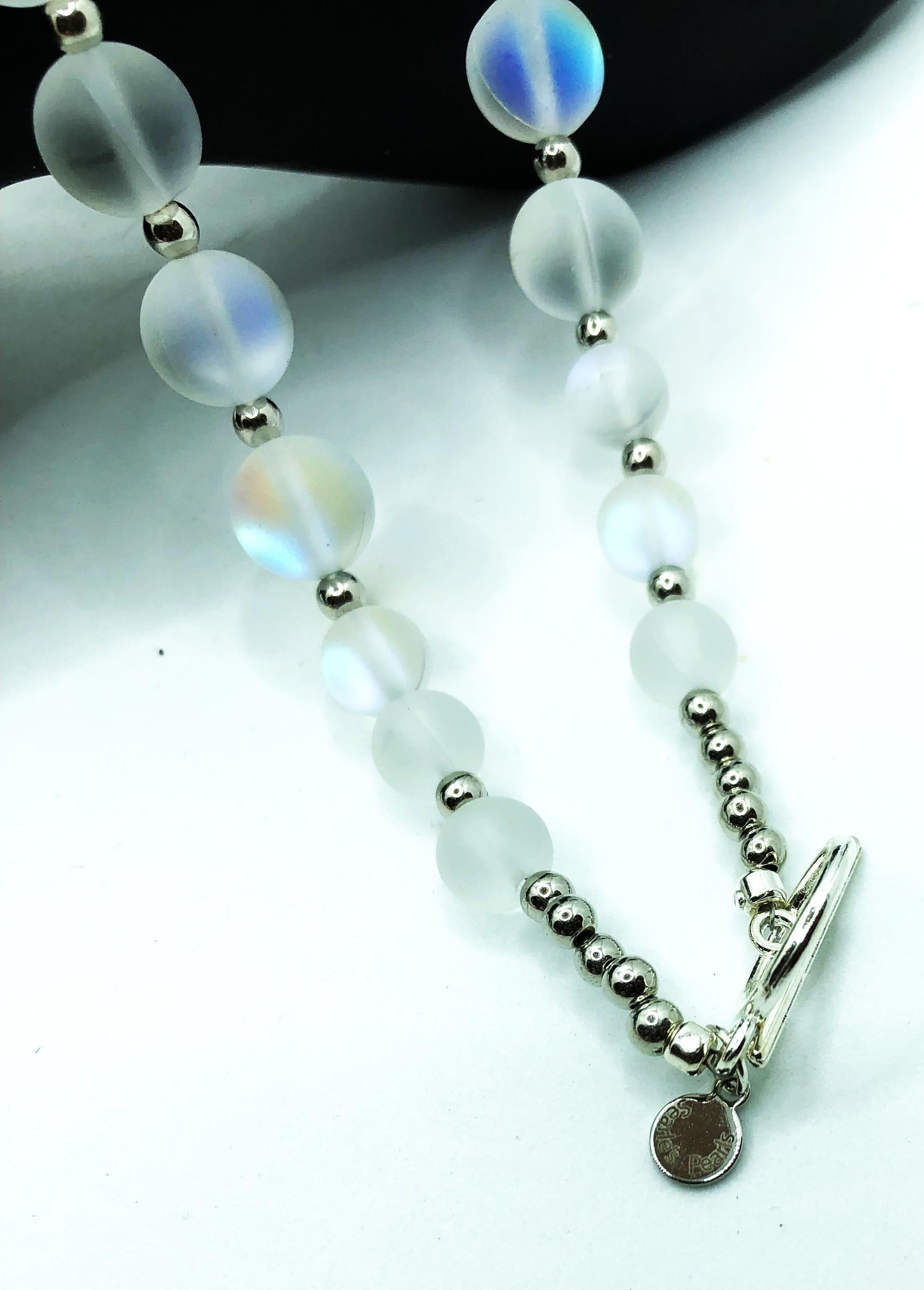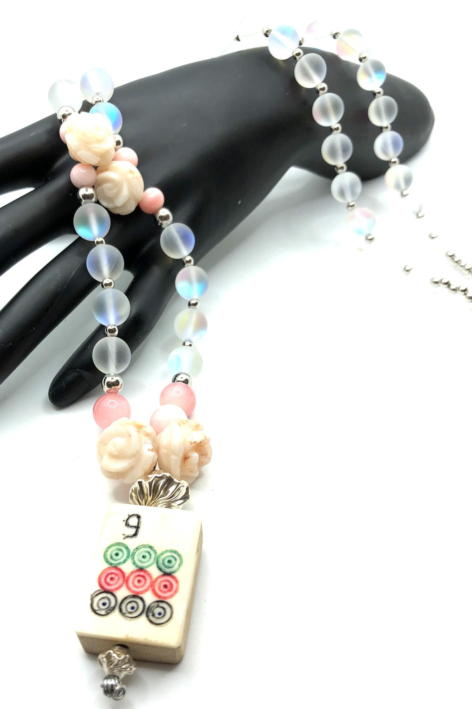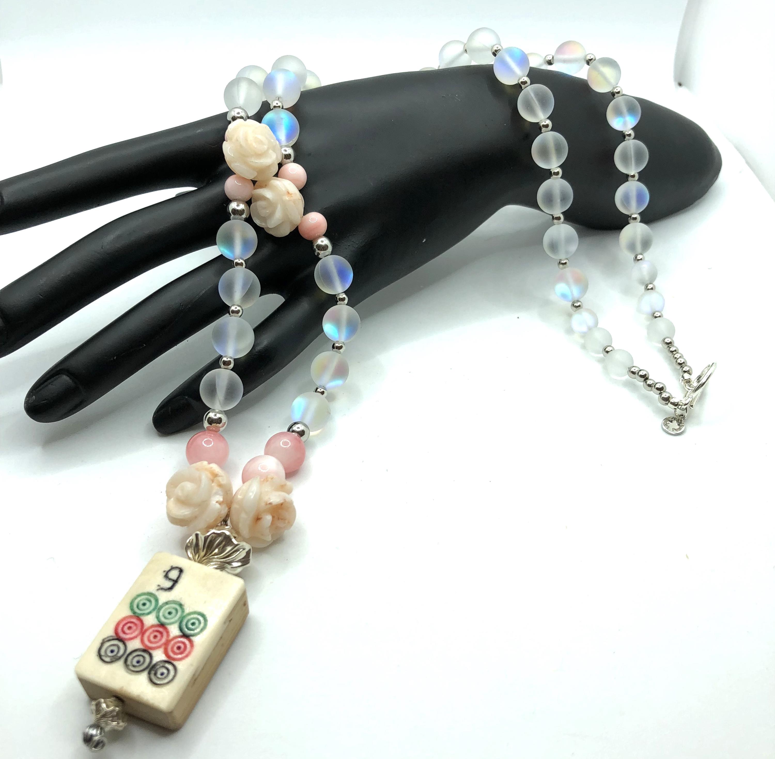 This 33" moonstone necklace has small silver and pink beads with 6 small roses and an old, antique , hand-painted 9 dot mahjong tile with toggle clasp.