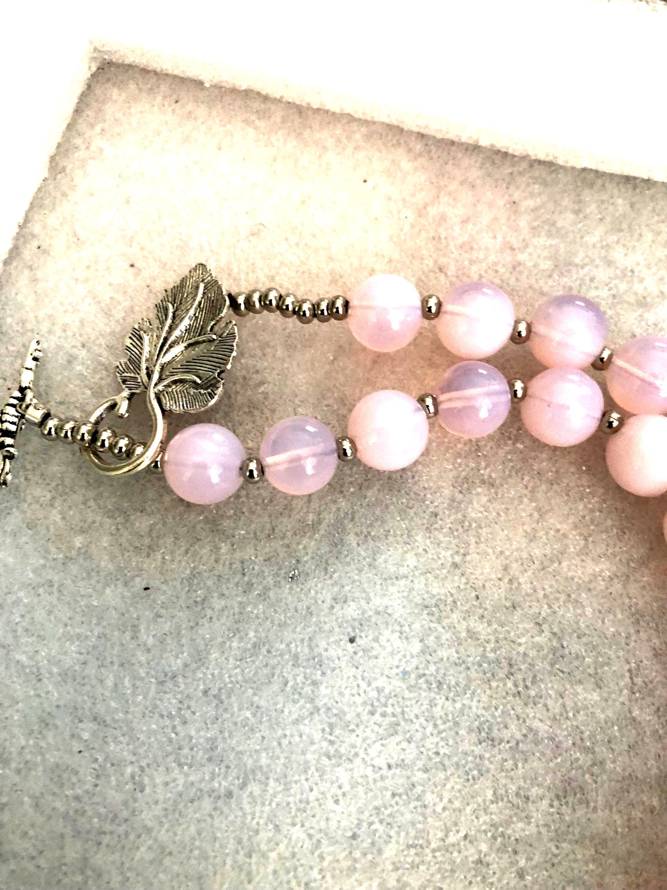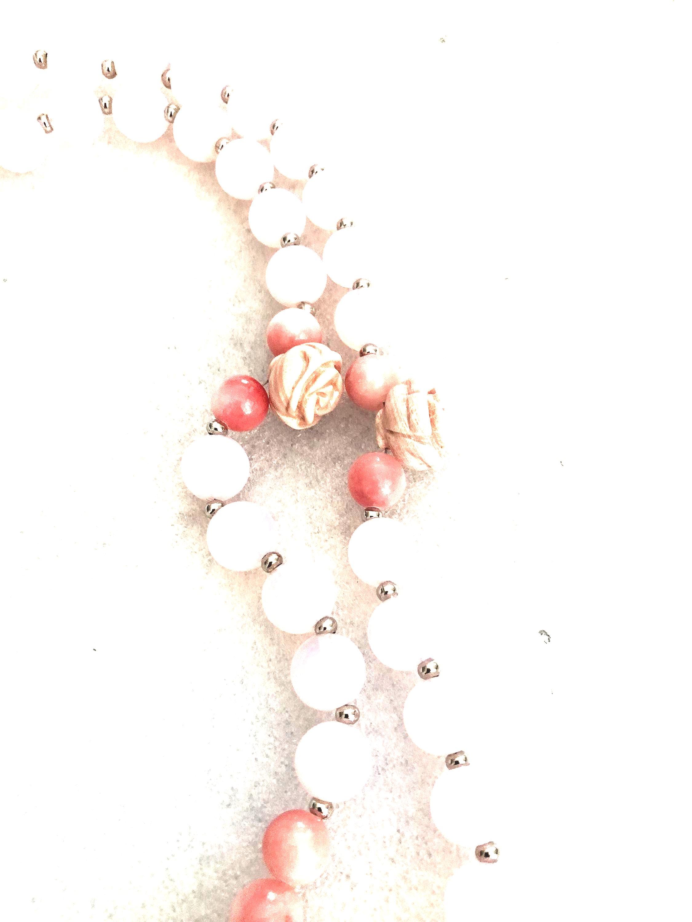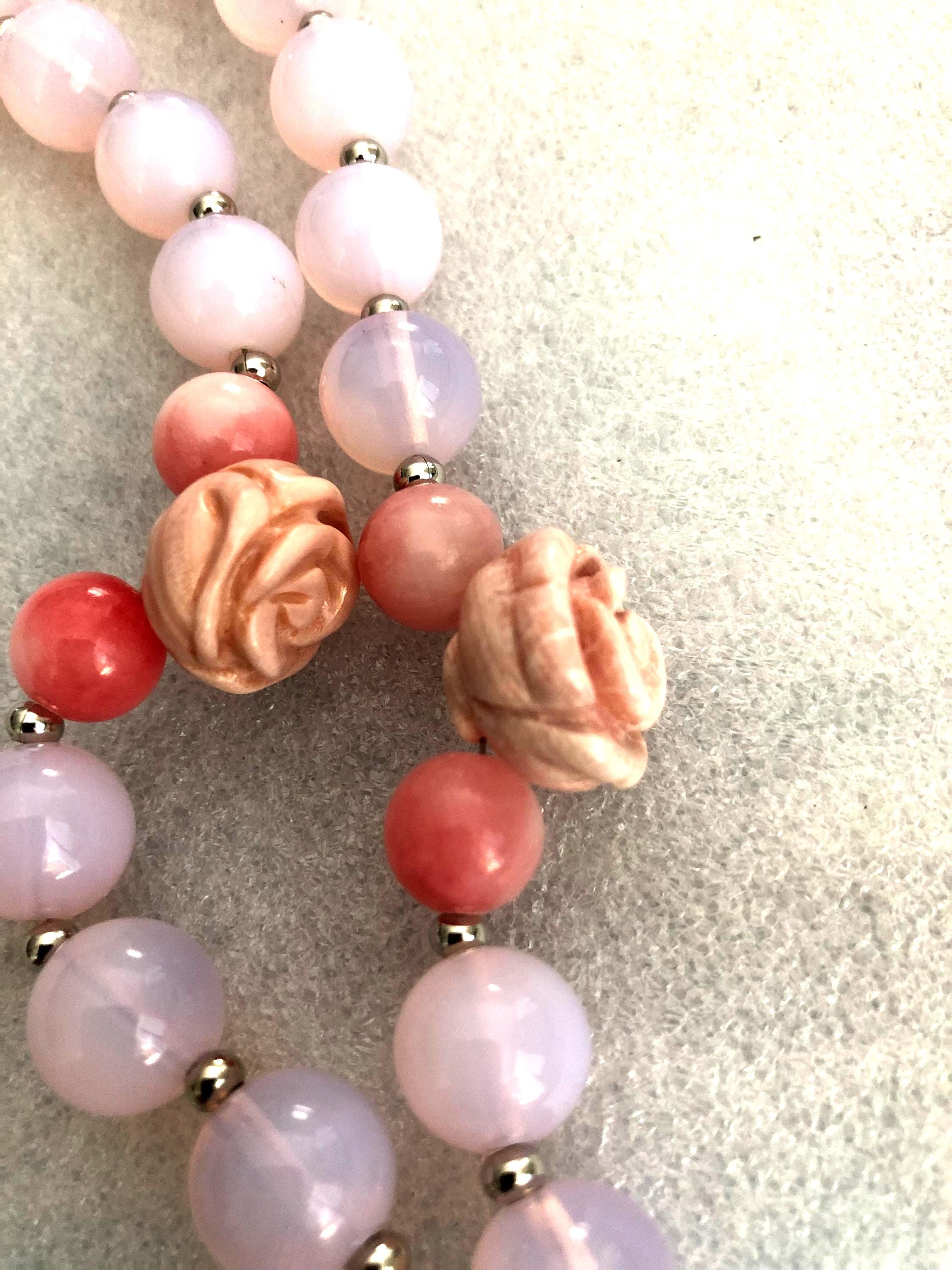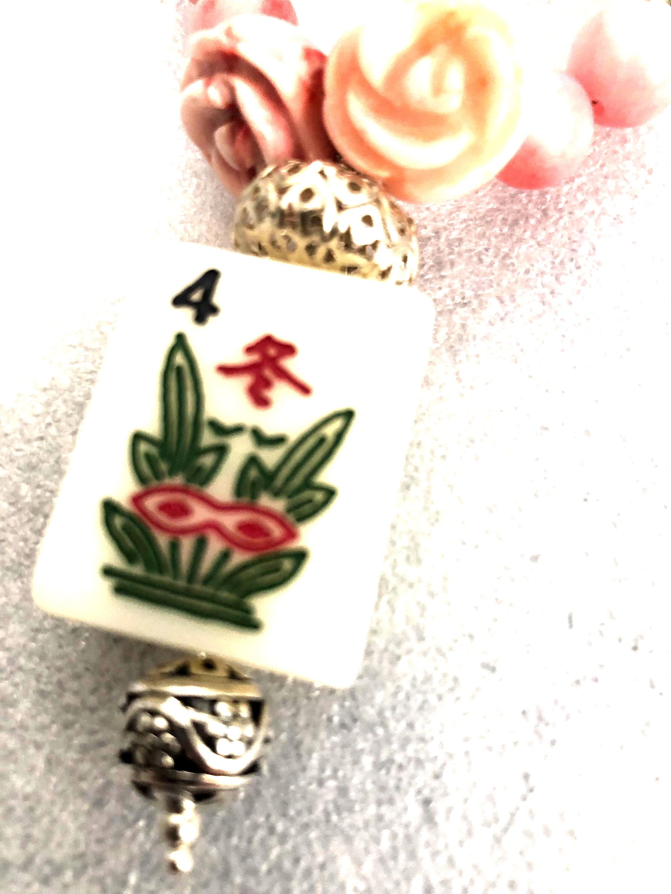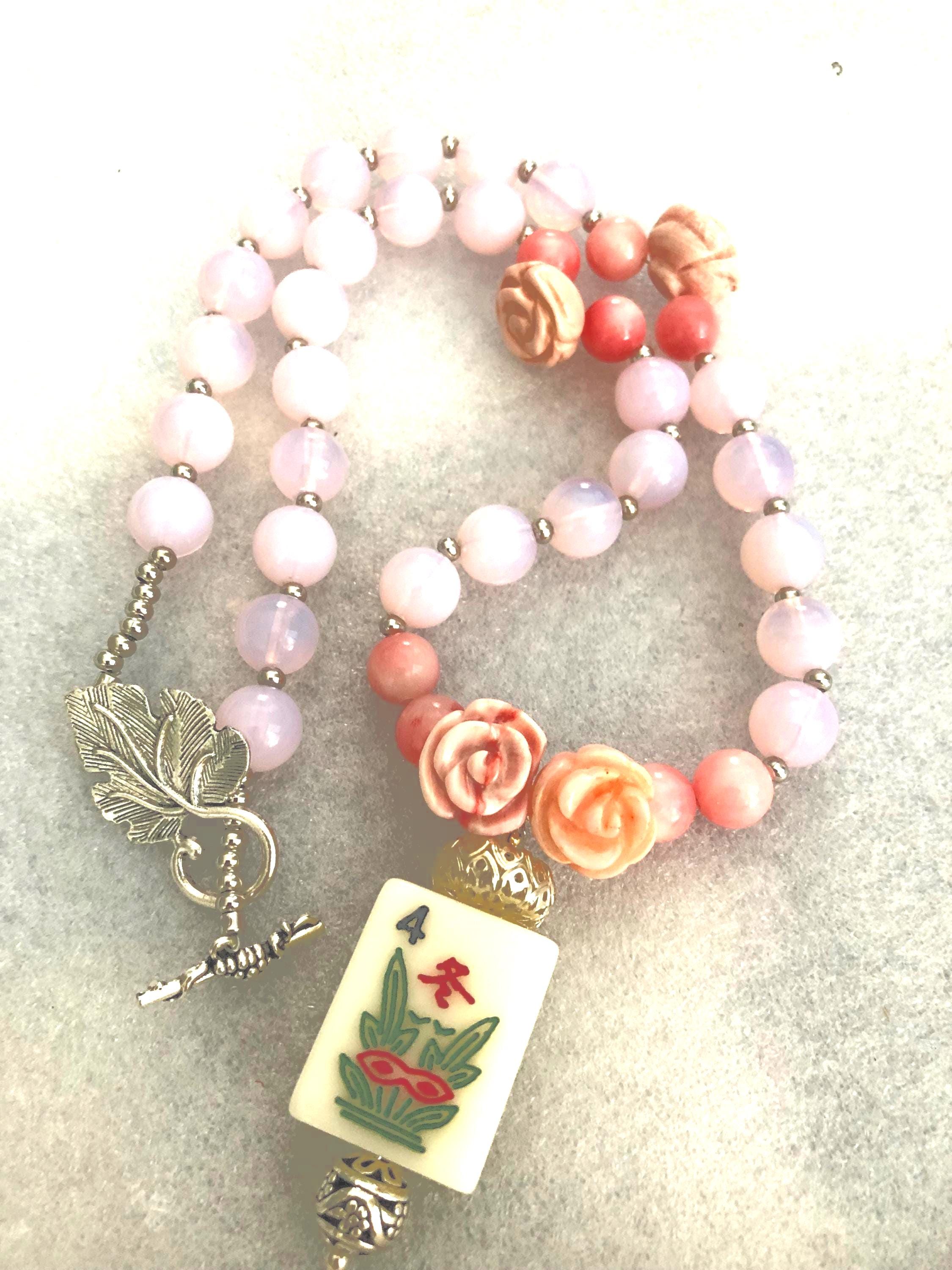 This 25" opal necklace has small silver and pink beads with 6 small roses and 4 Flower mahjong tile with toggle clasp.