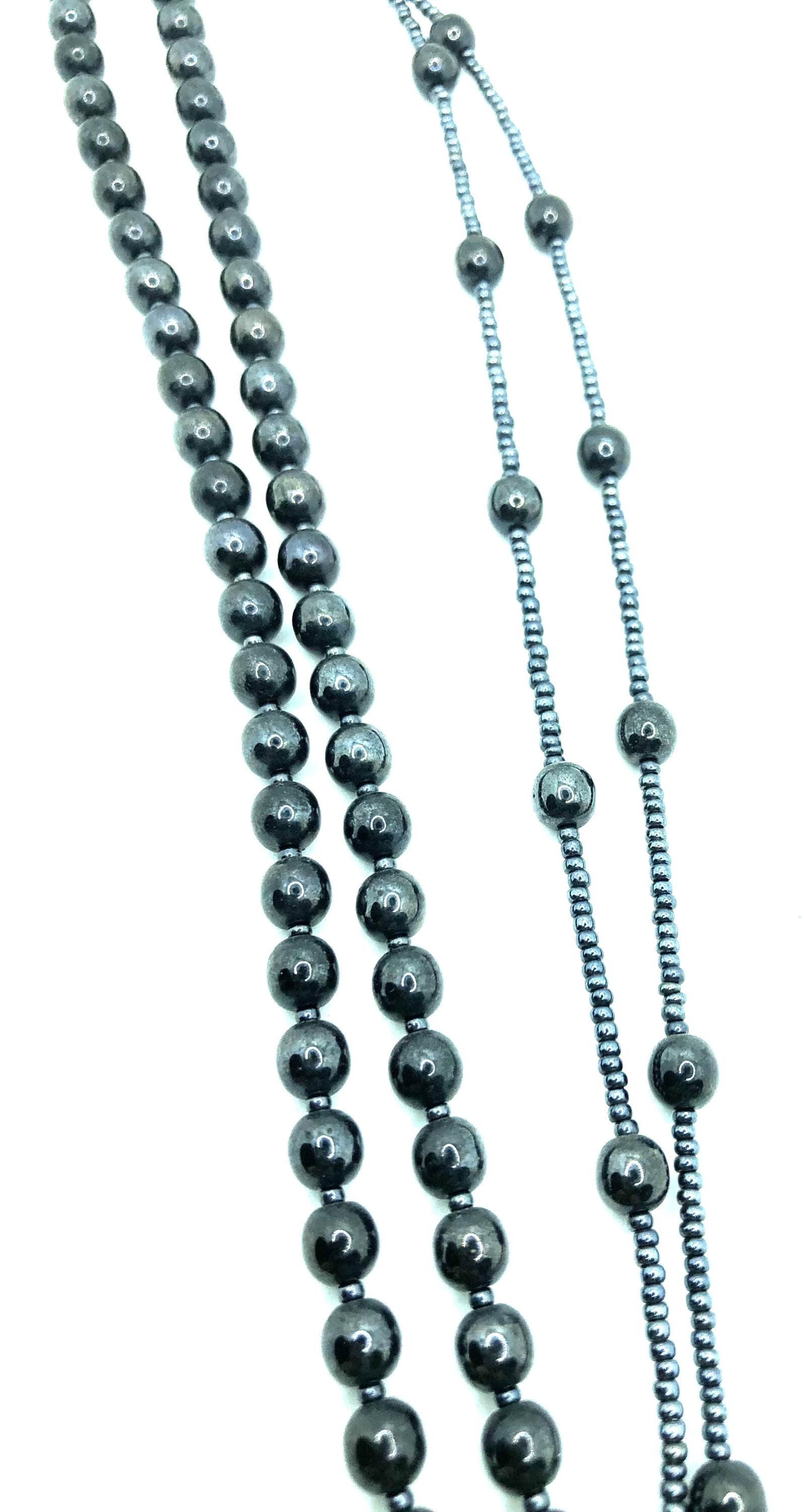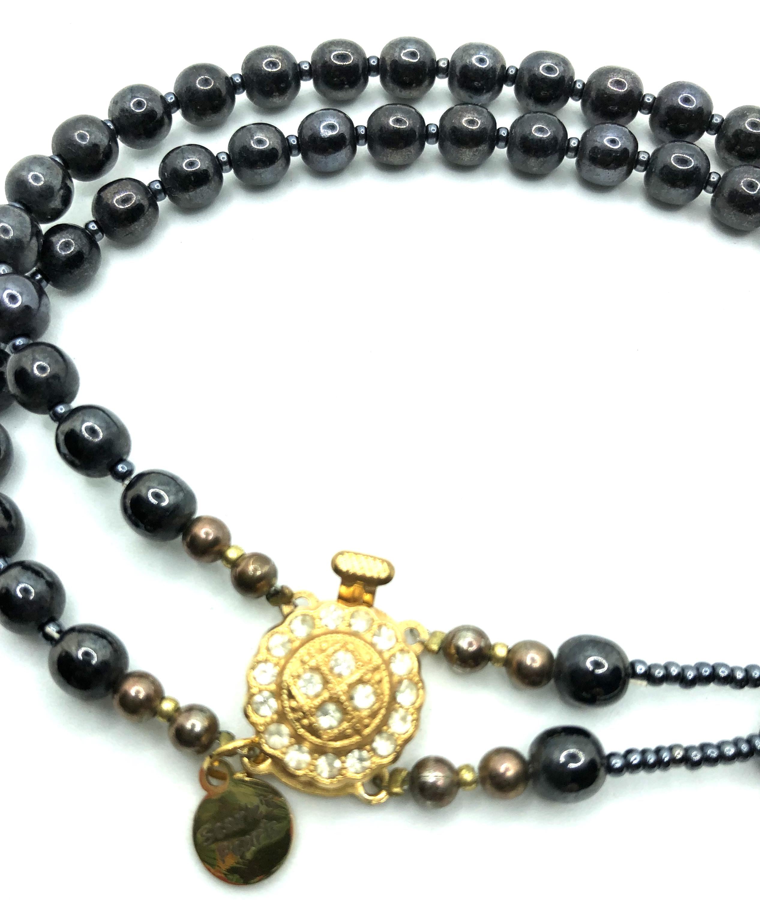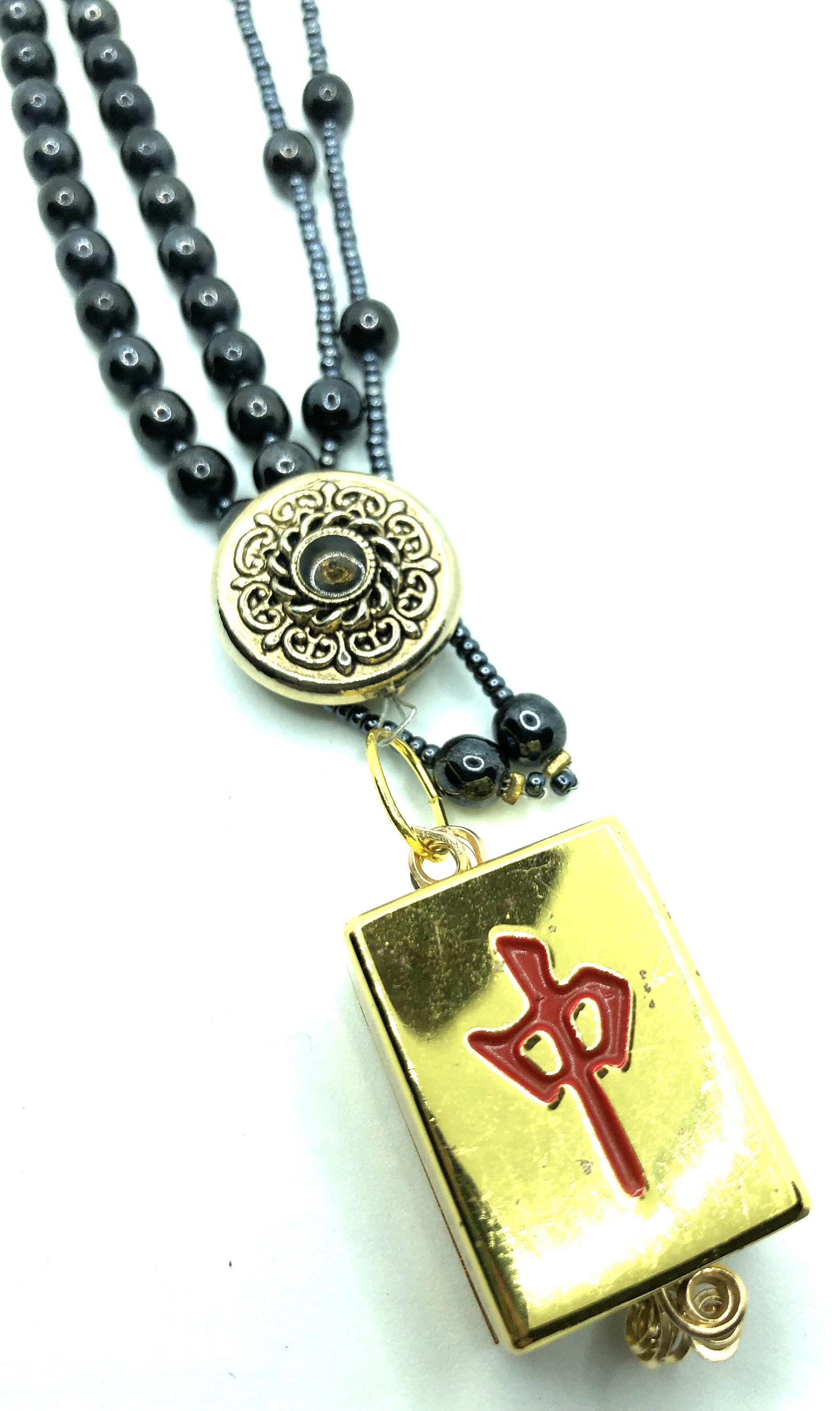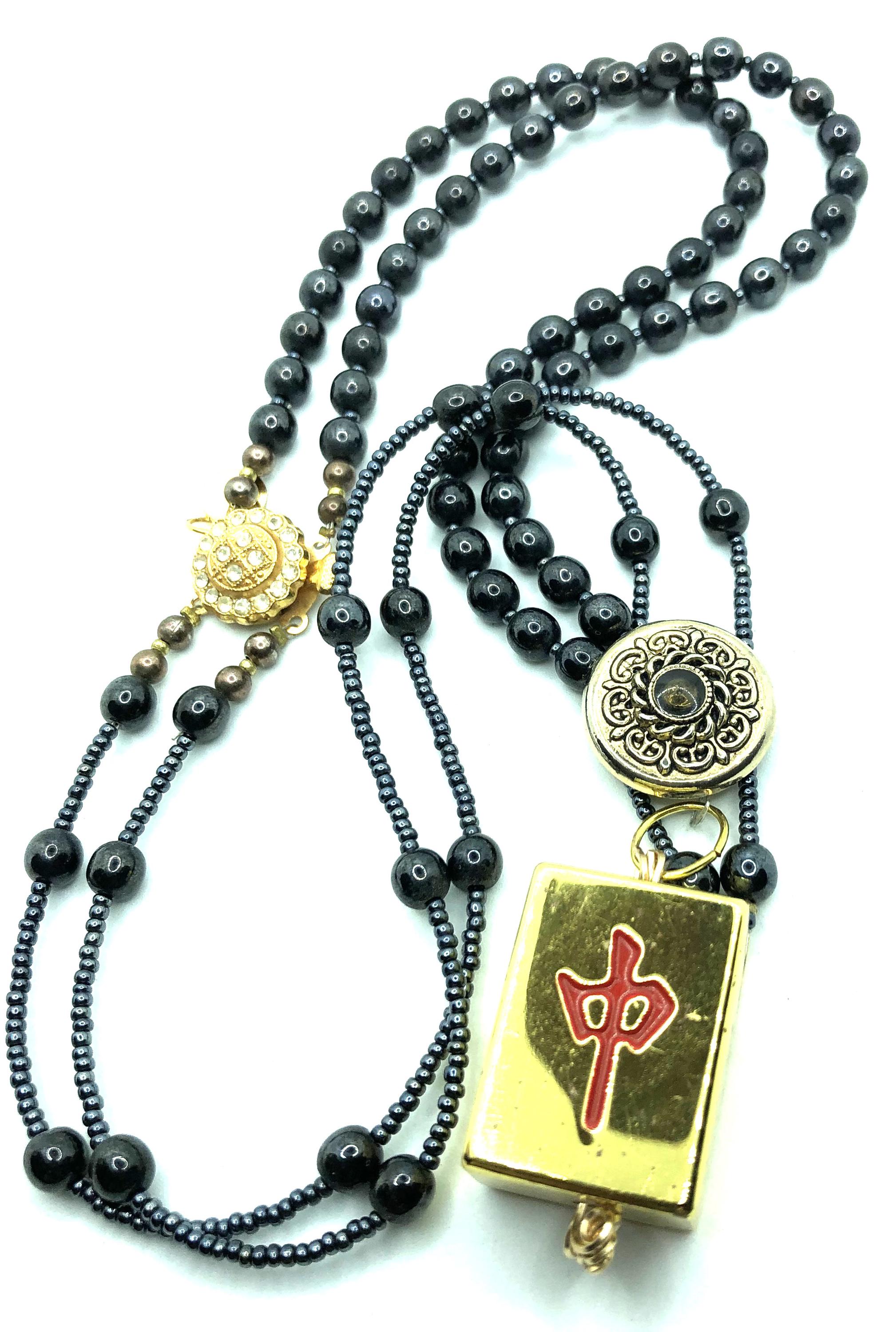 2. 20" double strand necklace with black onyx beads and red dragon, golden metal tile.