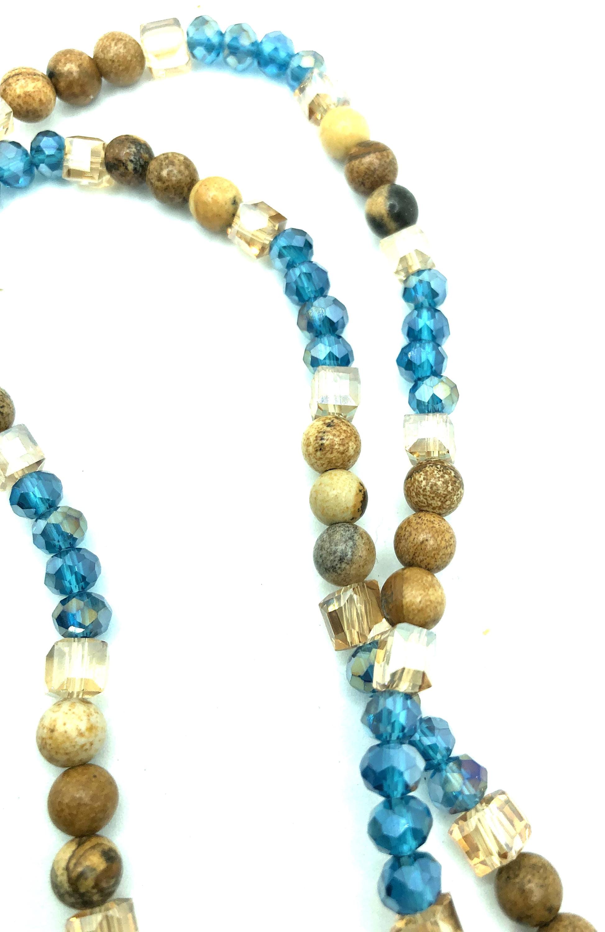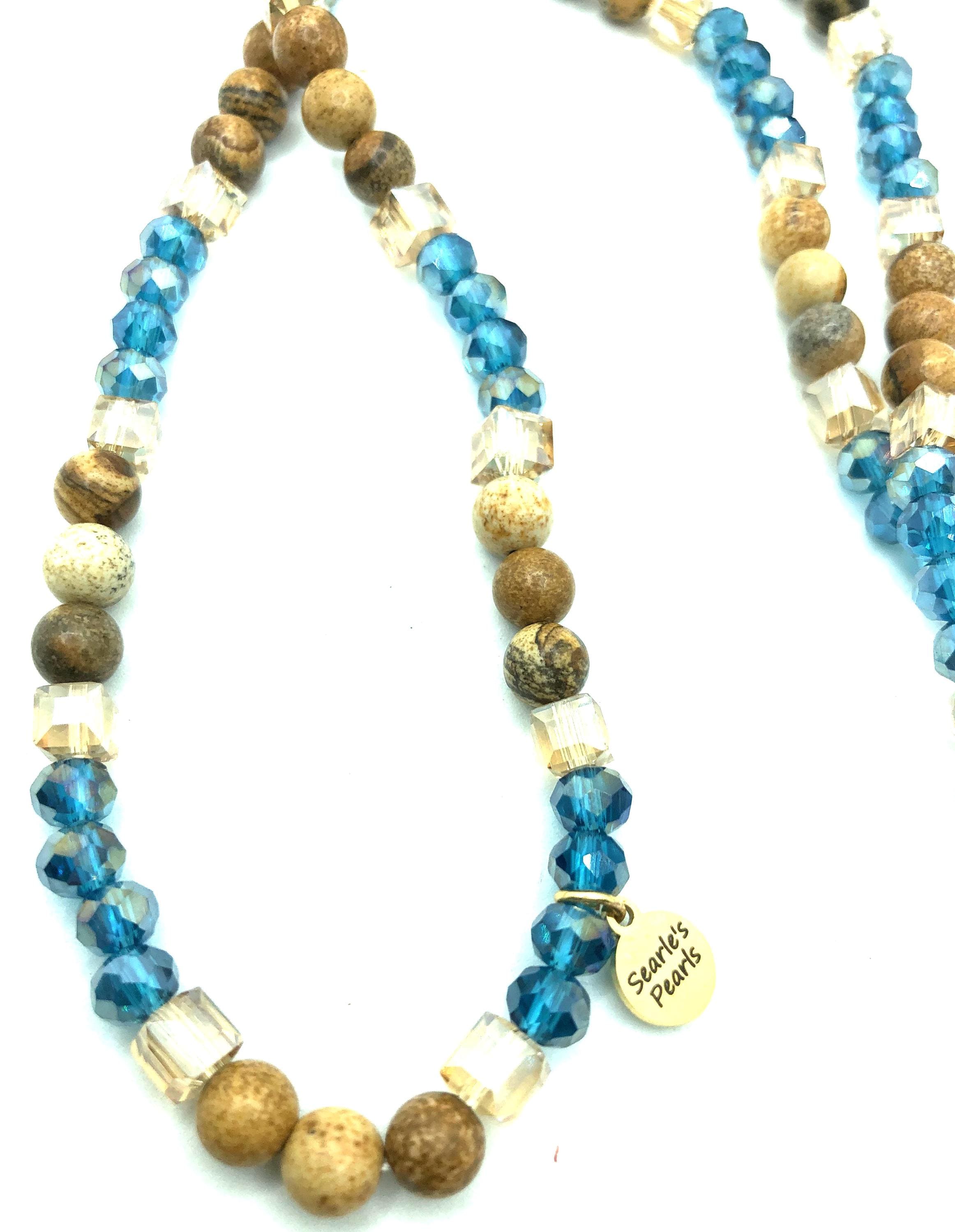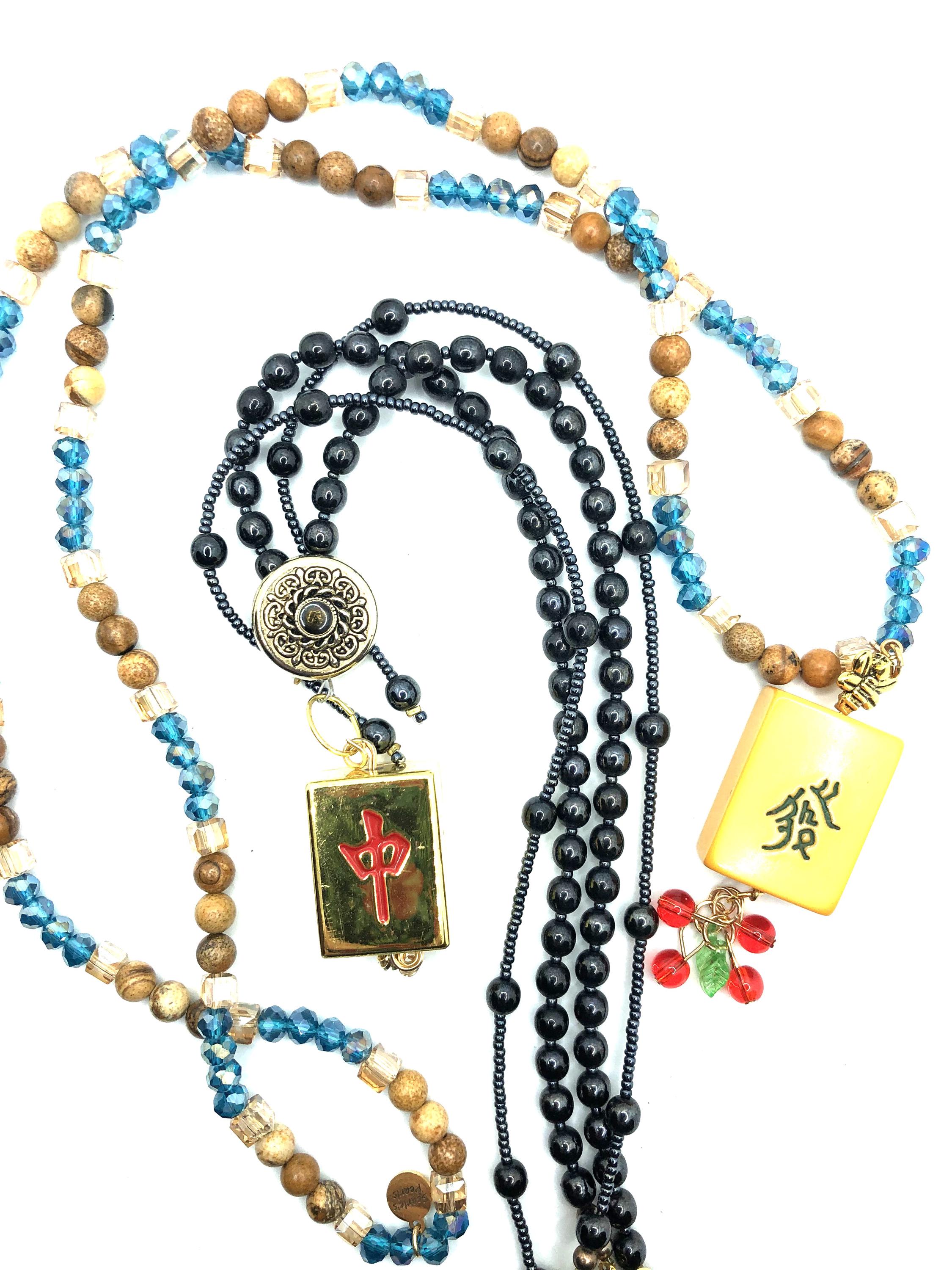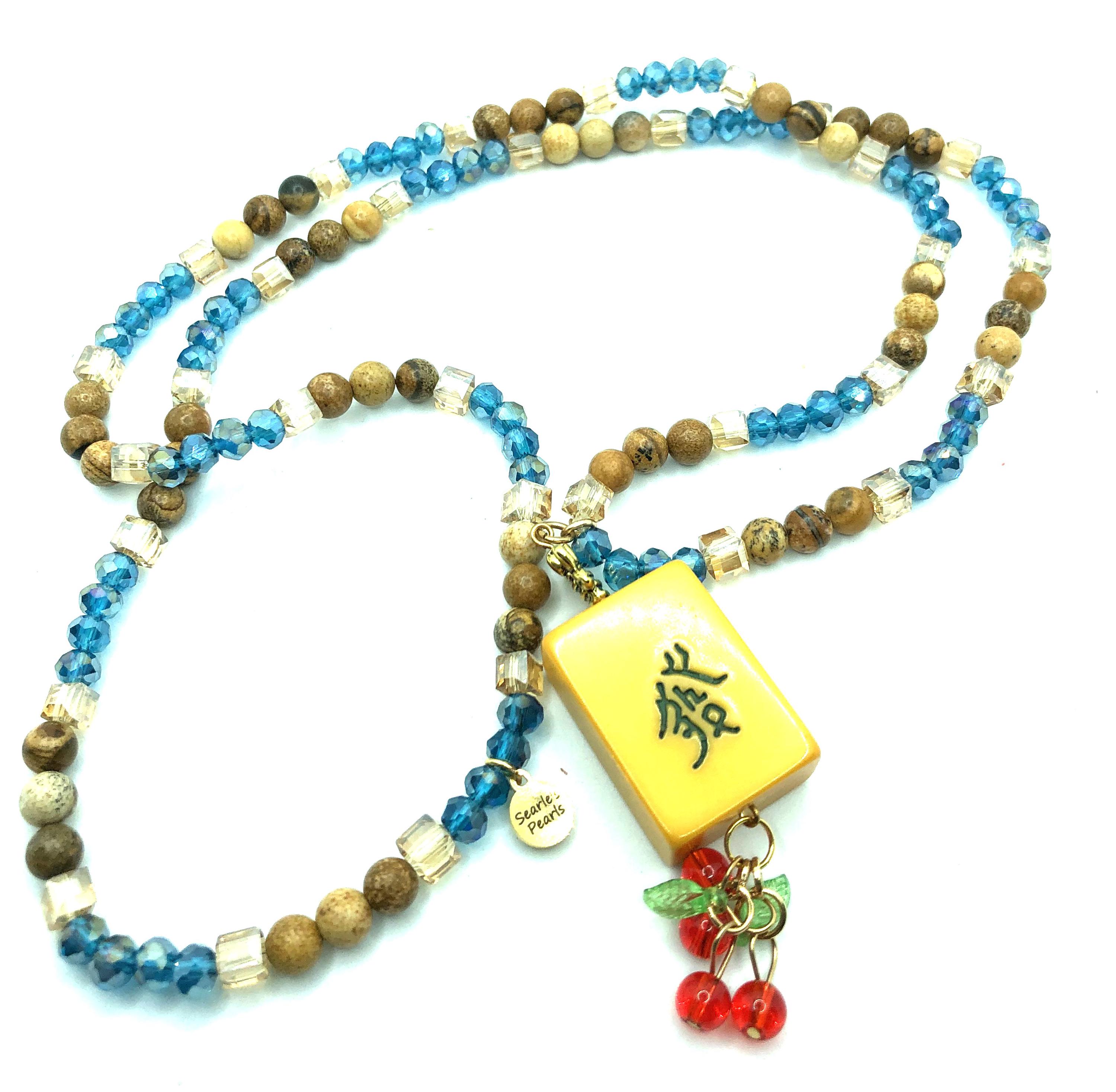 1. 32" crystal and wooden bead necklace with an antique Bakelite green dragon tile with a small honeybee charm and glass cherry dangle.