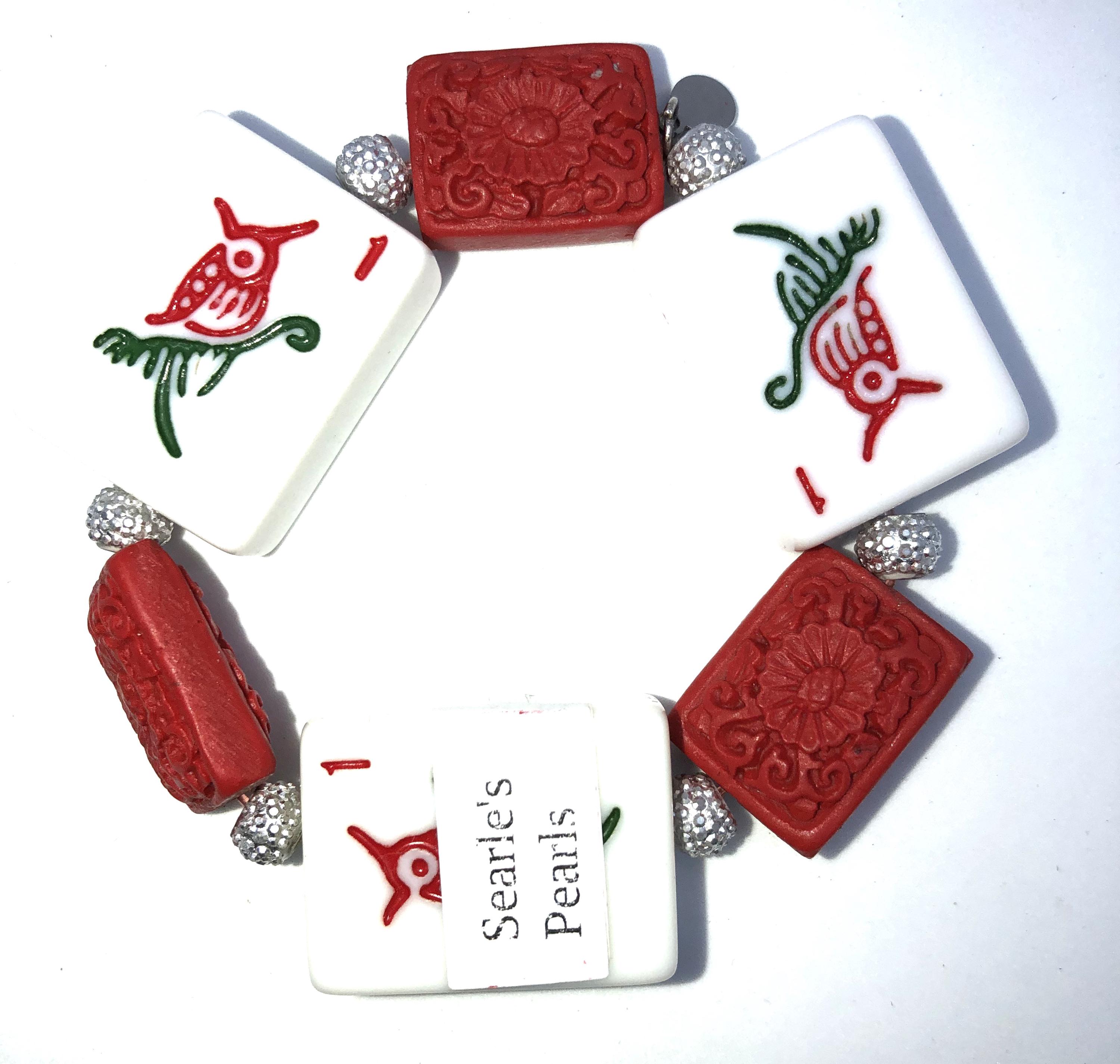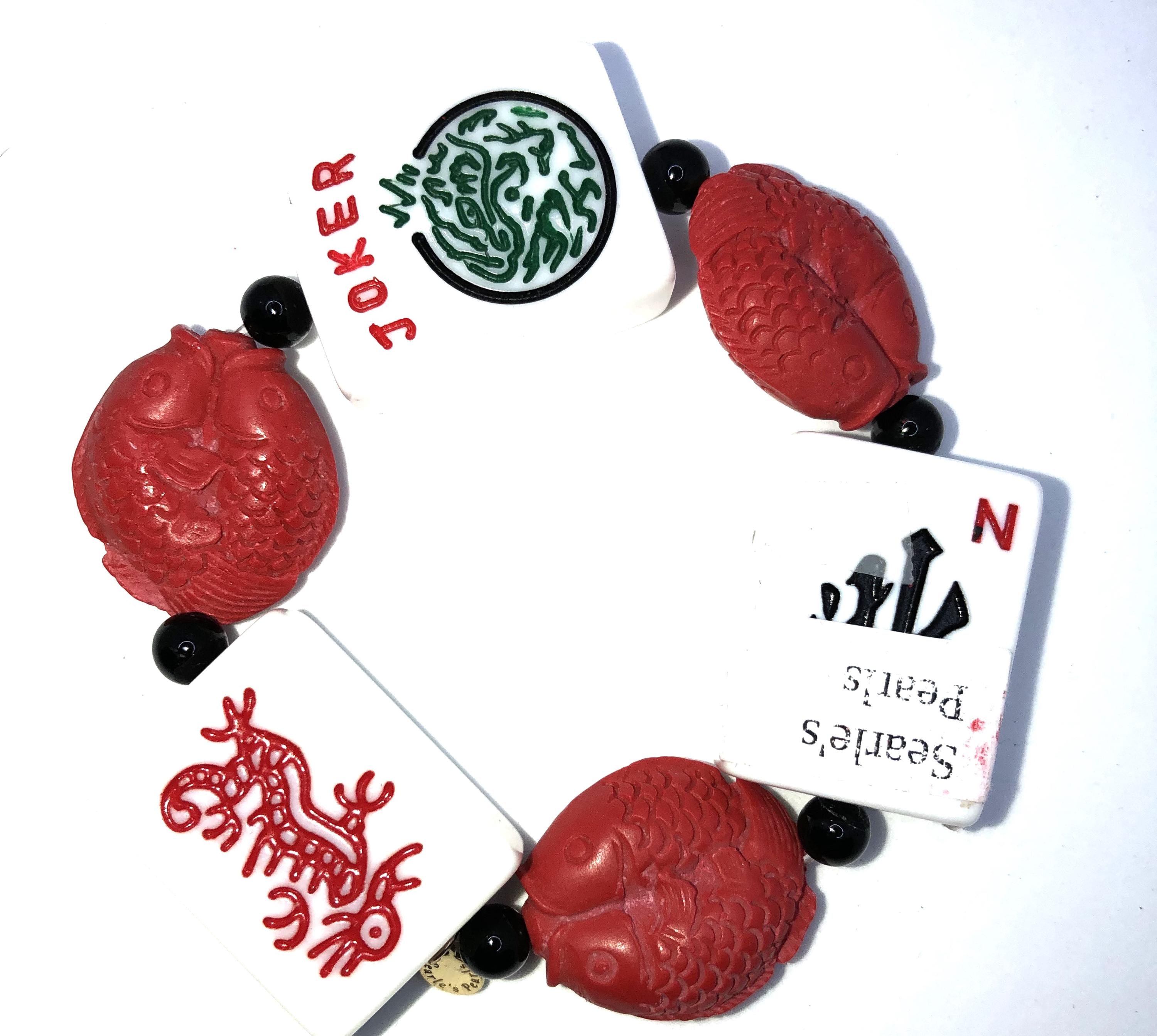 Stretch bracelet with 3 white tiles, and 3 cinnabar beads in shapes of rectangles or rectangle and fish.