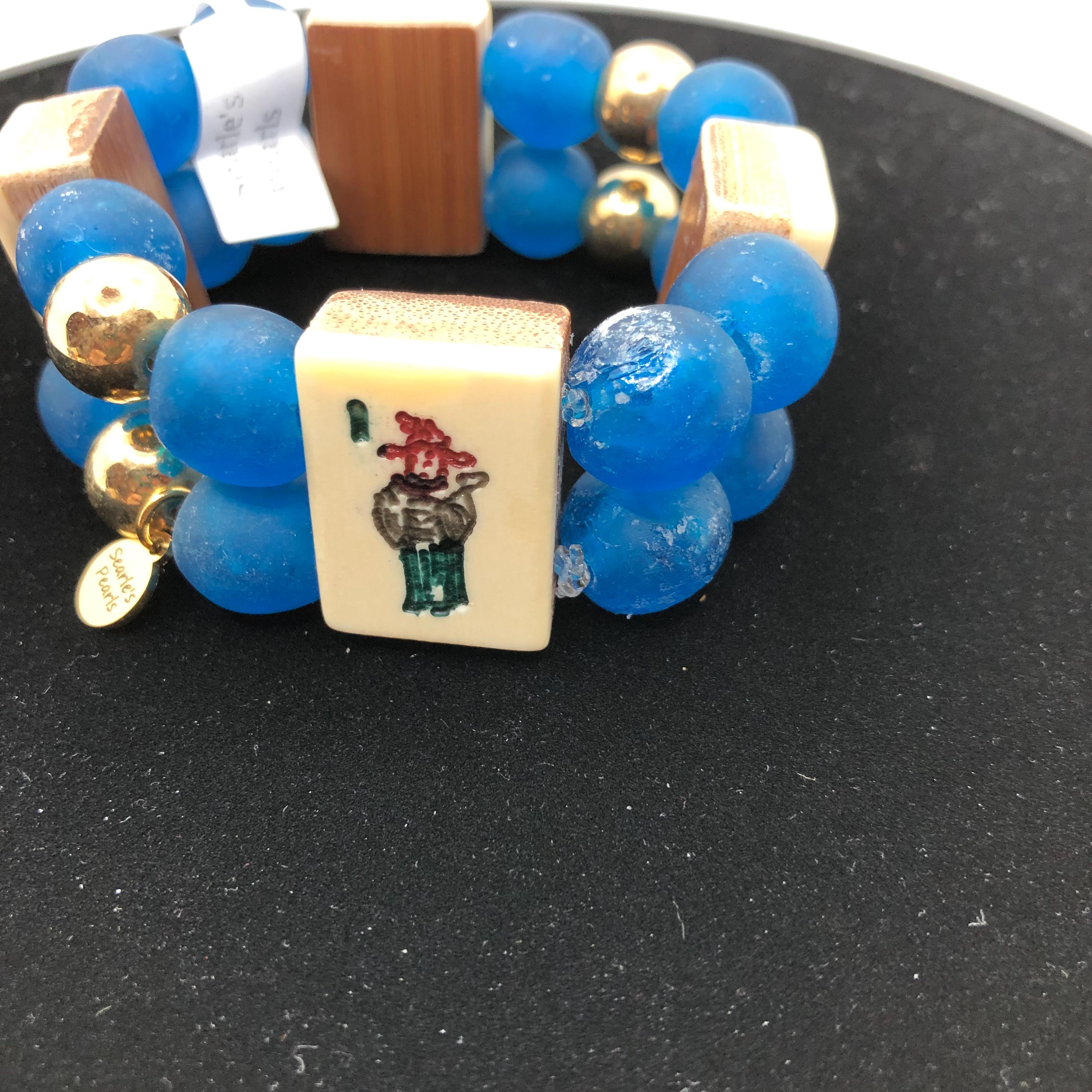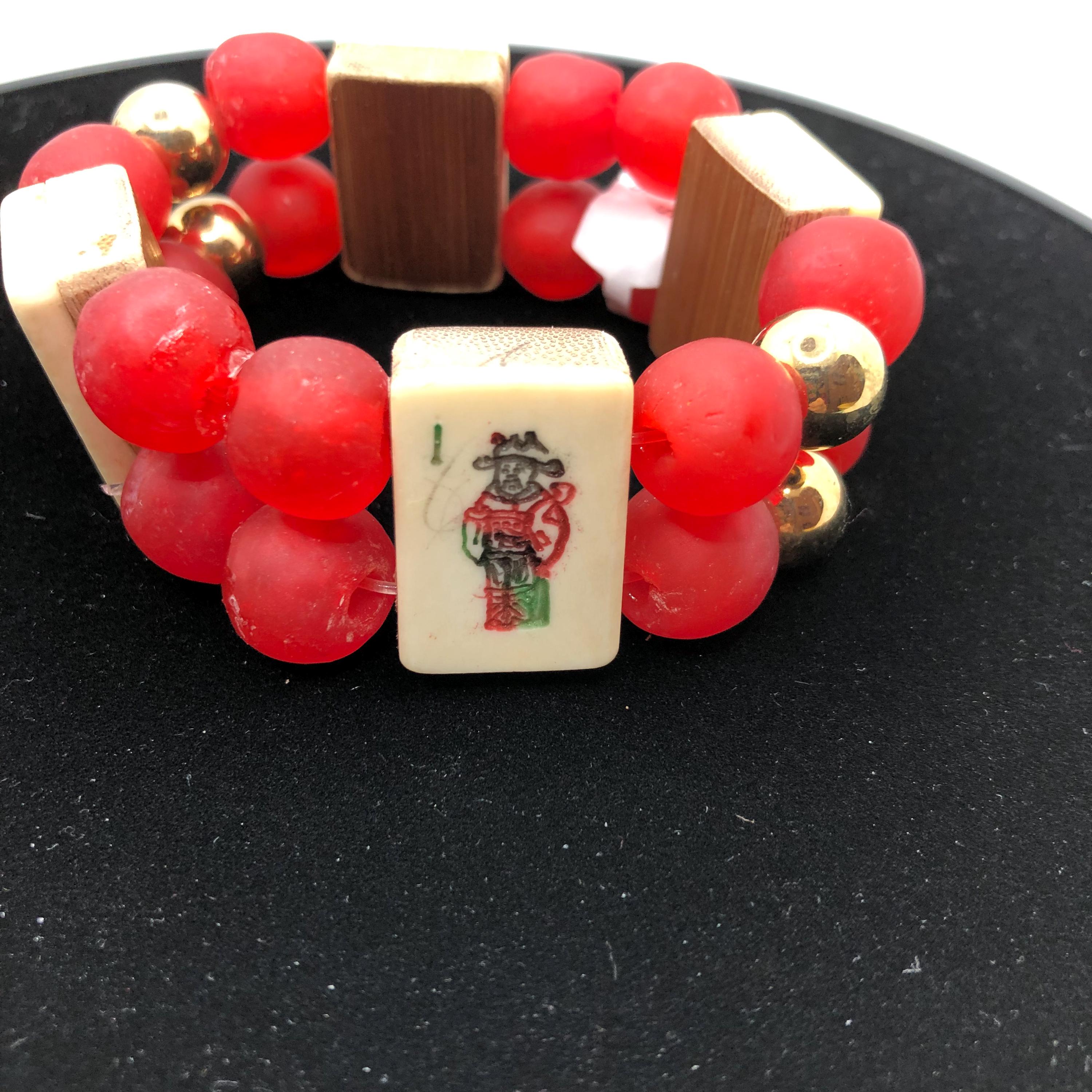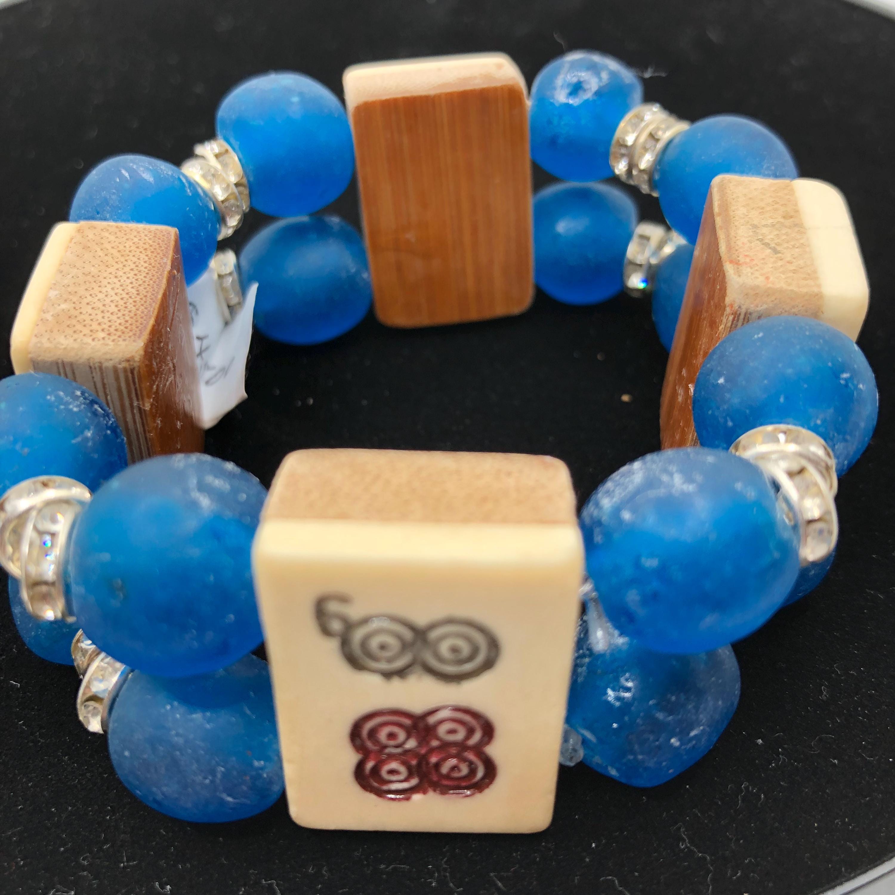 Ask a questionThese stretch bracelets are made of 4 antique mahjong tiles which are made of bone and bamboo. The beads are made in Africa of recycled glass.
