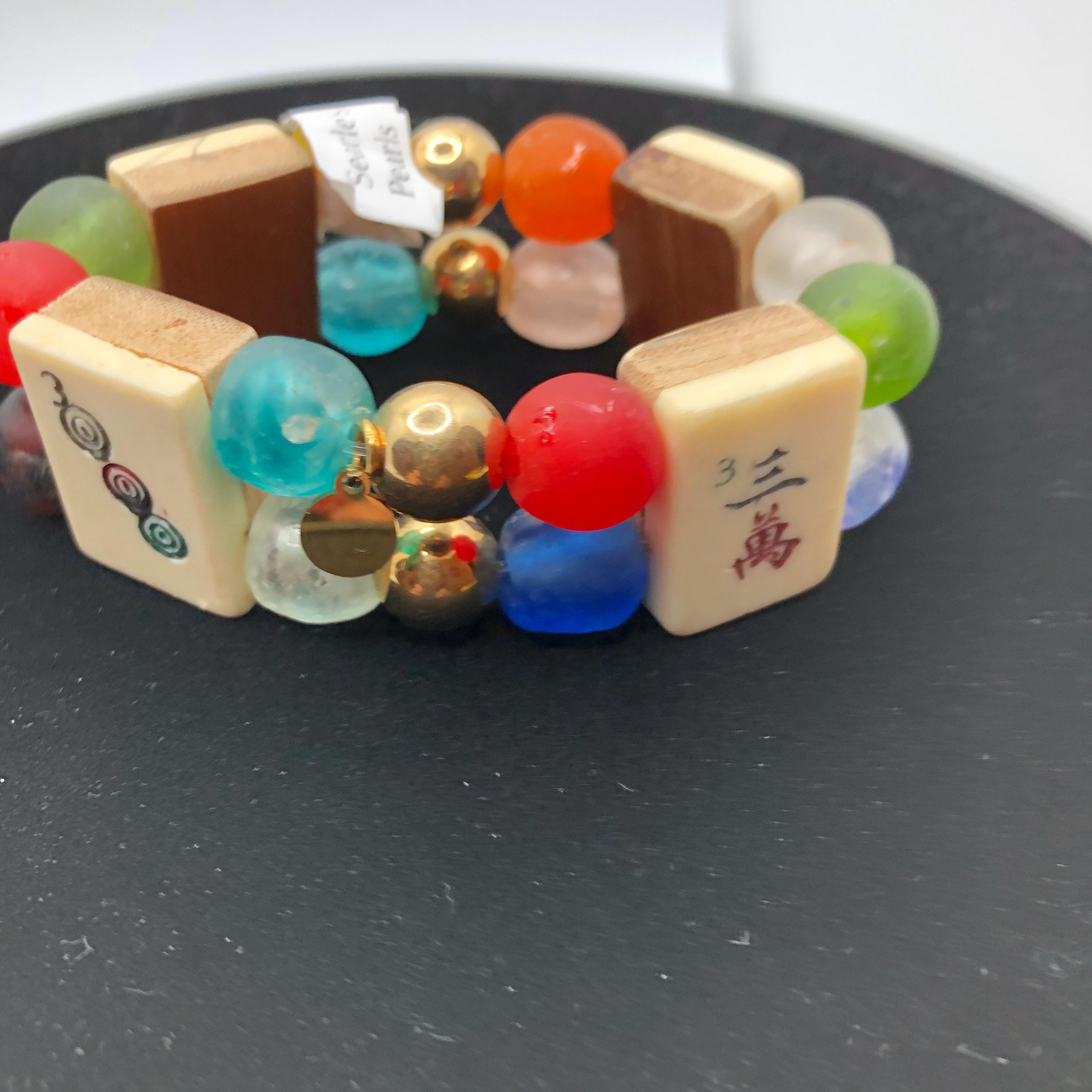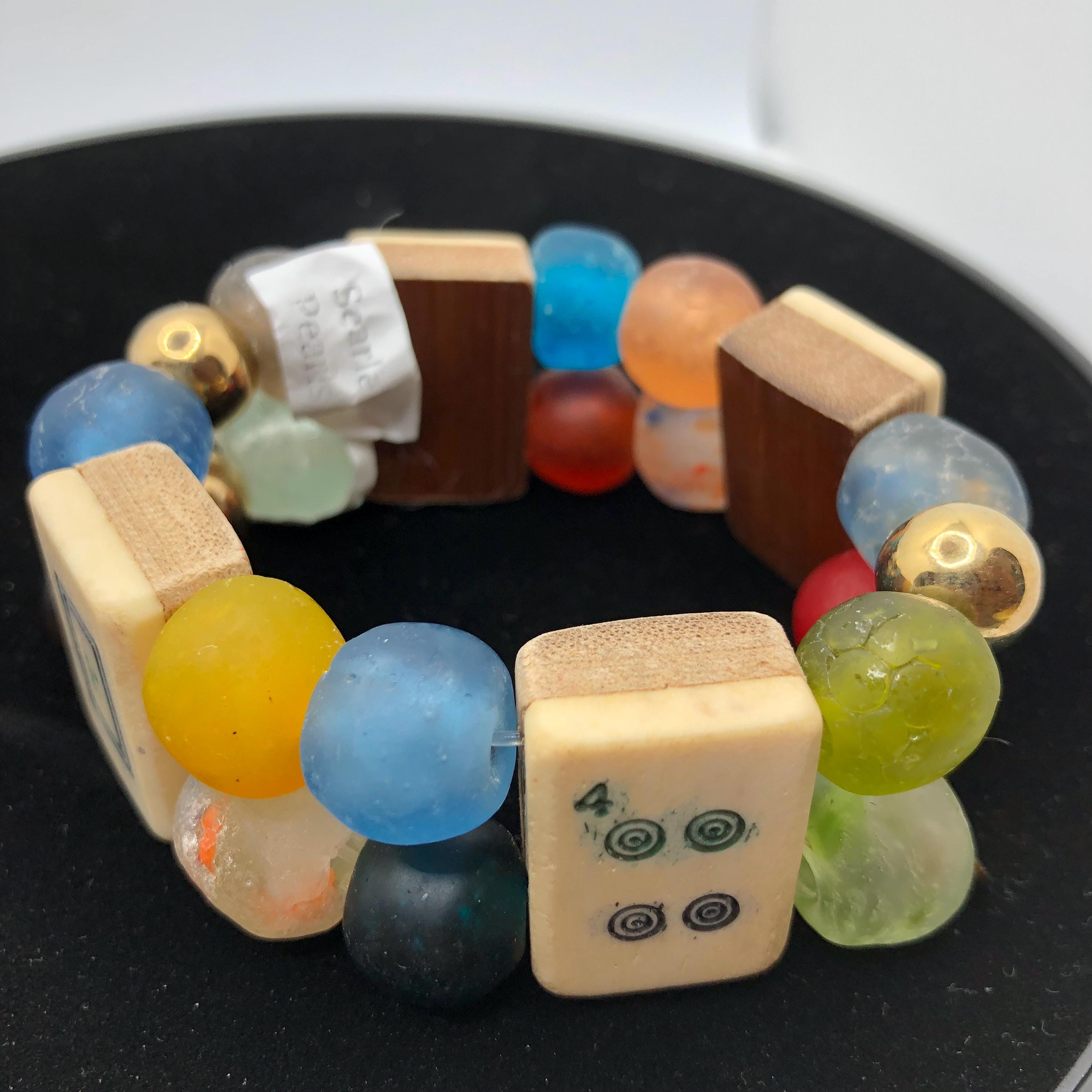 Mahjong stretch bracelet with 4 antique bone and bamboo tiles and African recycled glass beads