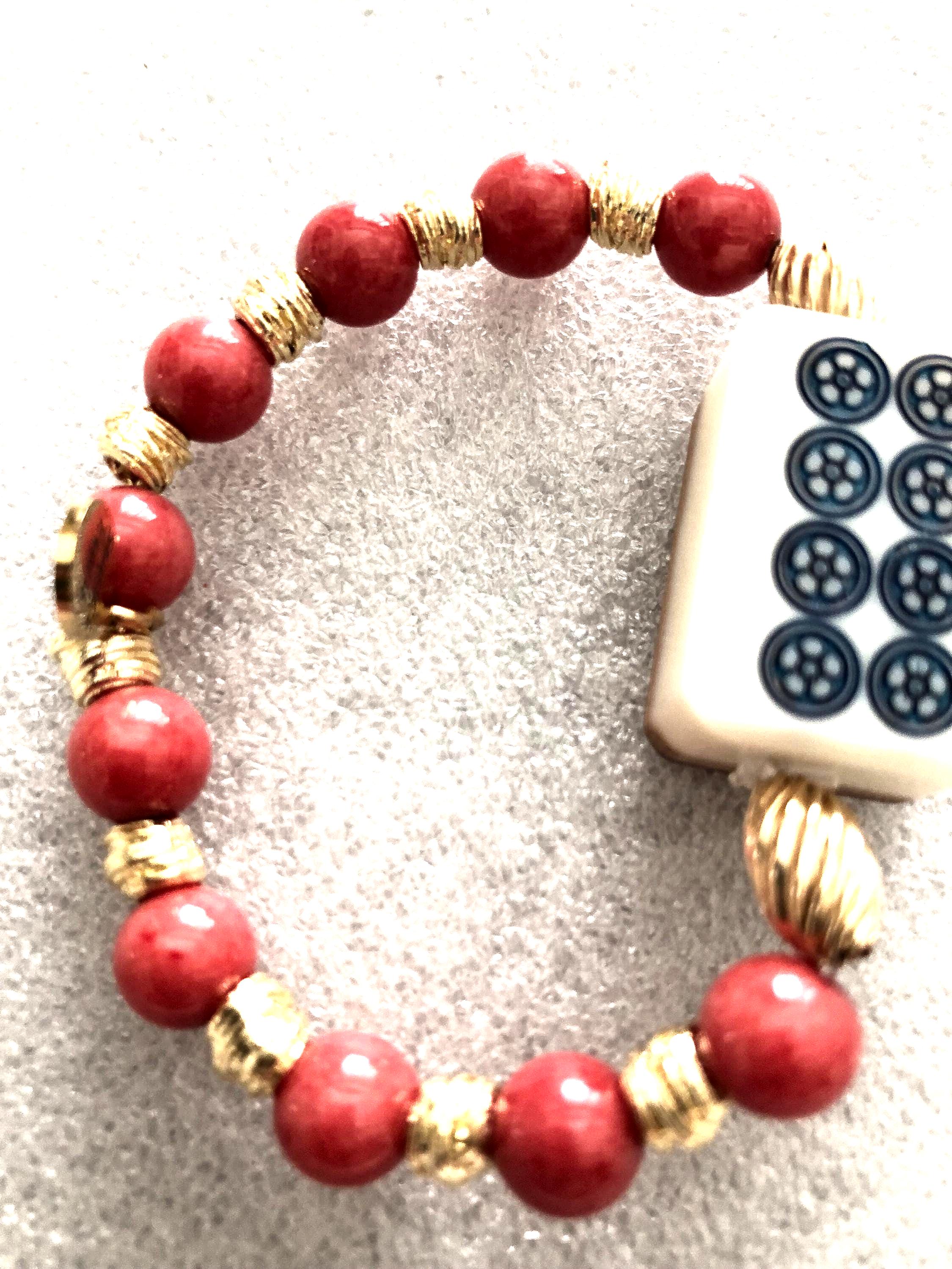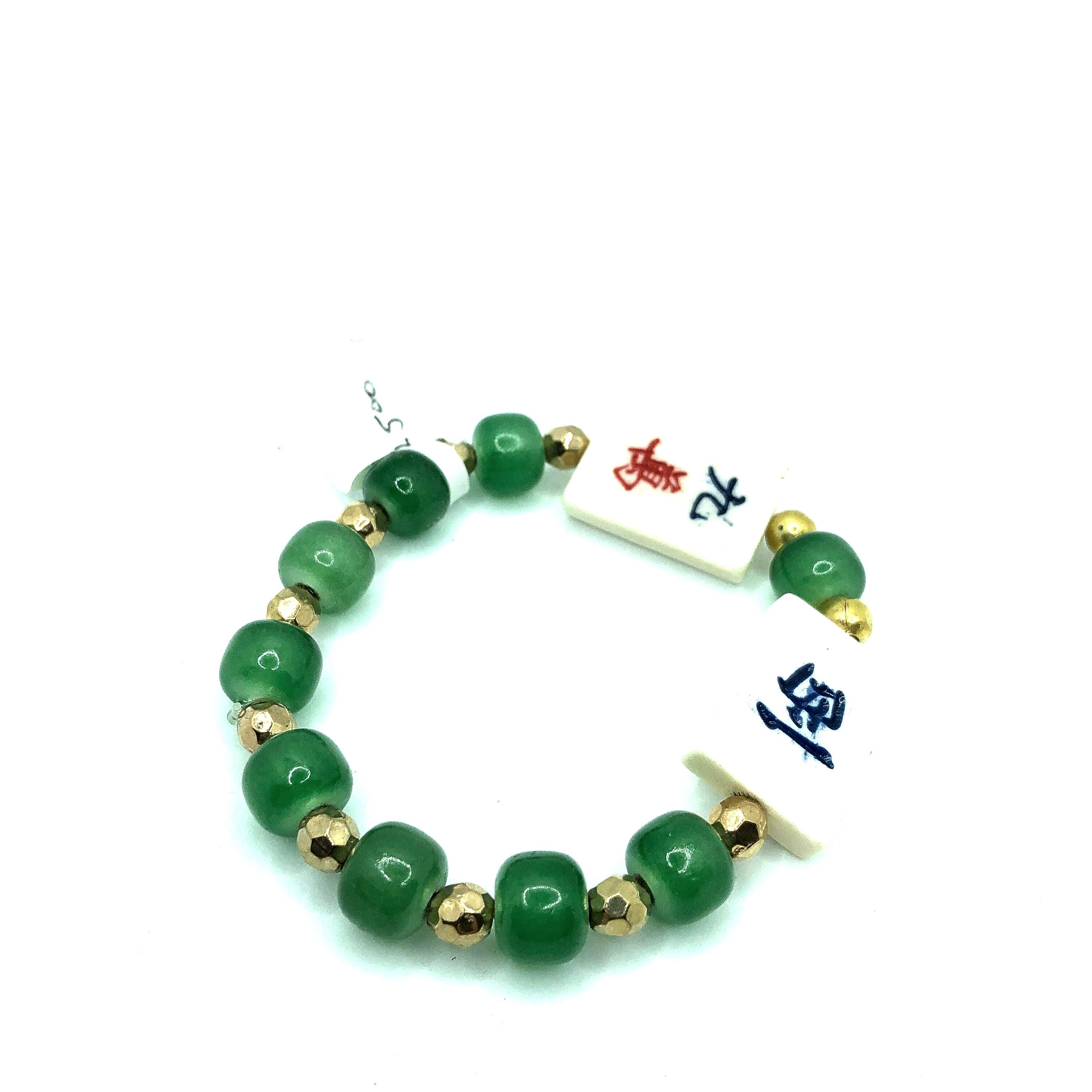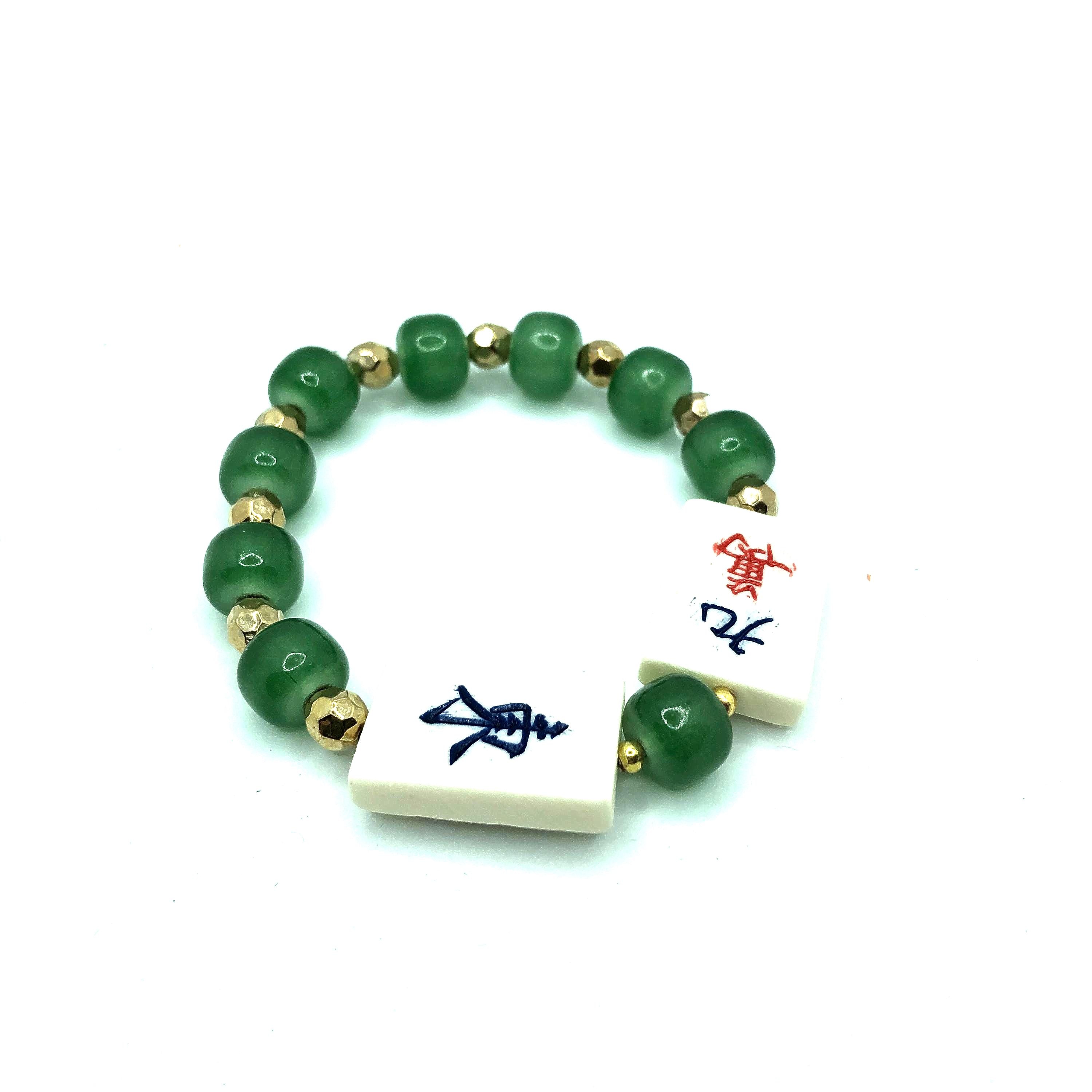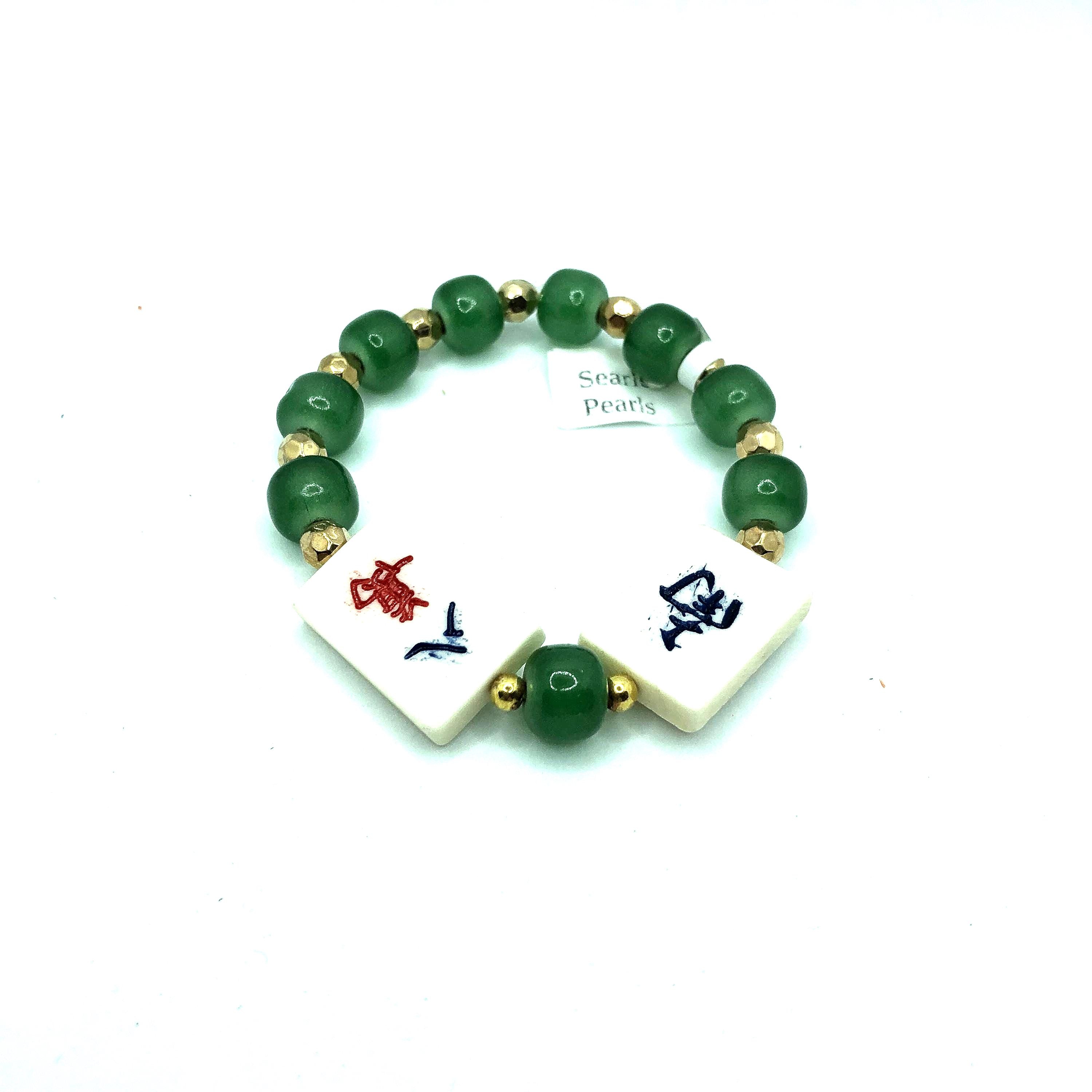 Elastic mahjong bracelet with green tiles and red and green beads. The greens have tiles made of bone; the reds have tiles made of bone and bamboo.