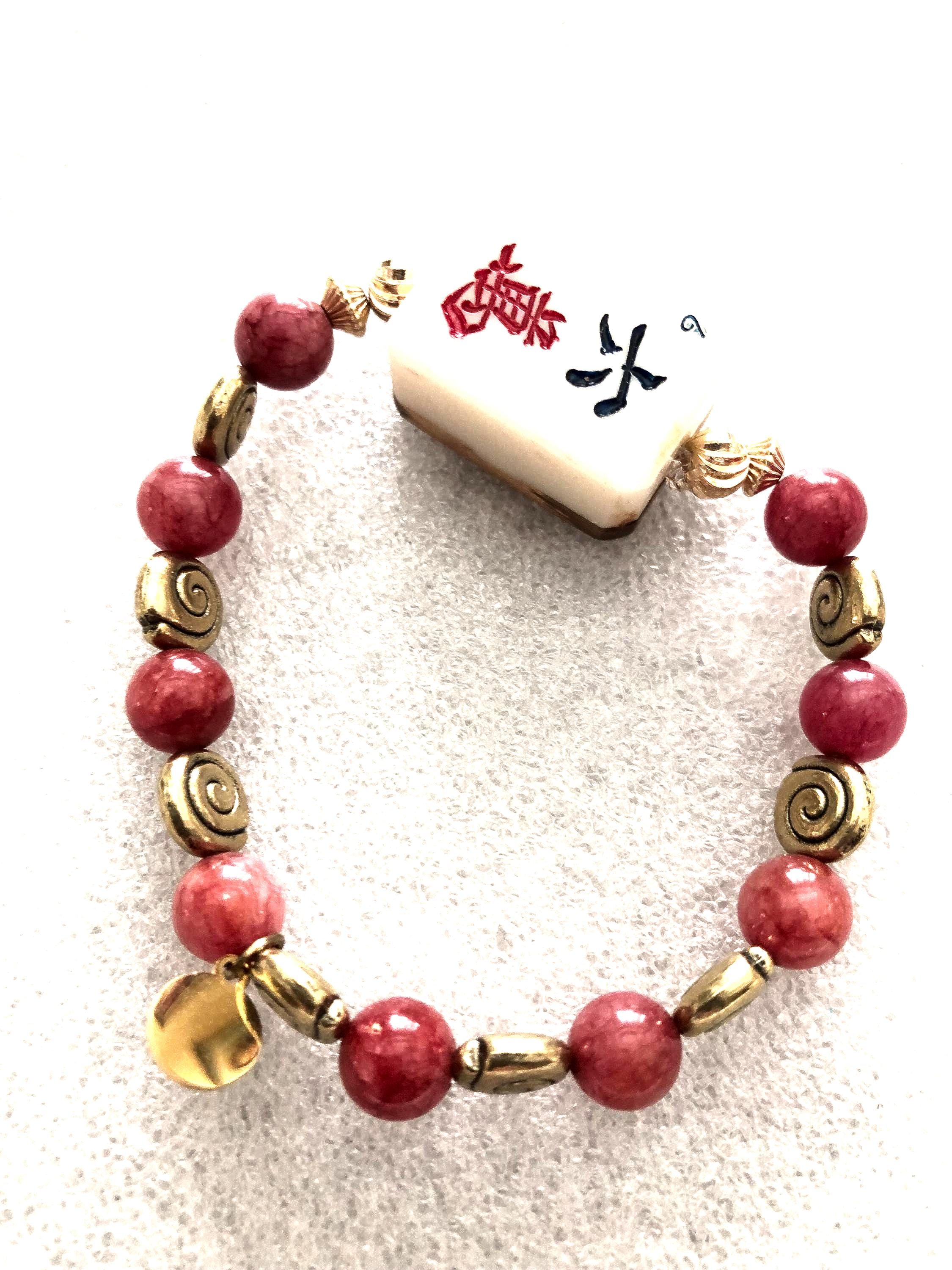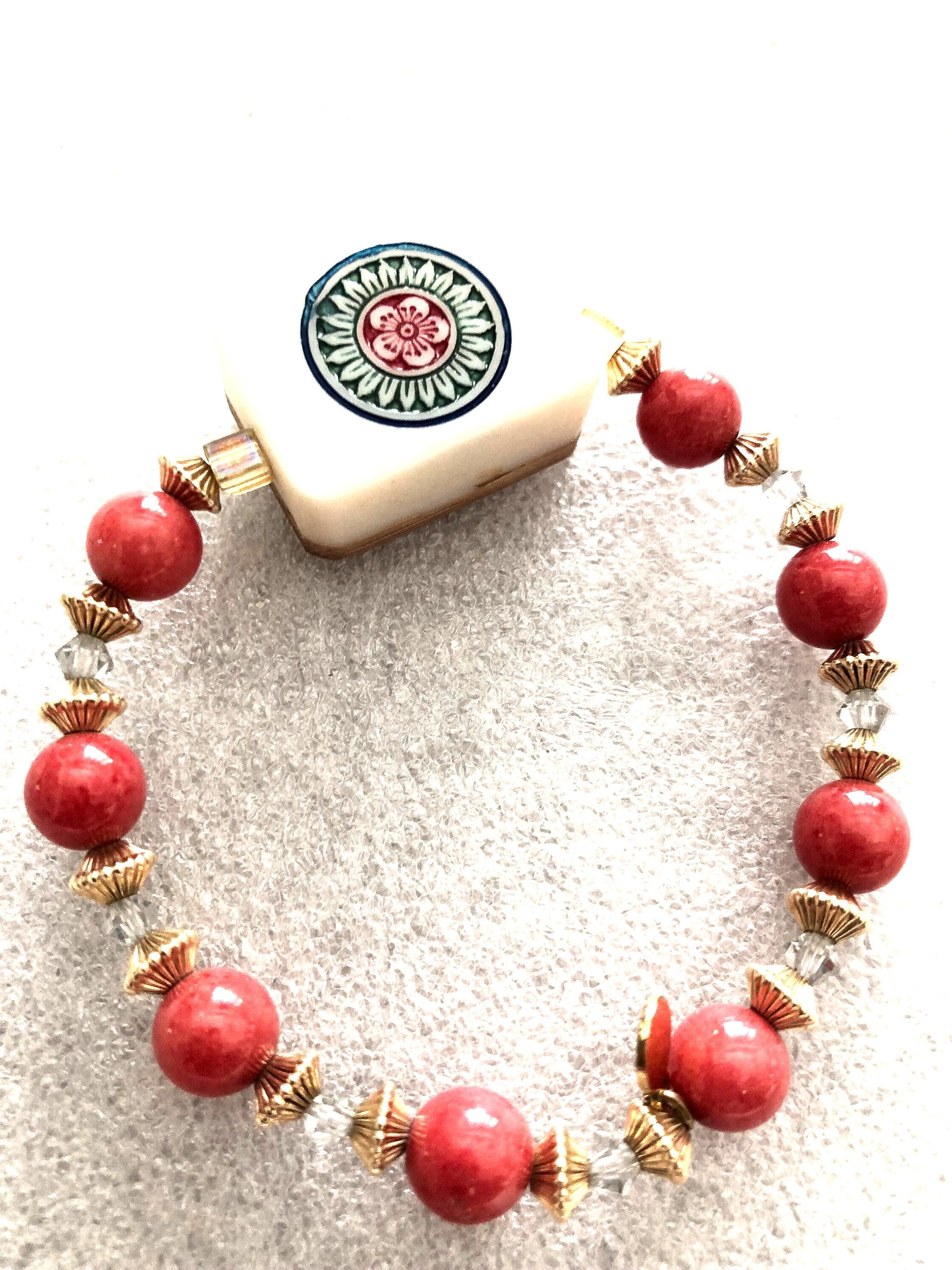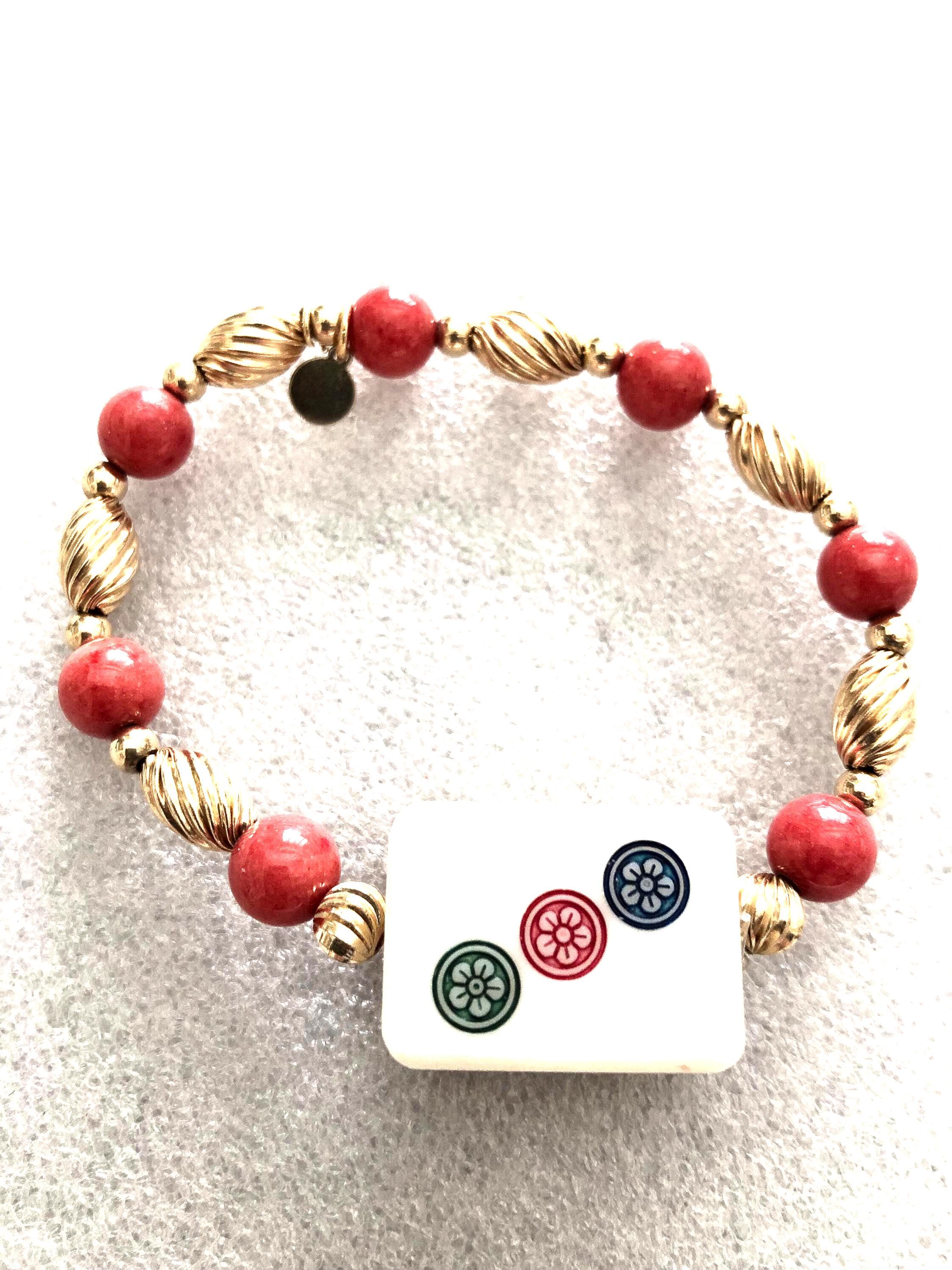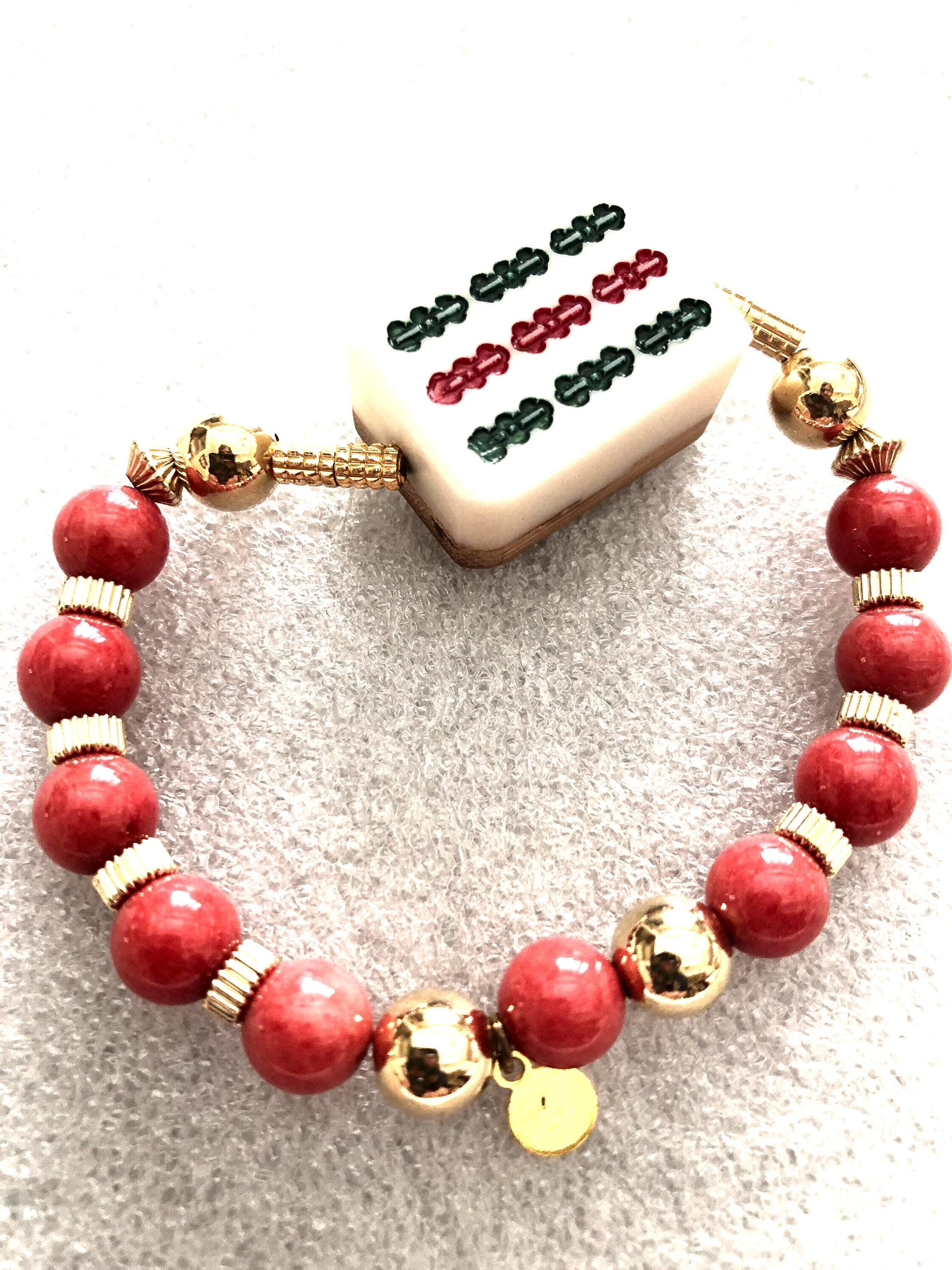 Elastic mahjong bracelet with green tiles and red and green beads. The greens have tiles made of bone; the reds have tiles made of bone and bamboo.