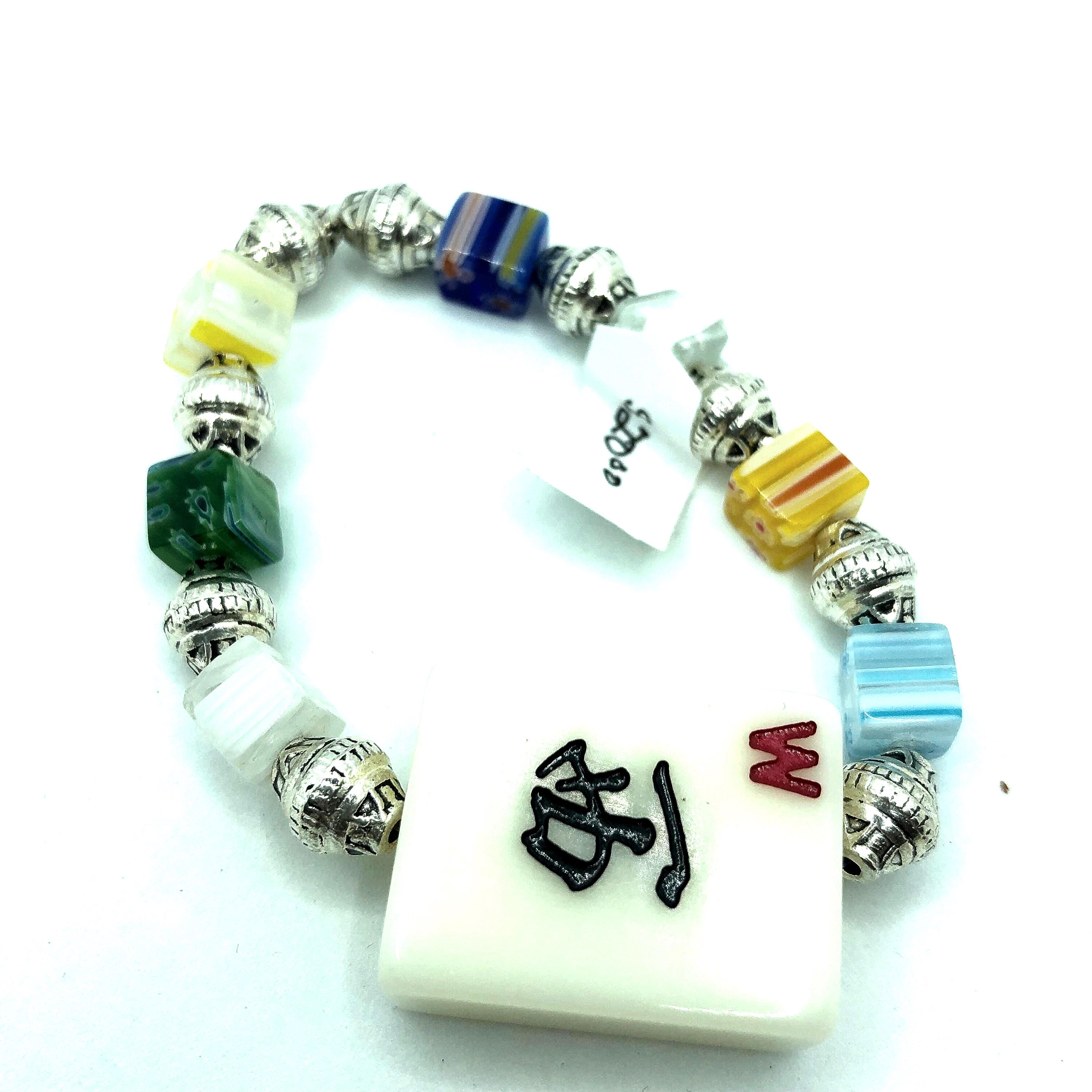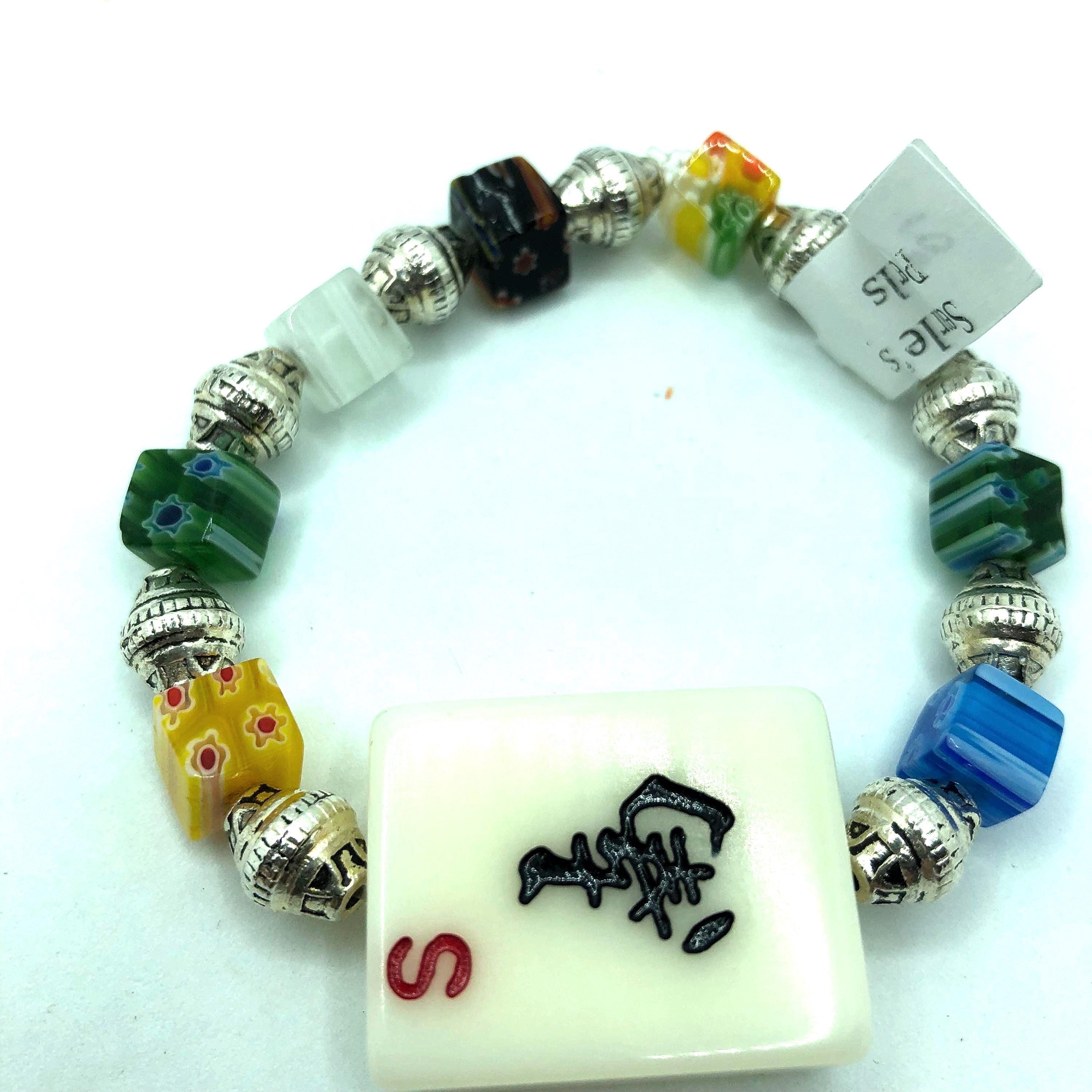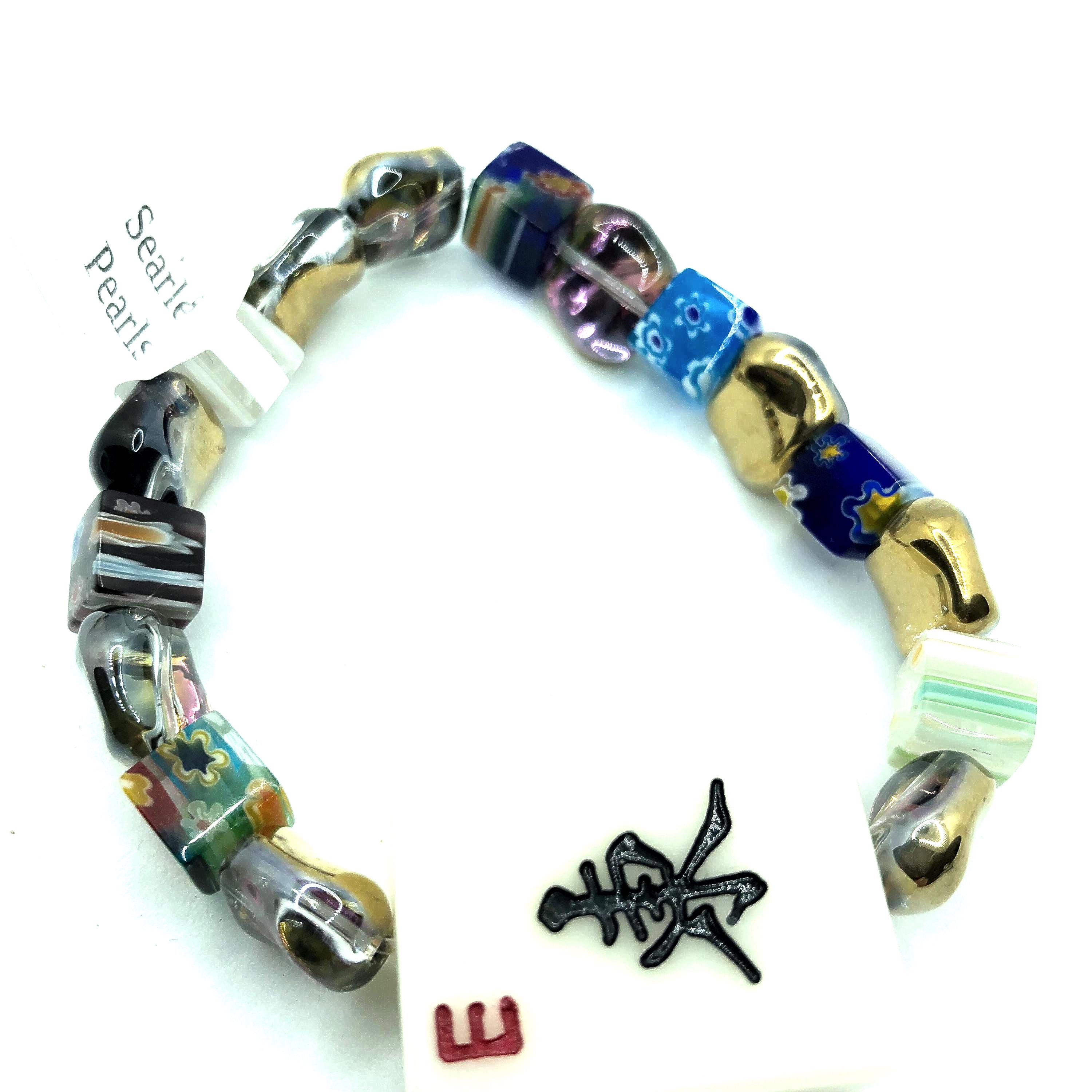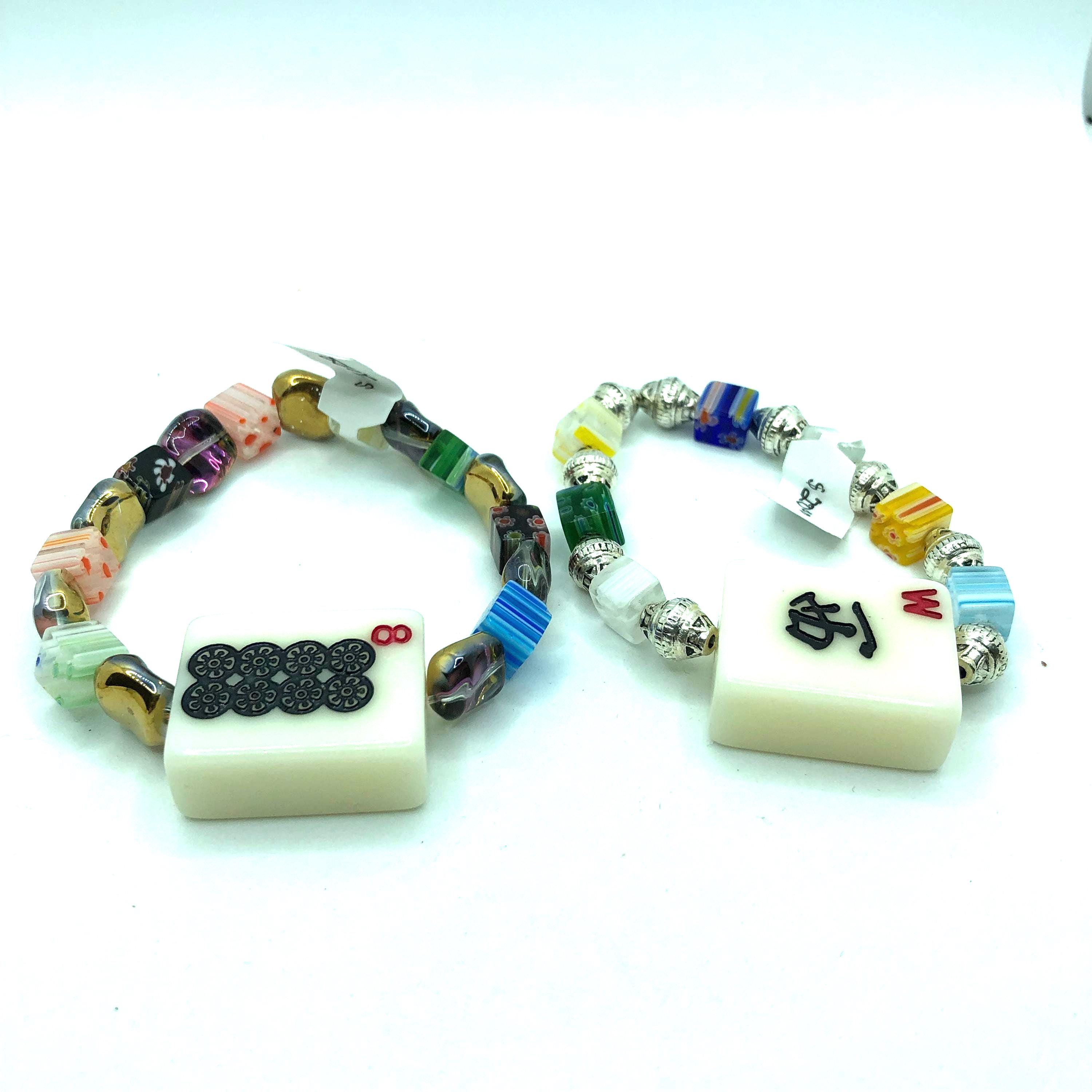 These stretch mahjong bracelets are made with cubic glass cane beads. Two are interspersed with silver spacer beads and 2 are with gold glass beads.