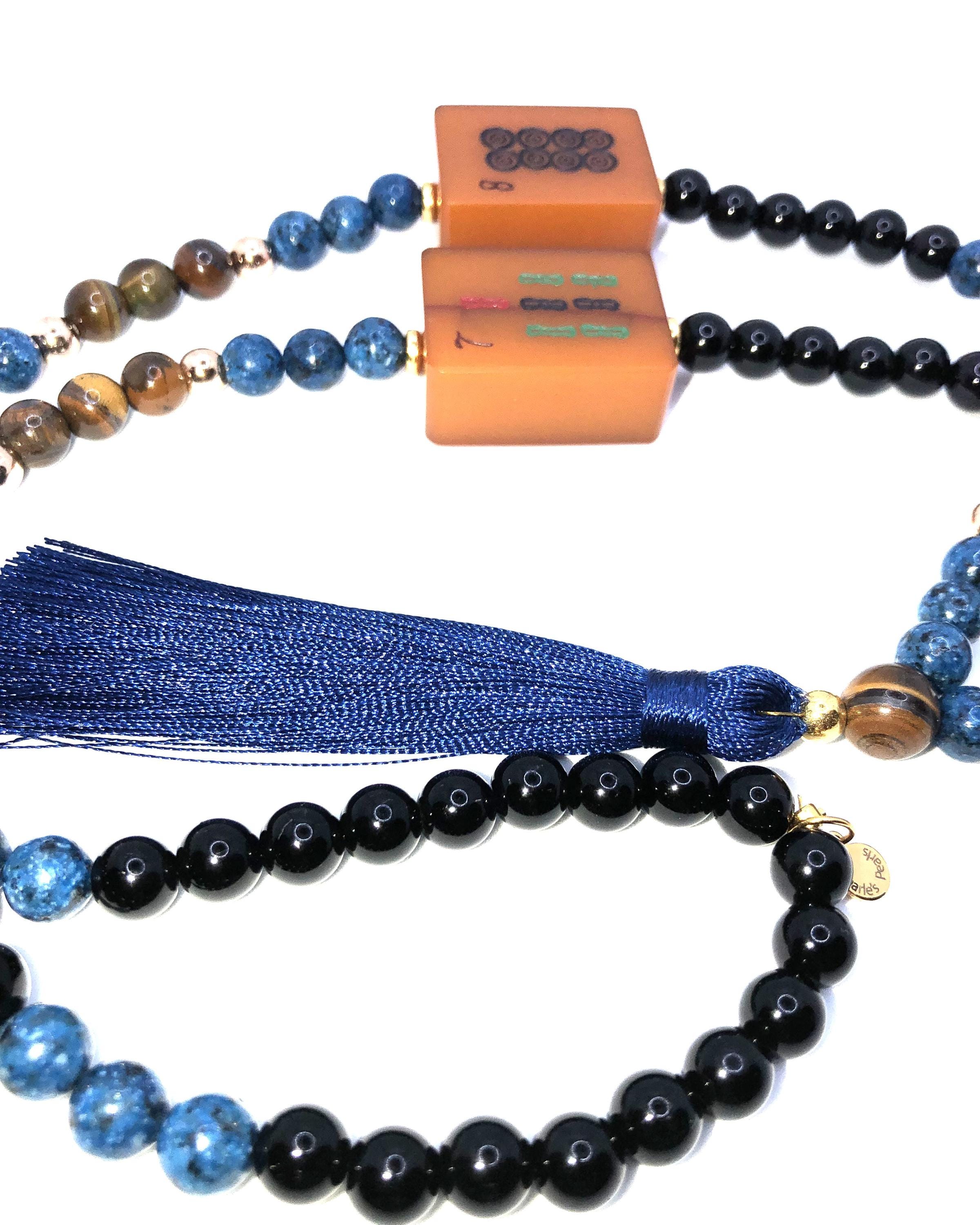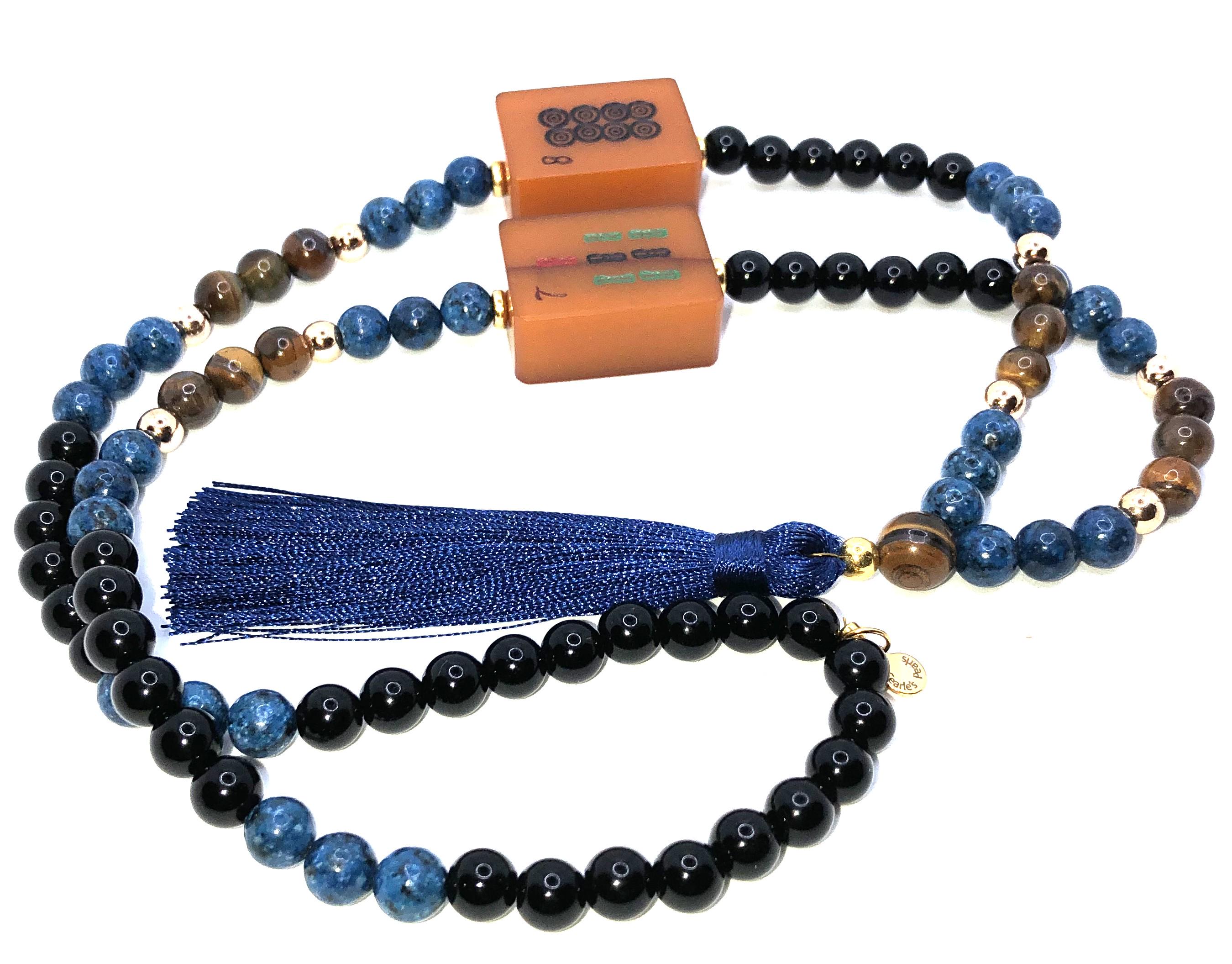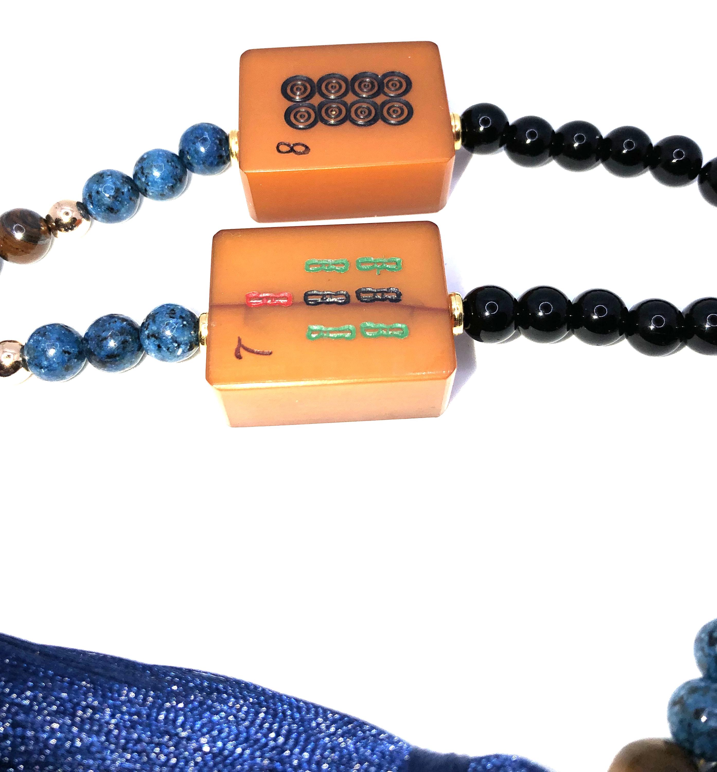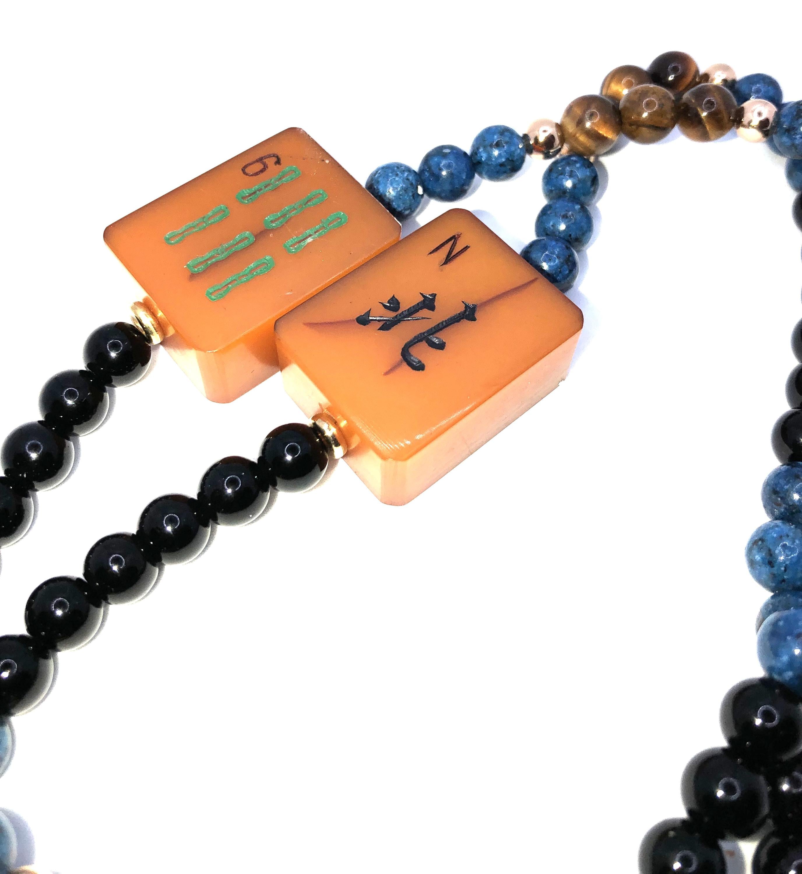Mahjong necklace of lapis, tiger's eye, onyx and old Bakelite tiles