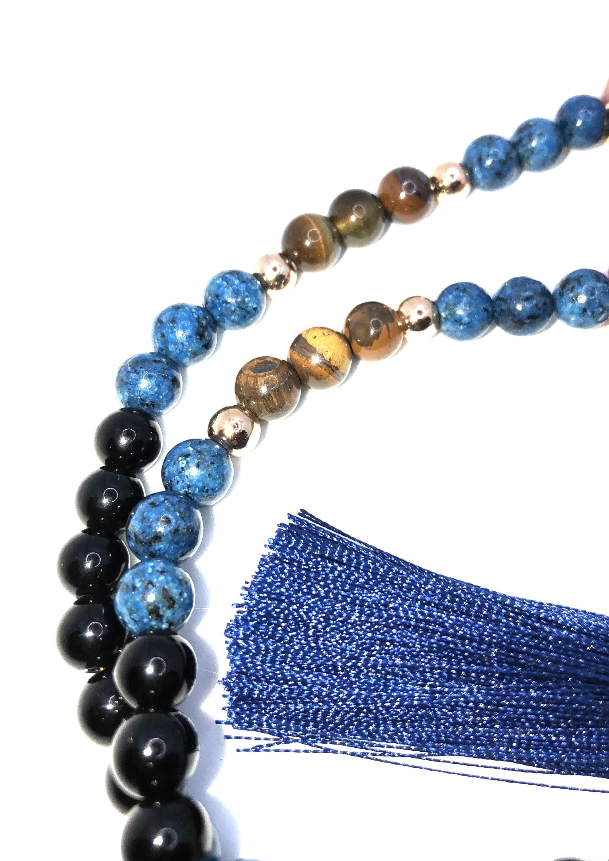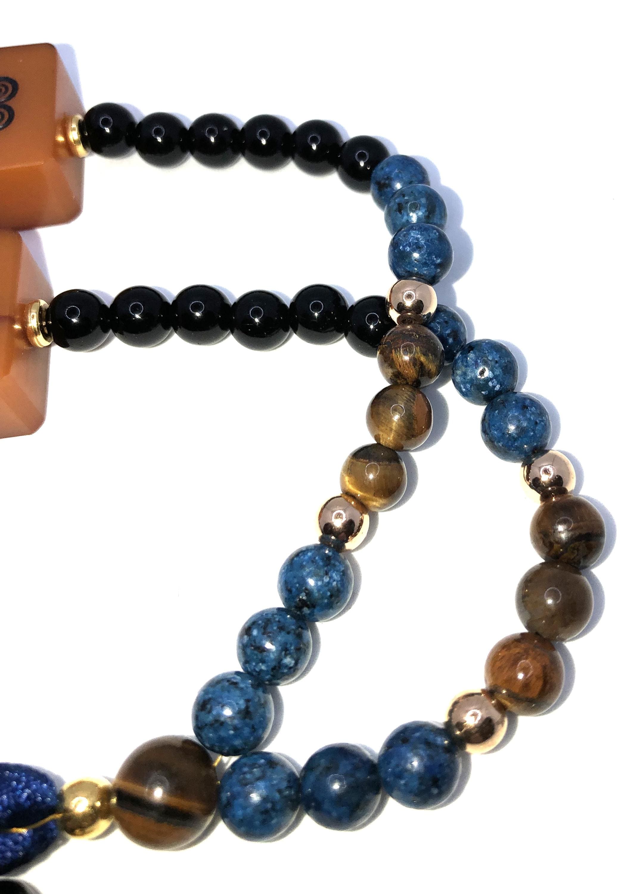 This 32" necklace is made of lapis lazuli, tiger's eye, and onyx beads beads. It has antique Bakelite tiles, a 4" tassel, and toggle clasp.