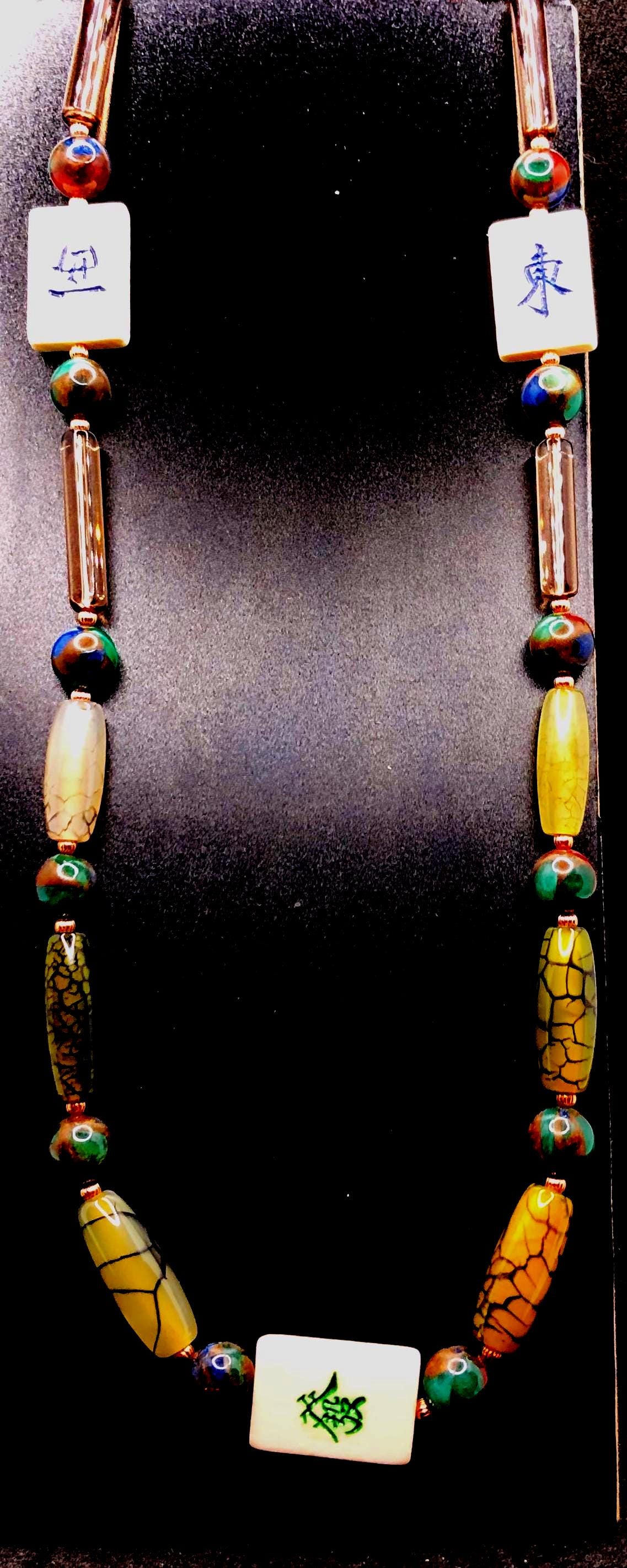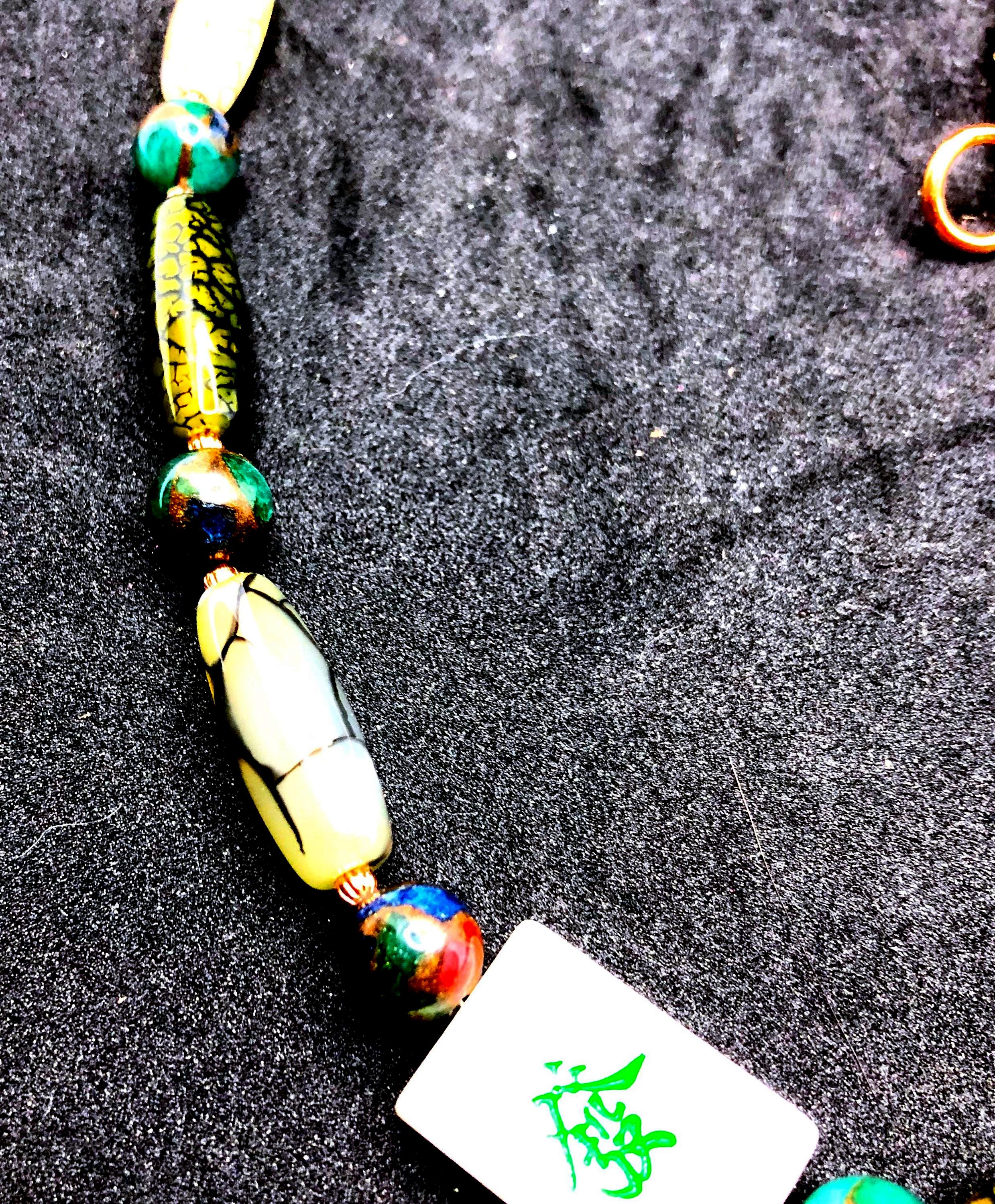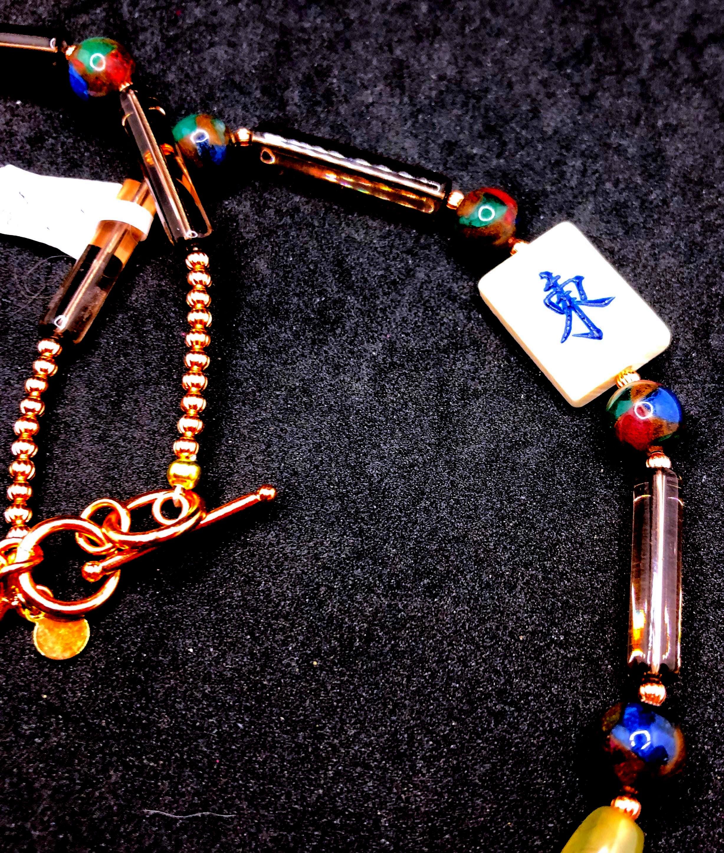 This 25" necklace has moss agate cylindrical and round, cylindrical glass , and small round copper beads. It also has 3 bone tiles, a toggle clasp, with 2" extension.