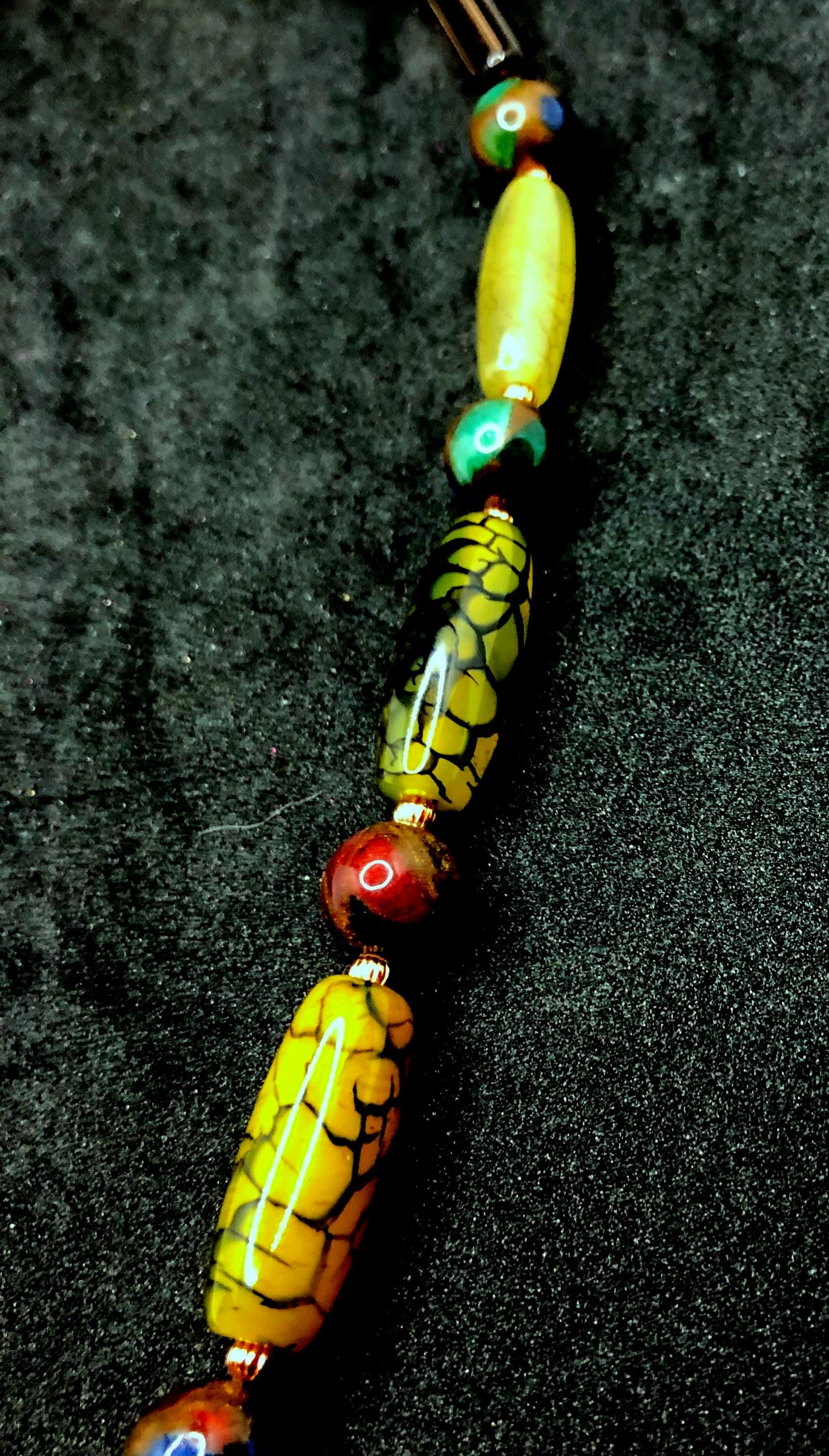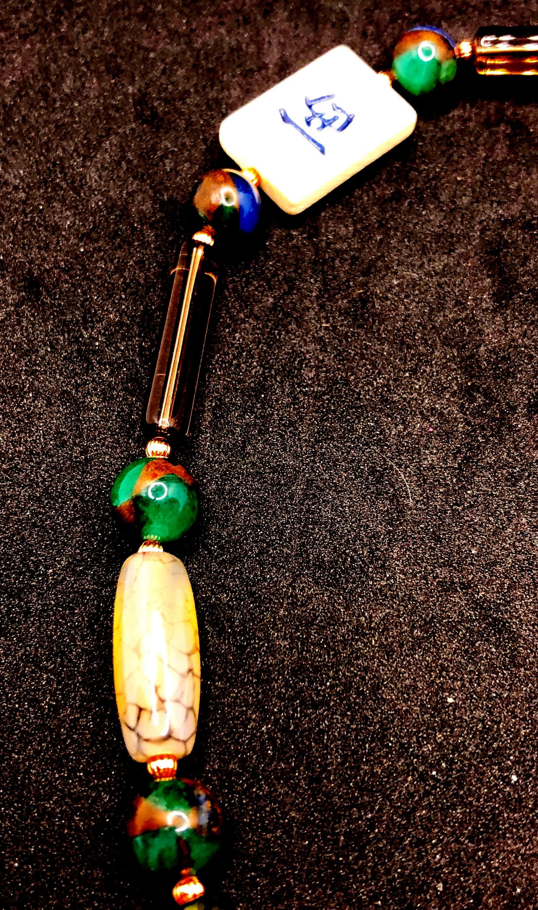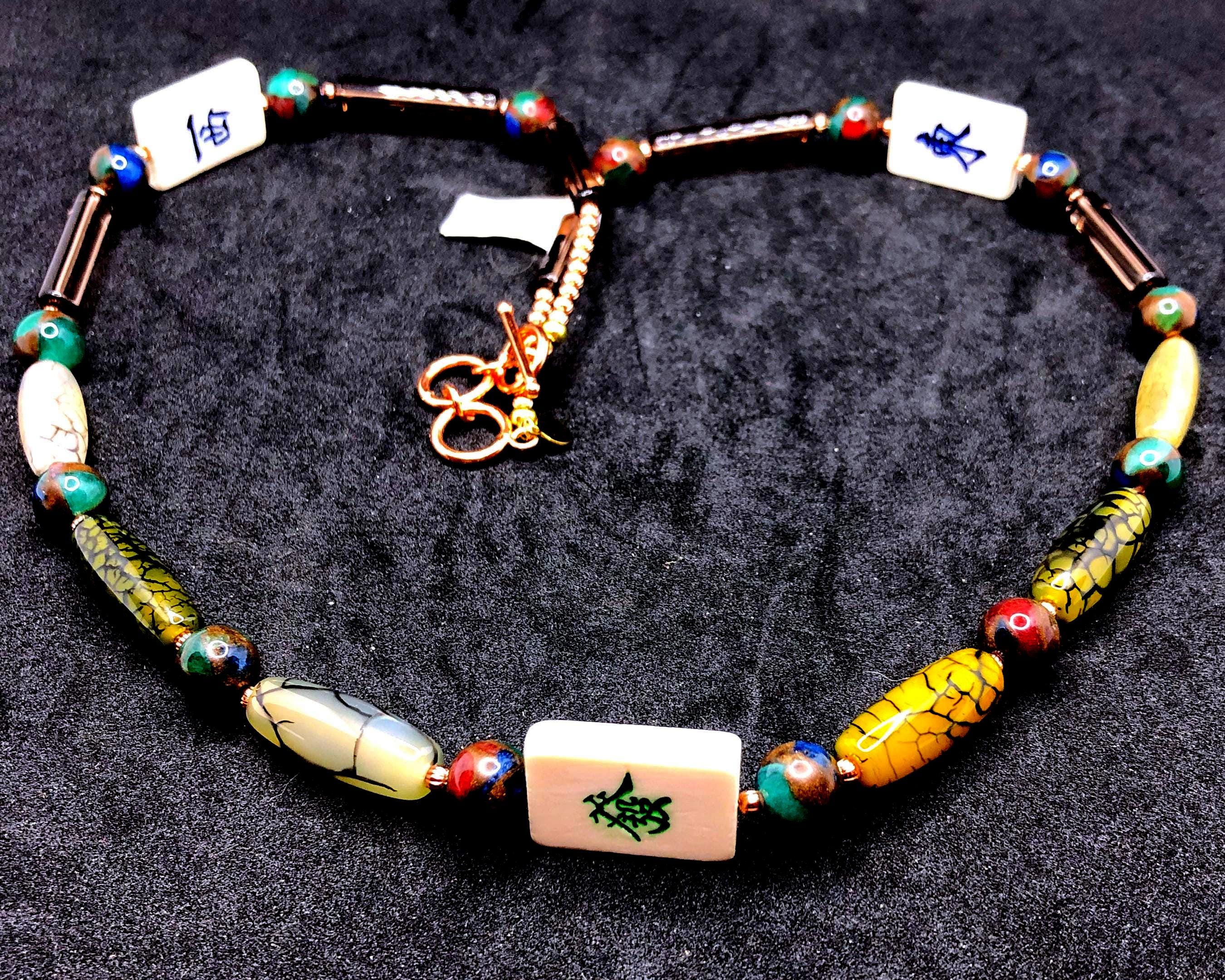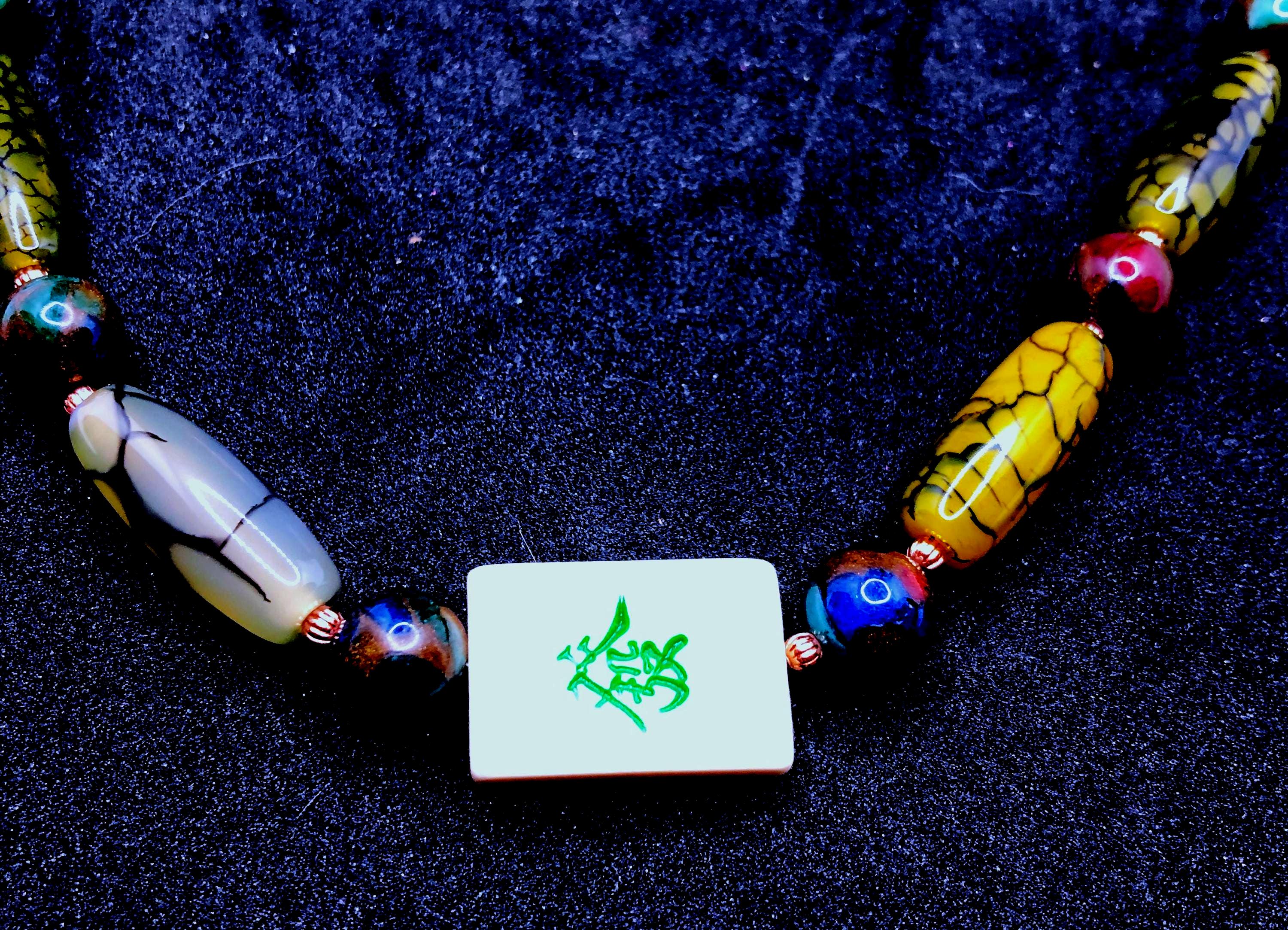 This 25" necklace has moss agate cylindrical and round, cylindrical glass , and small round copper beads. It also has 3 bone tiles, a toggle clasp, with 2" extension.