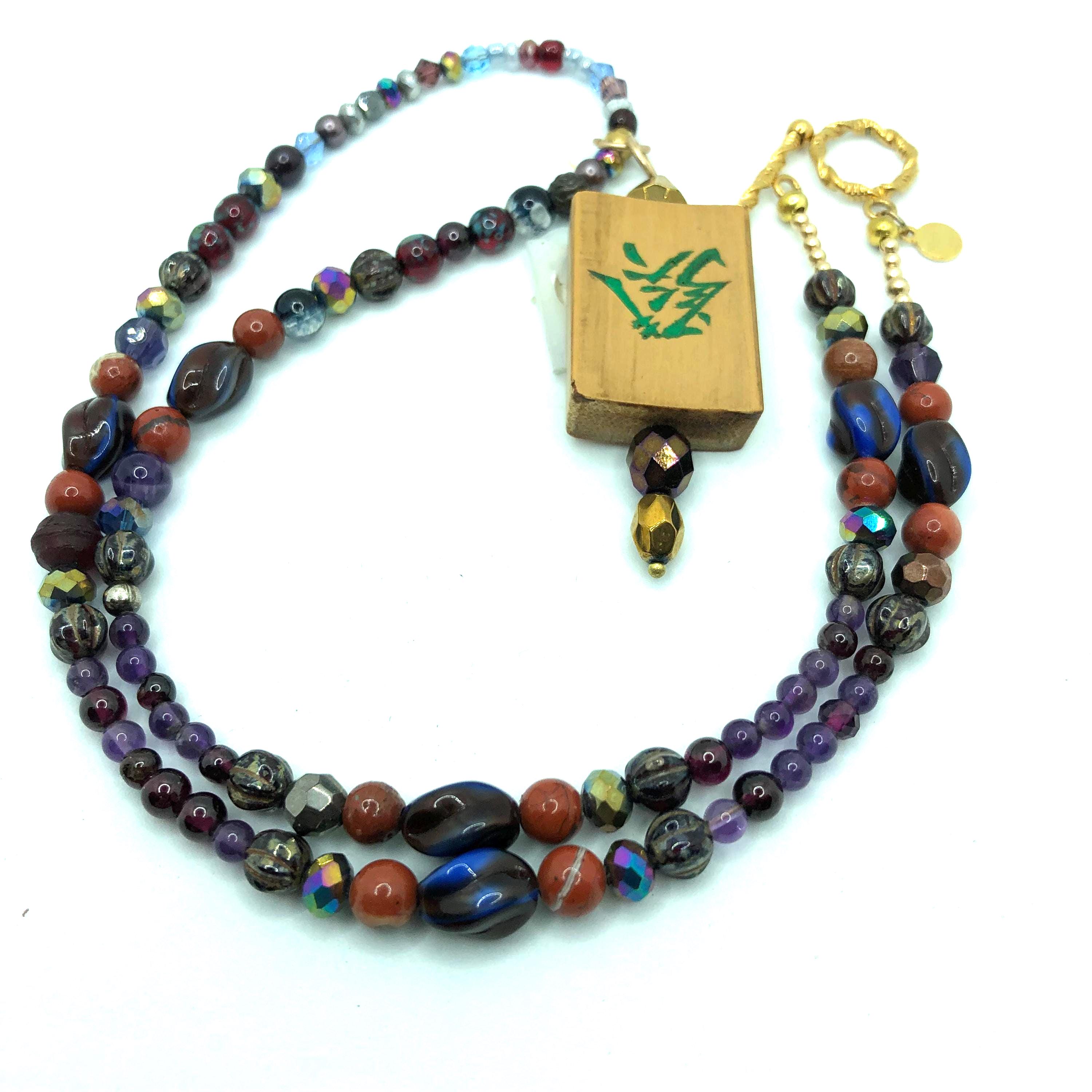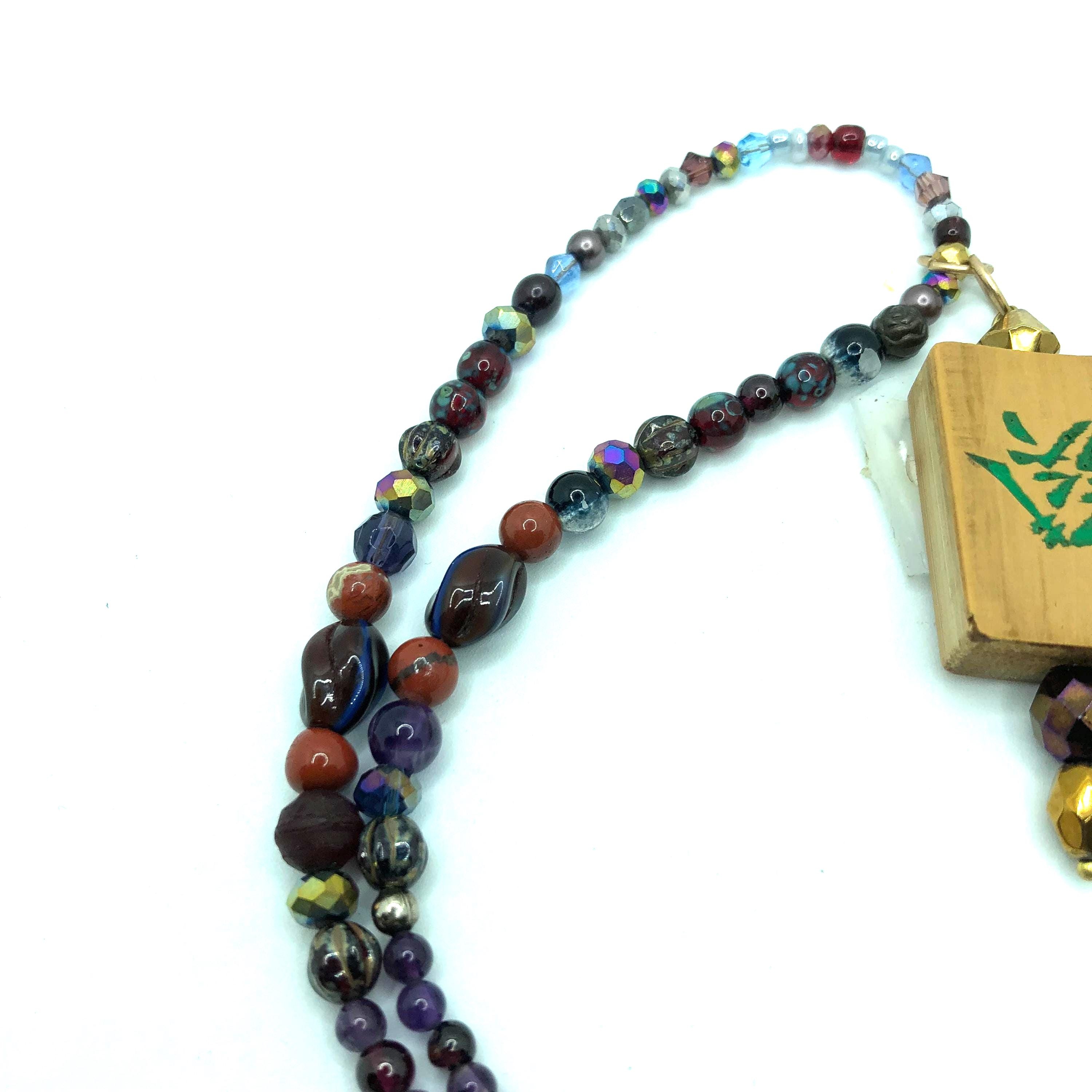 This 22" necklace has graduated small gem stones with an antique wooden pendant and toggle clasp.