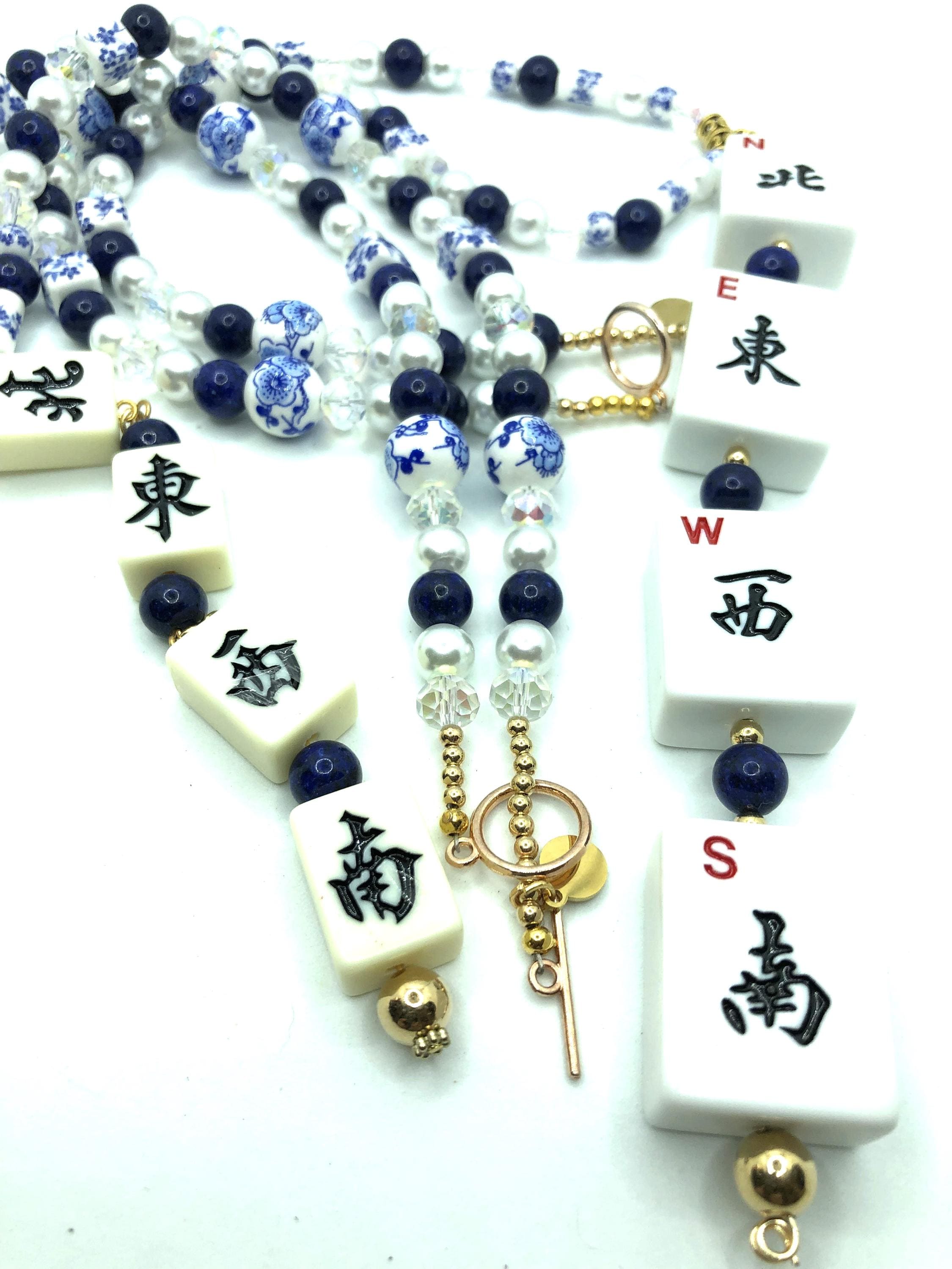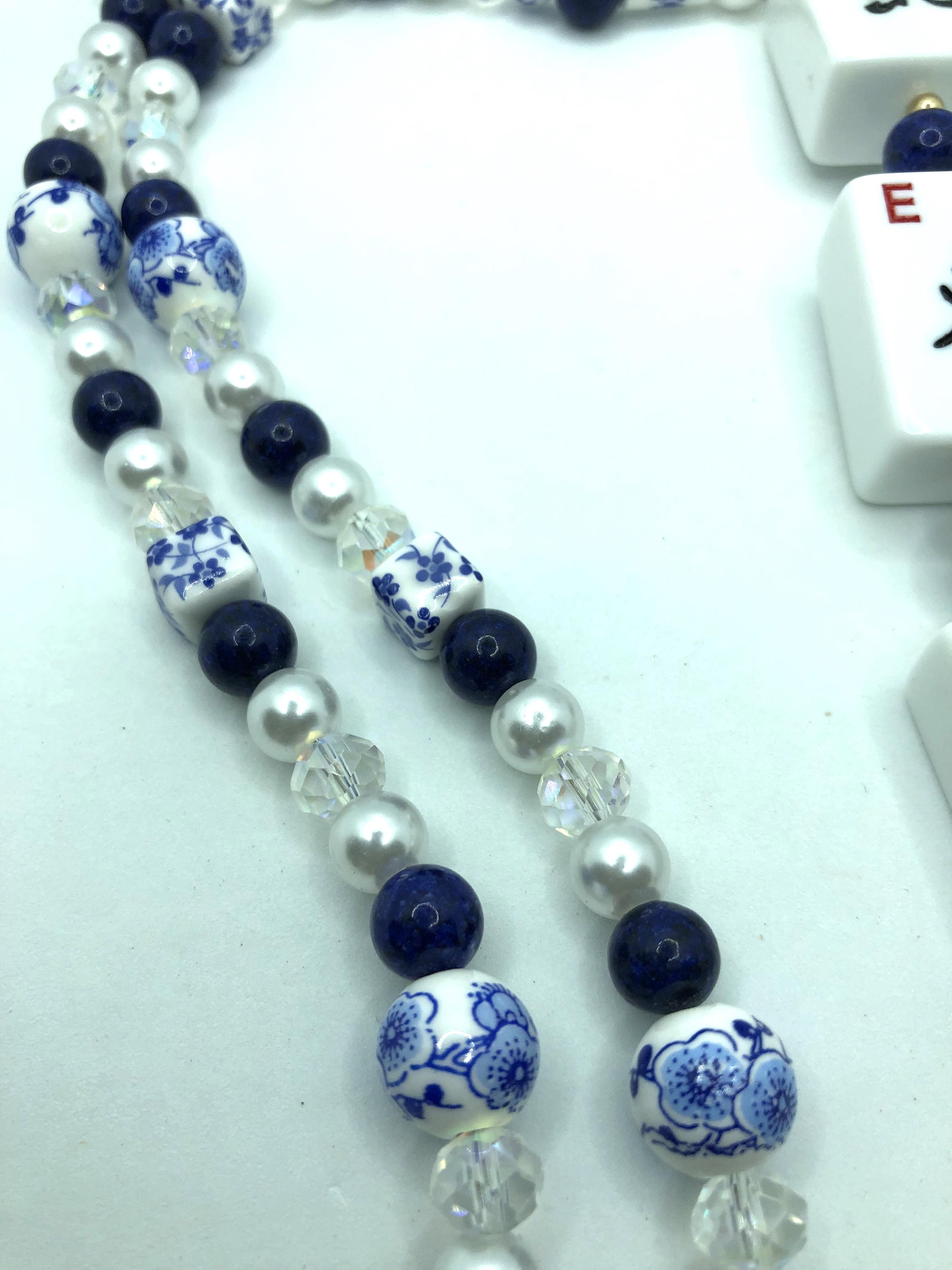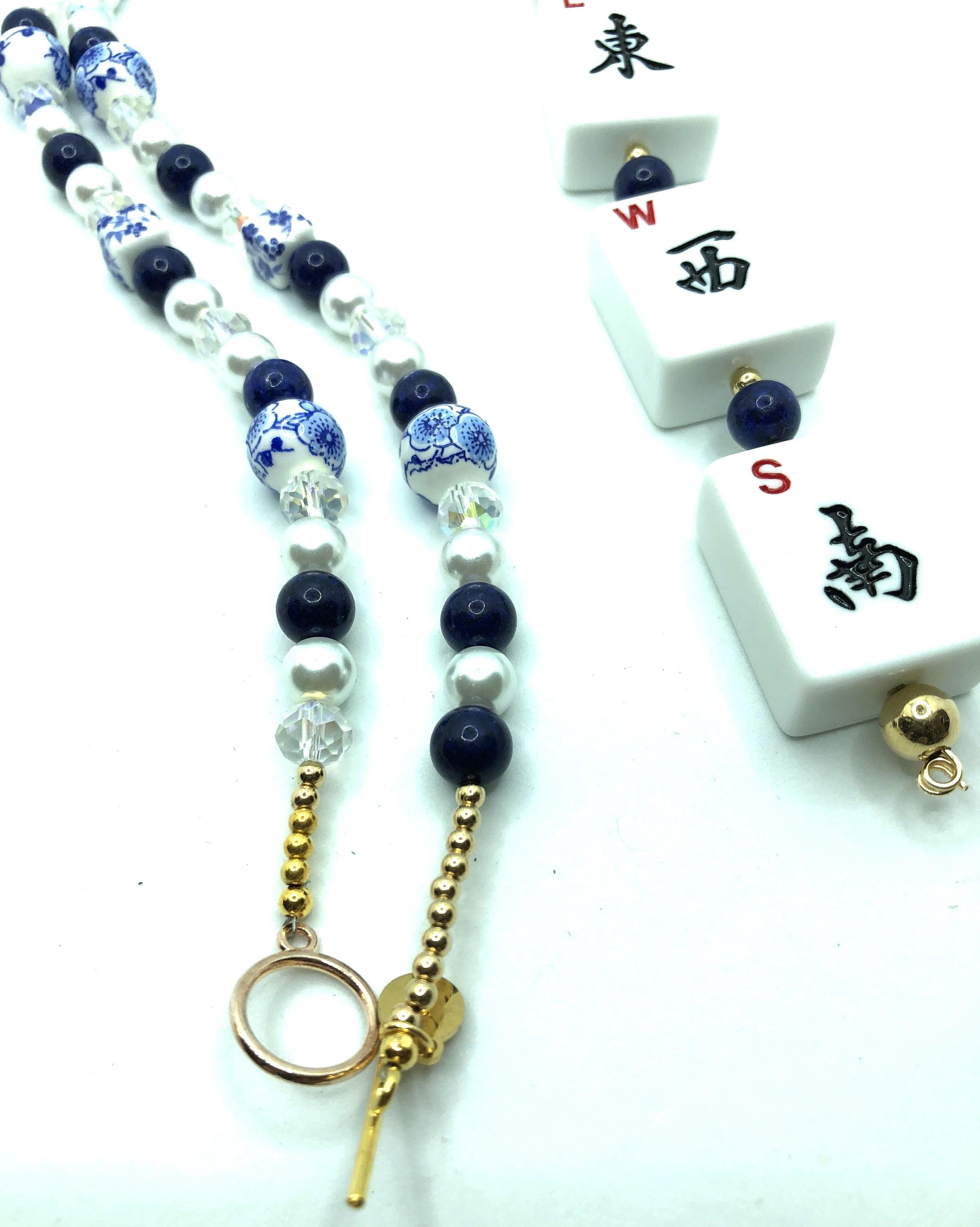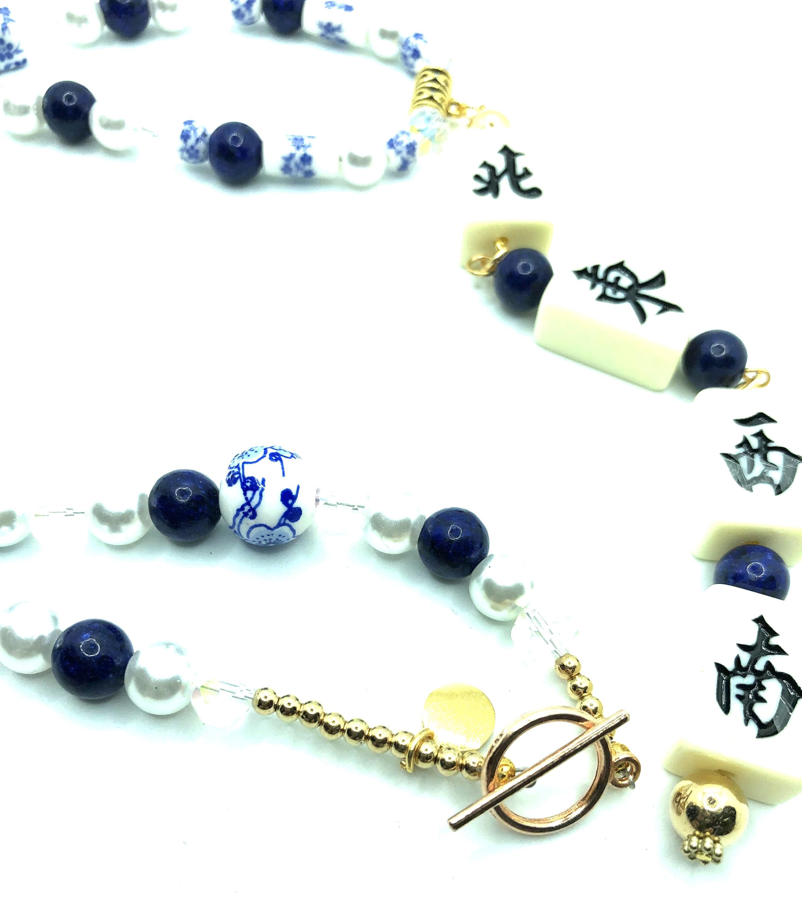 Two 24"necklaces made with blue and white beads, lapis lazuli and crystal beads and pearls. One has normal size mahjong tiles spelling NEWS with a 7" drop. The other has travel size mahjong tiles spelling NEWS with a 6" drop.