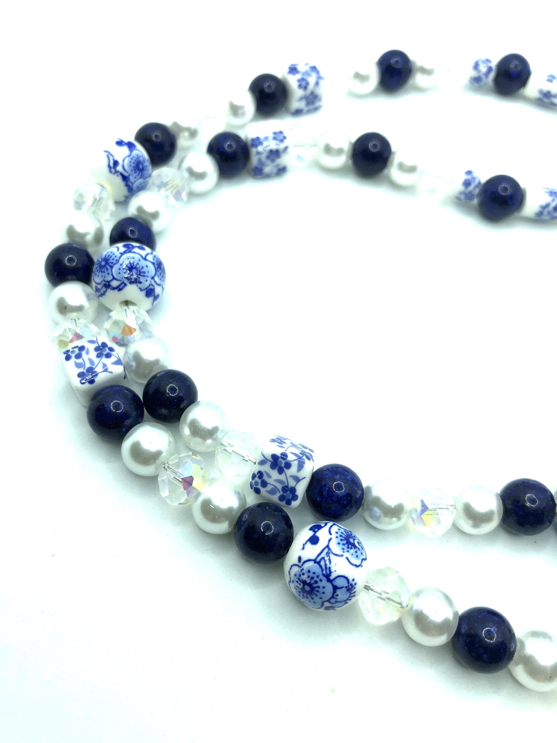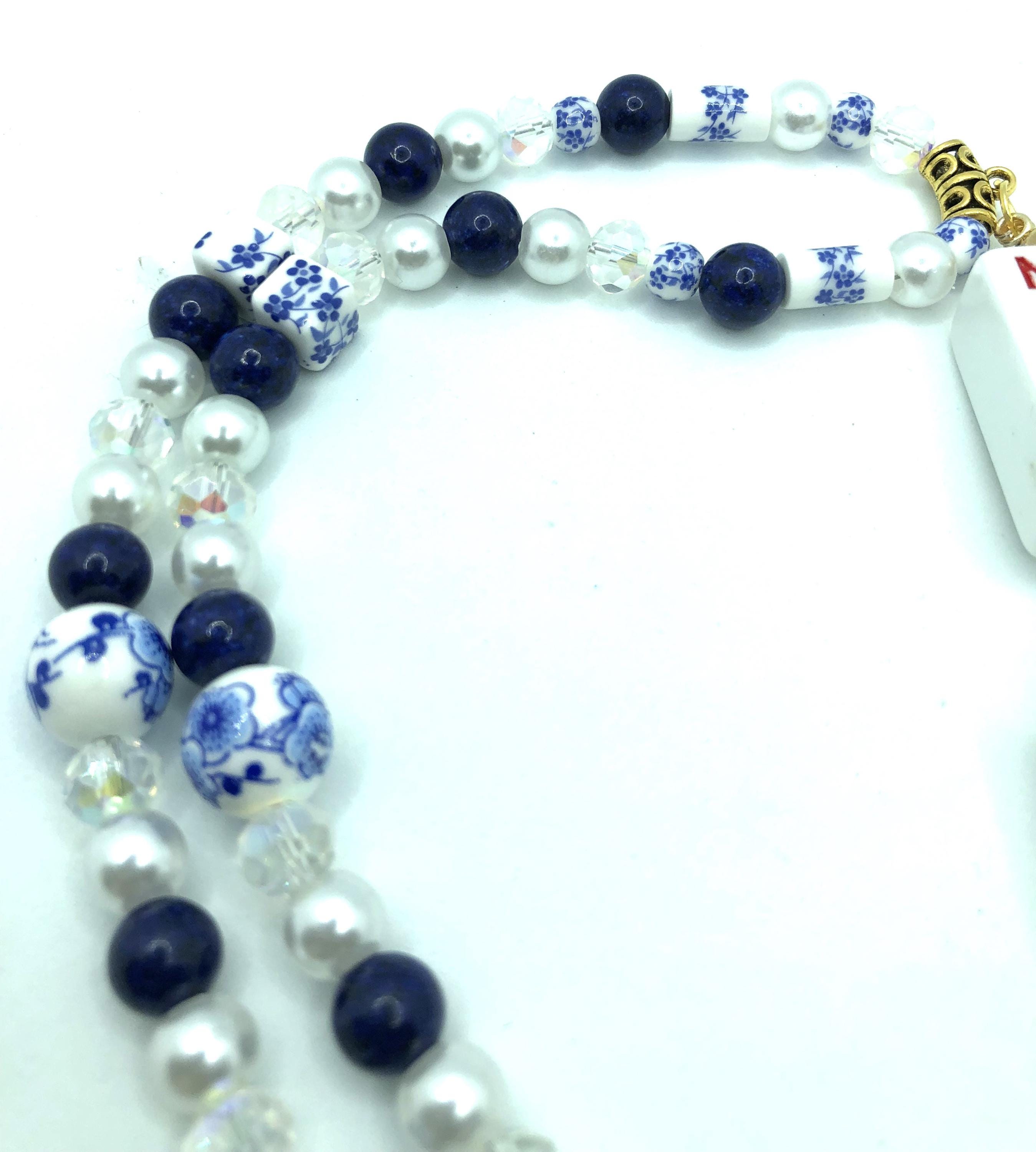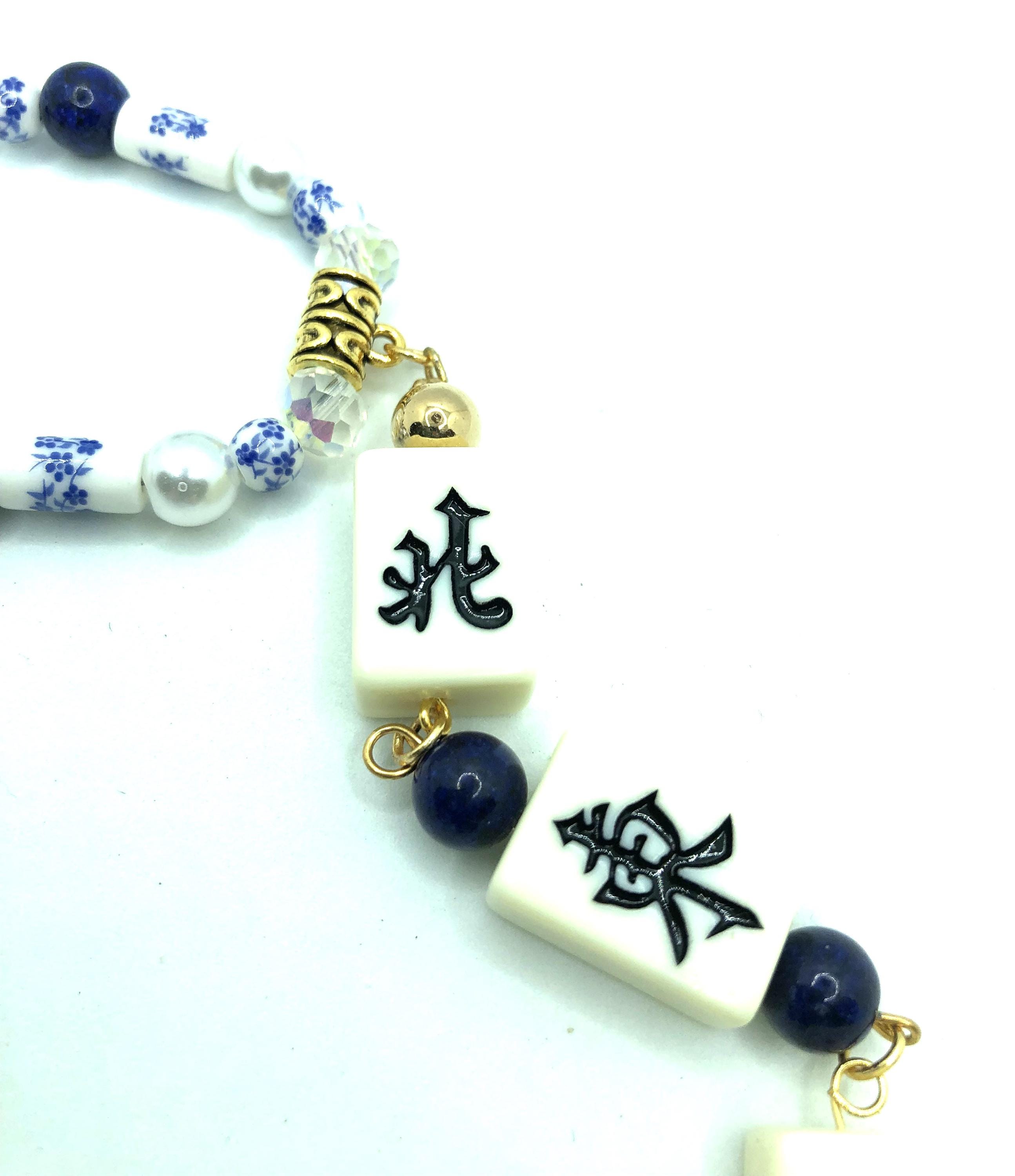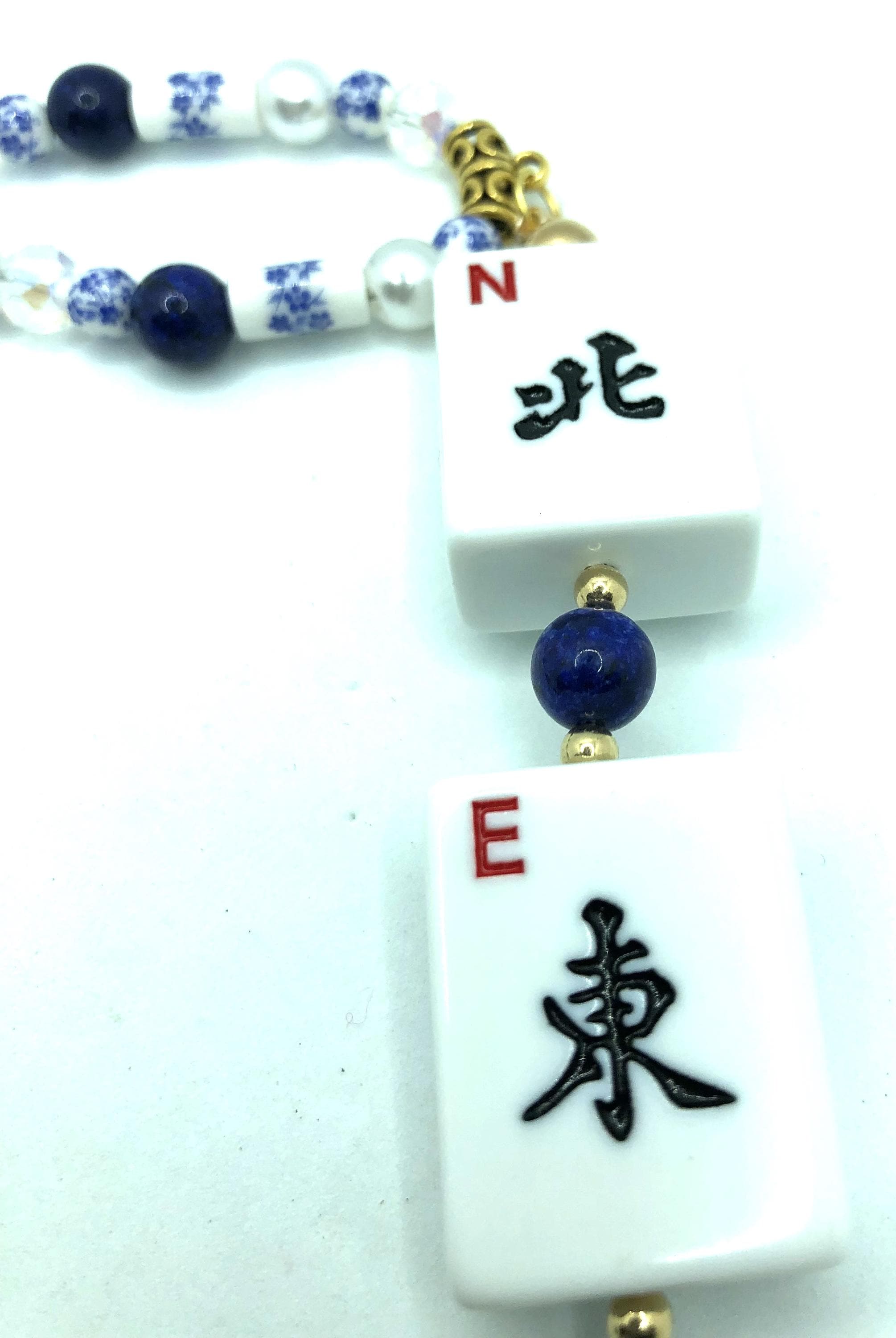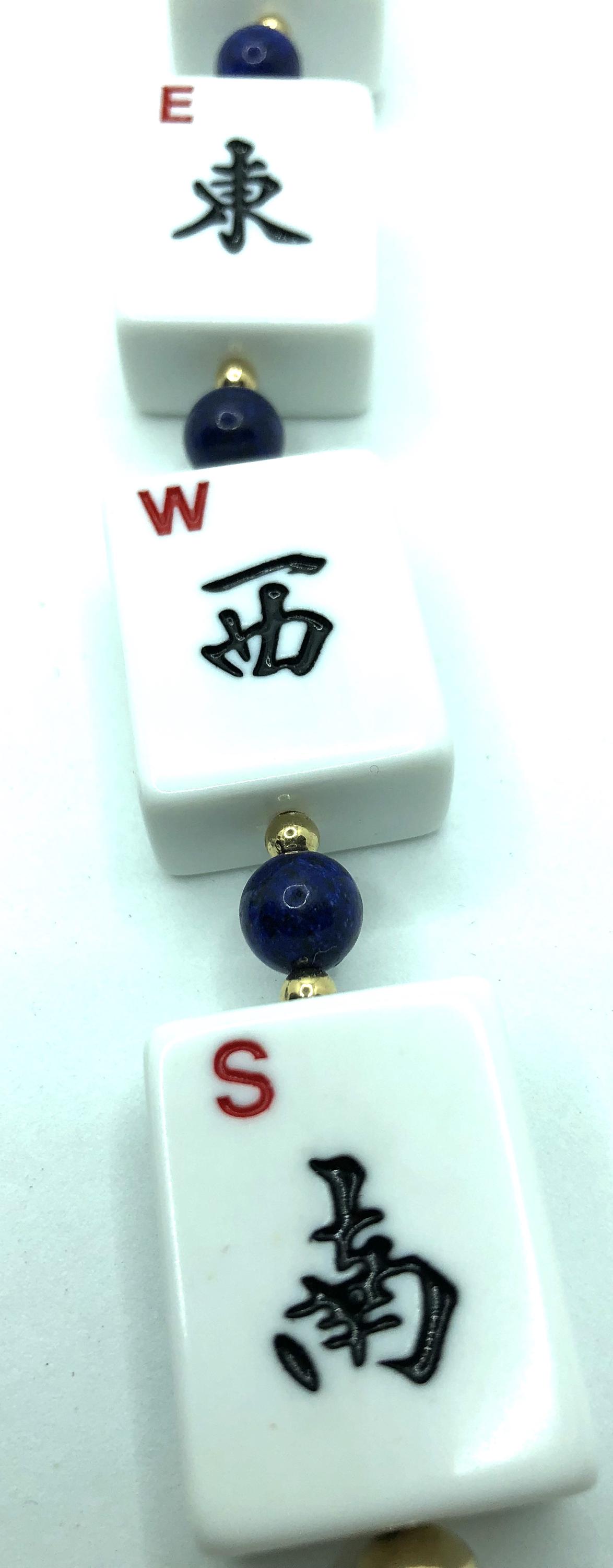 Two 24"necklaces made with blue and white beads, lapis lazuli and crystal beads and pearls. One has normal size mahjong tiles spelling NEWS with a 7" drop. The other has travel size mahjong tiles spelling NEWS with a 6" drop.