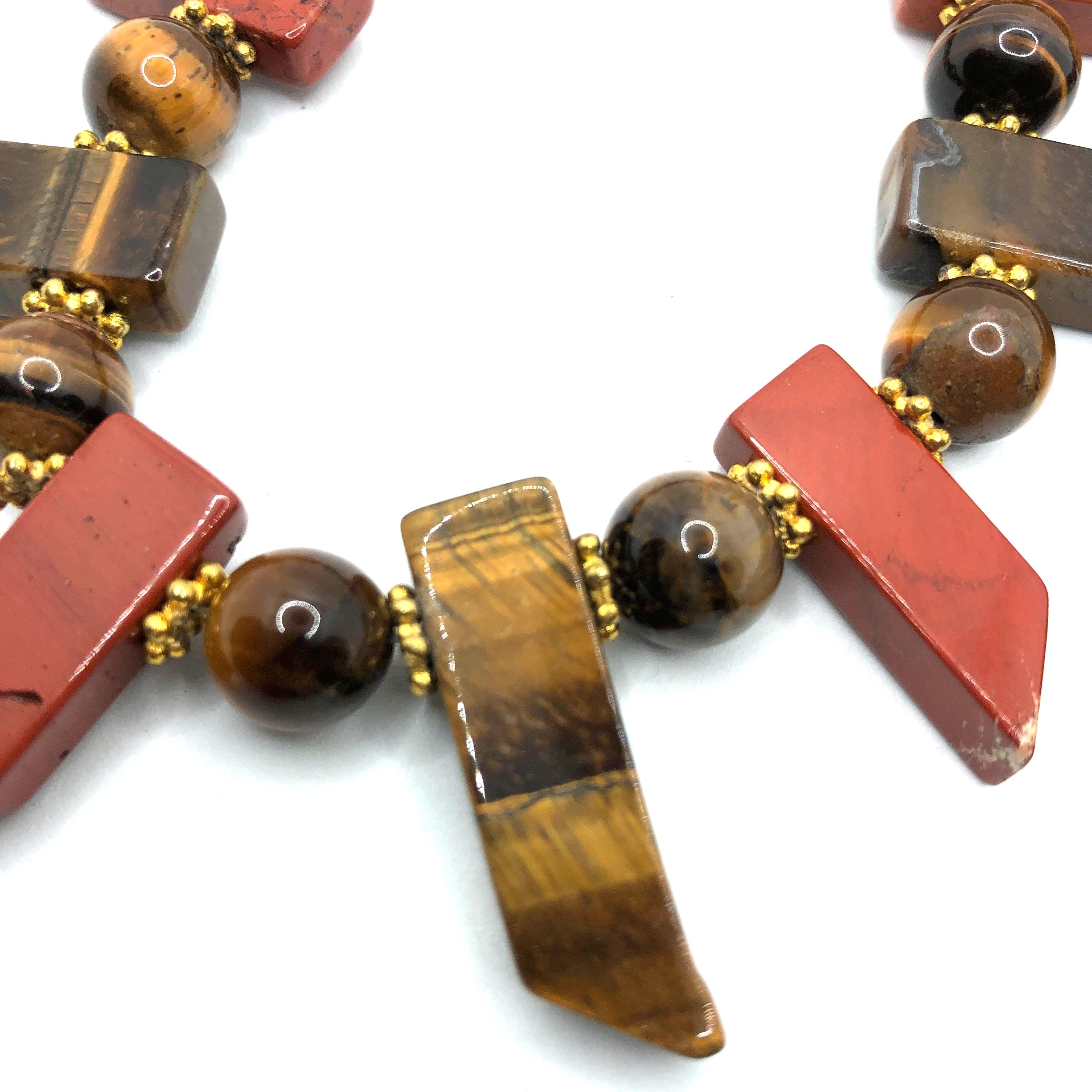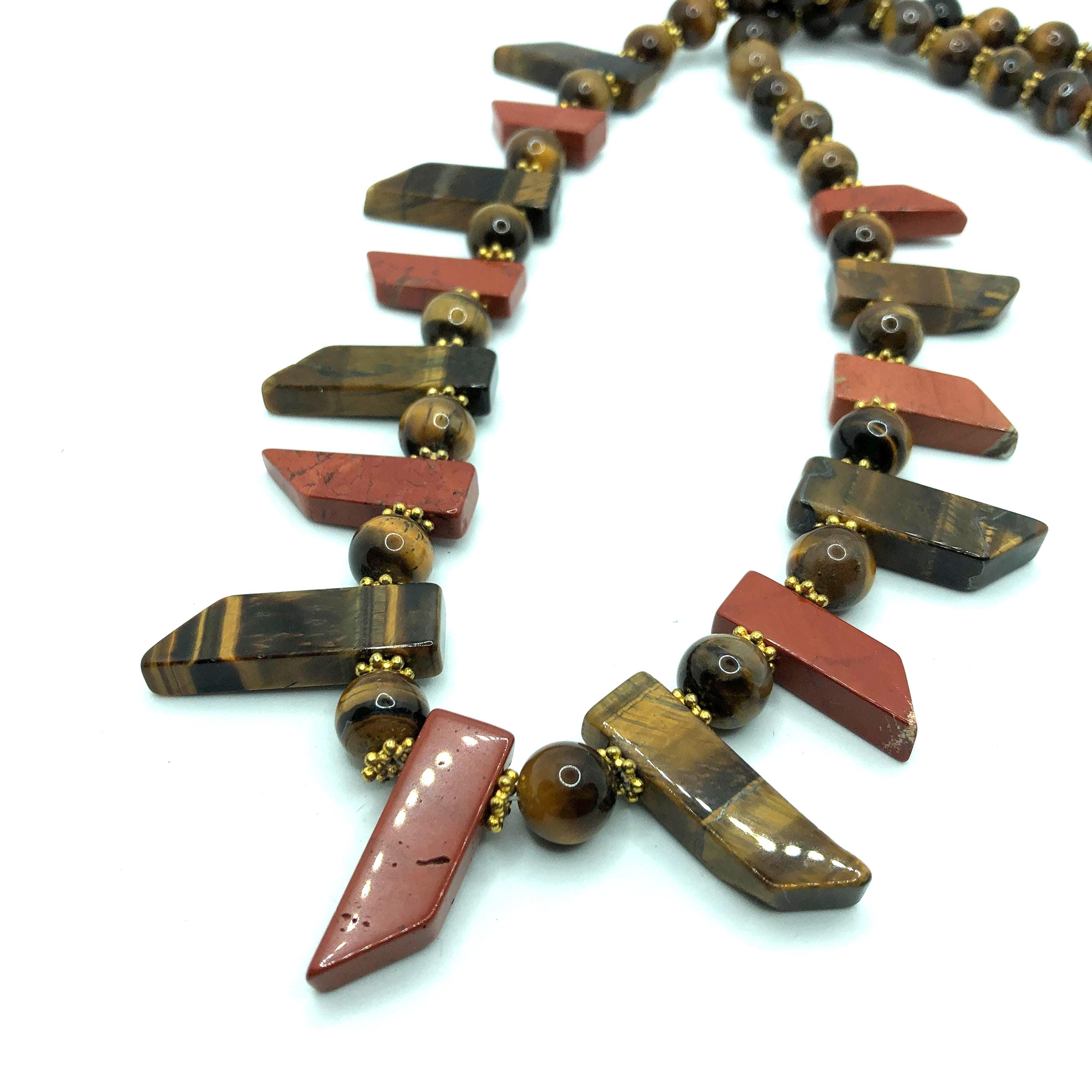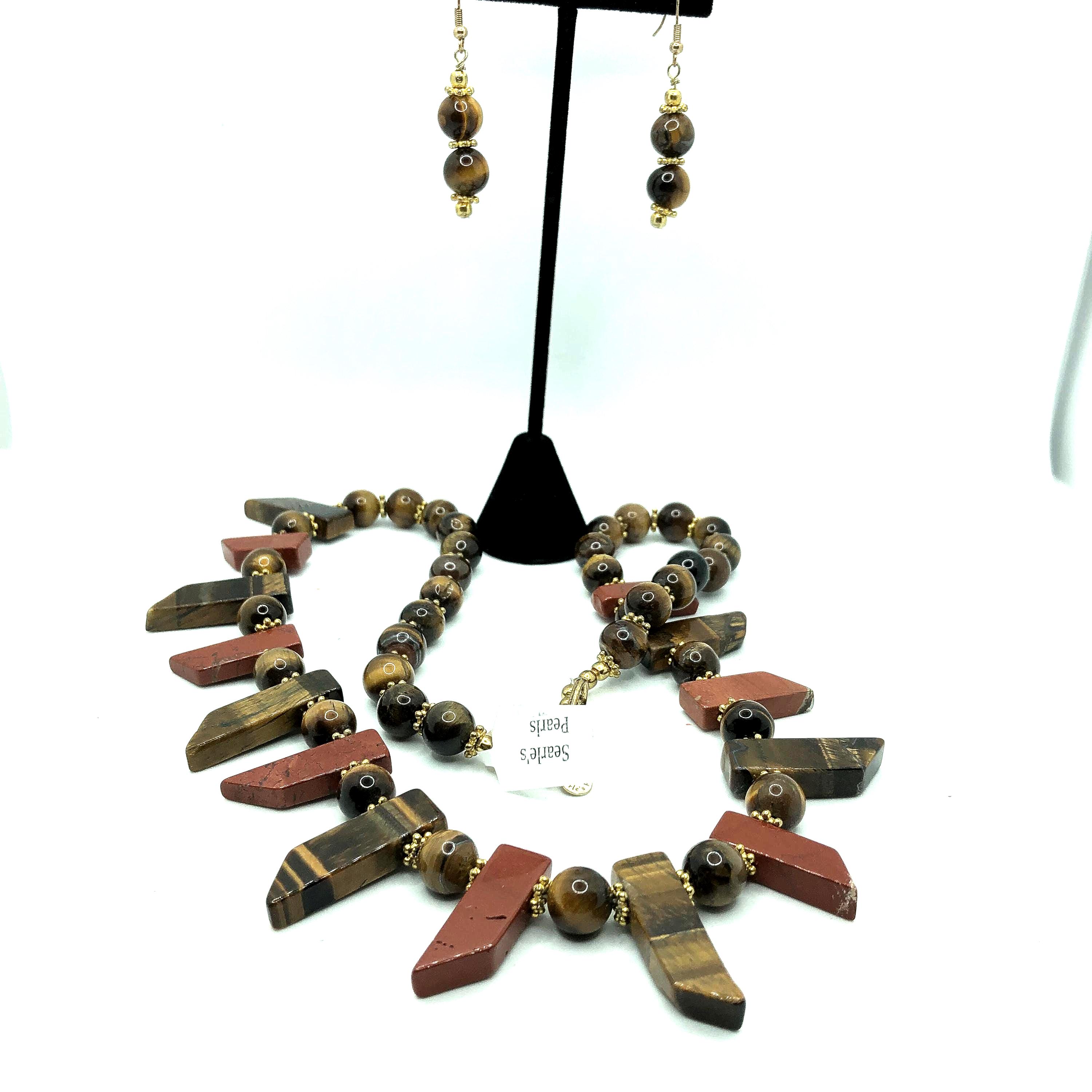 Tiger's eye necklace is 24" long with round and spear shaped beads and golden spacer beads. The earrings are 2" long and made of 2 tiger's eye beads and golden spacers. These items are sold as a set.