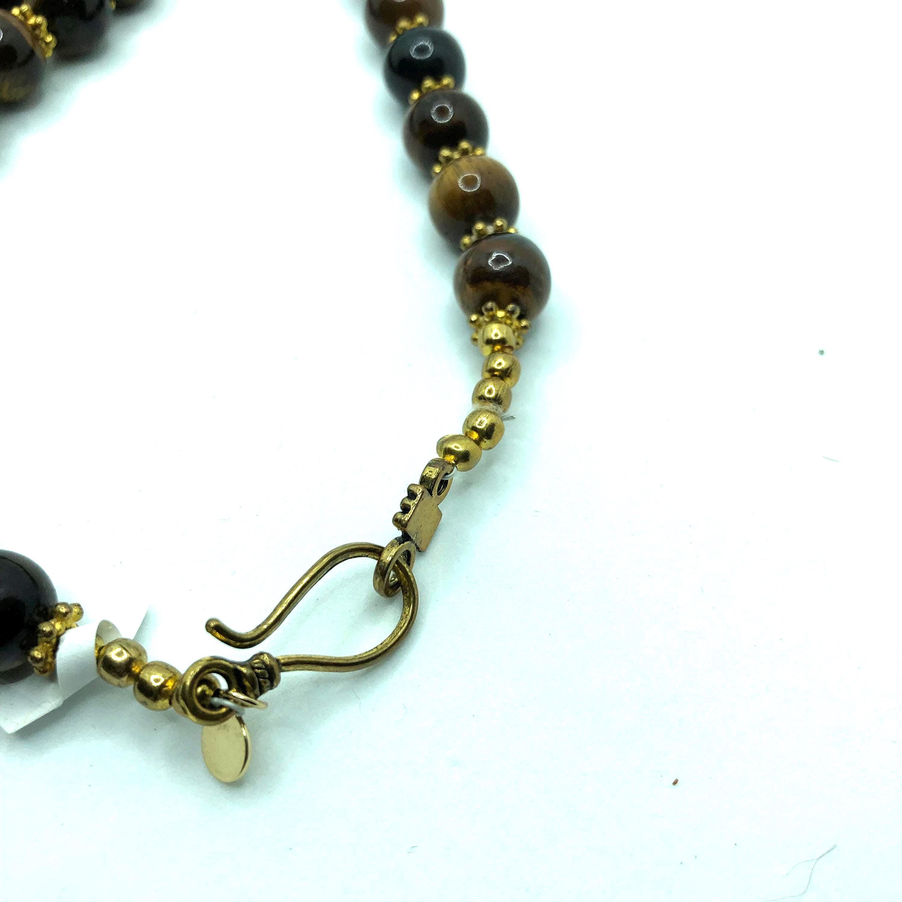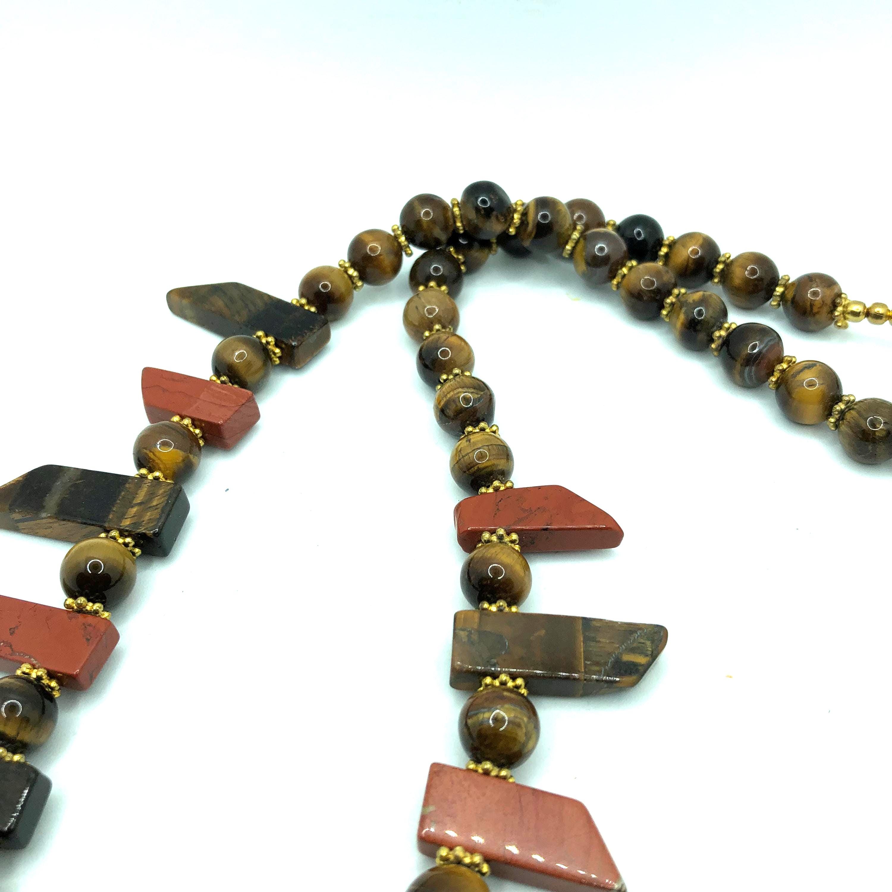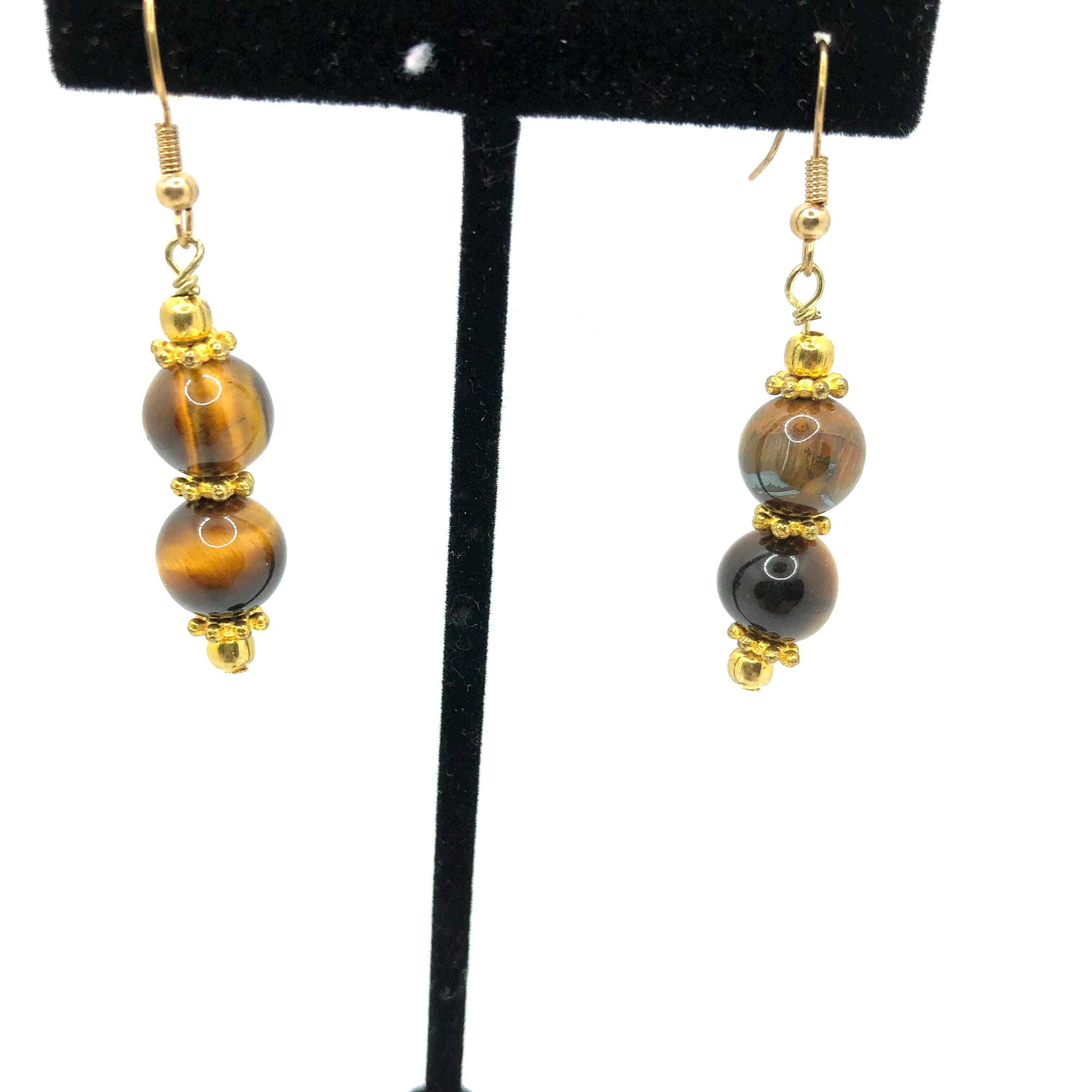 The necklace is 24" long and is made of round and spike shaped beads with golden spacers. The earrings are 2" long and are made of 2 tiger's eye beads and golden spacer beads.