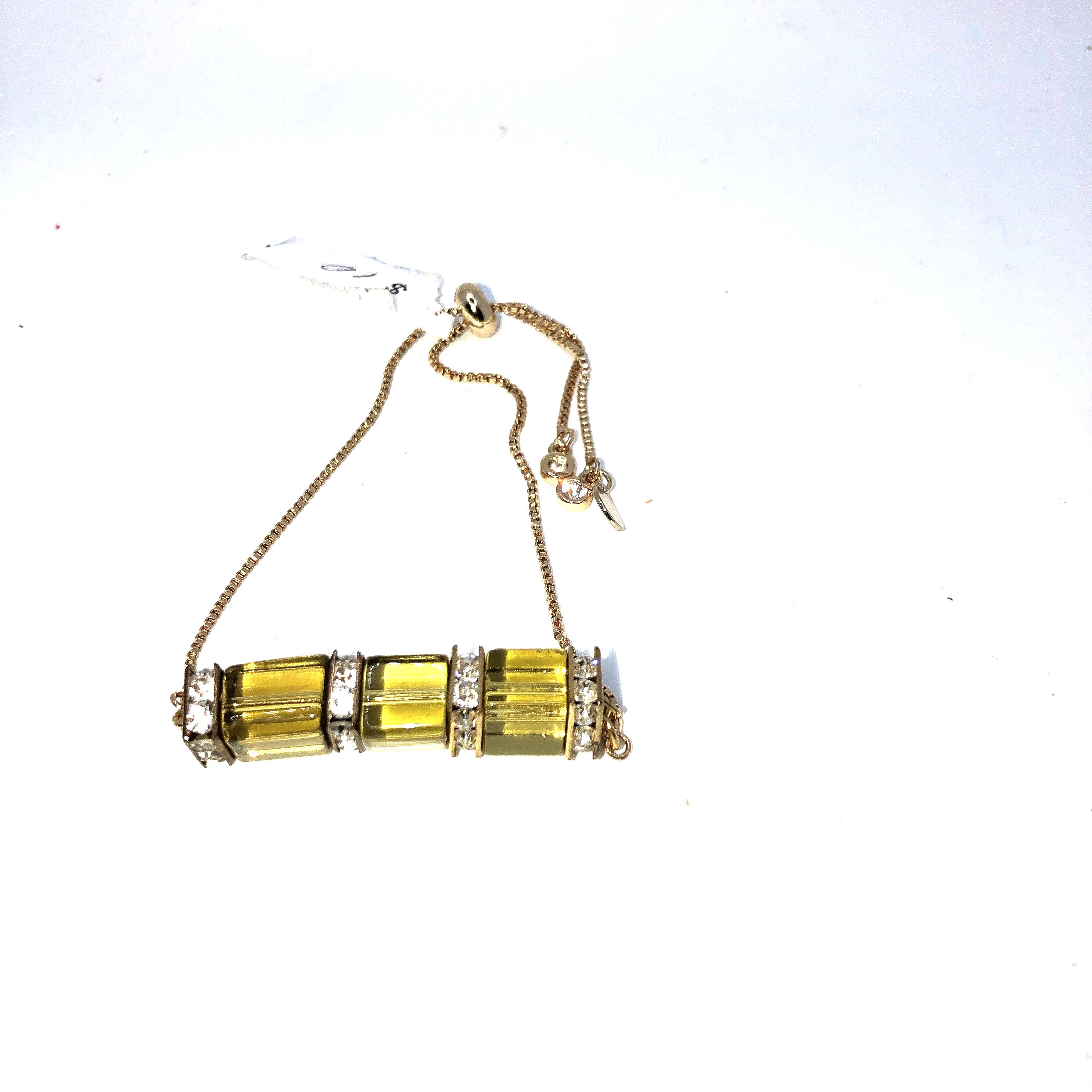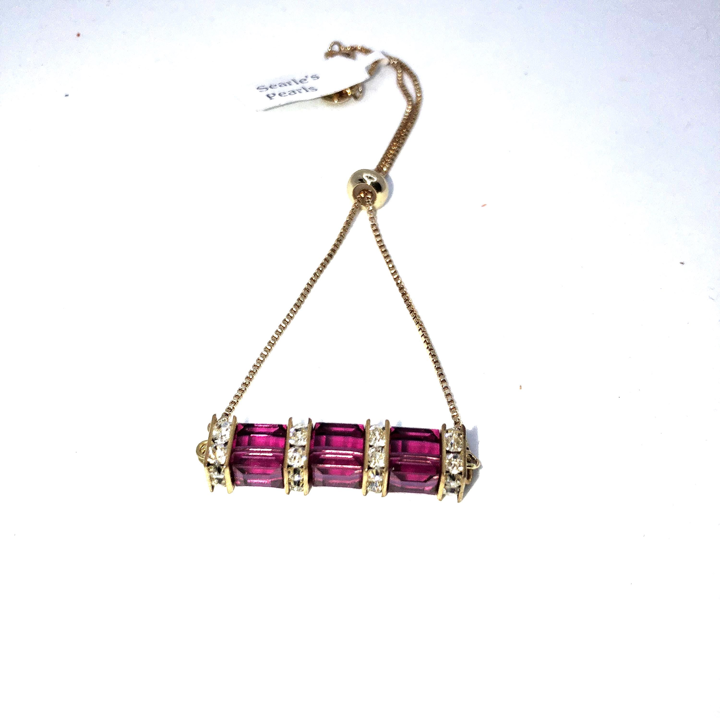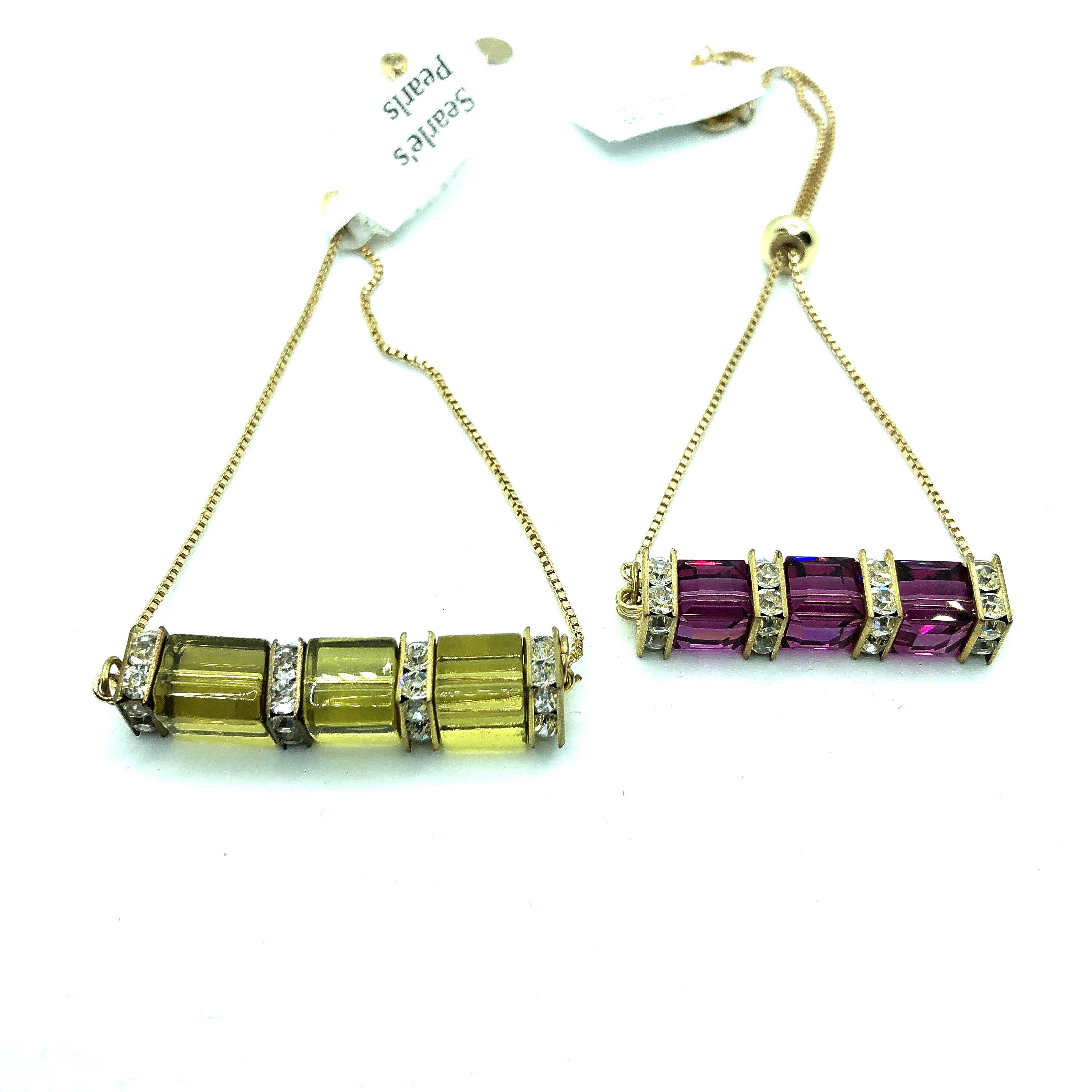 Crystal bracelets with a variable length in 2 colors of crystals: cranberry and green/gold. Separated with small clear crystals. These bracelets can adjust to any size.