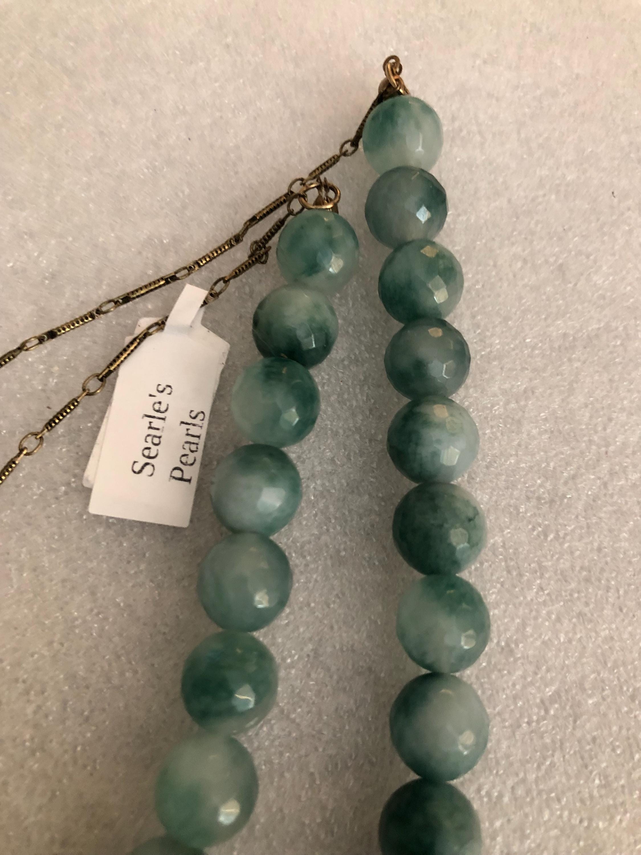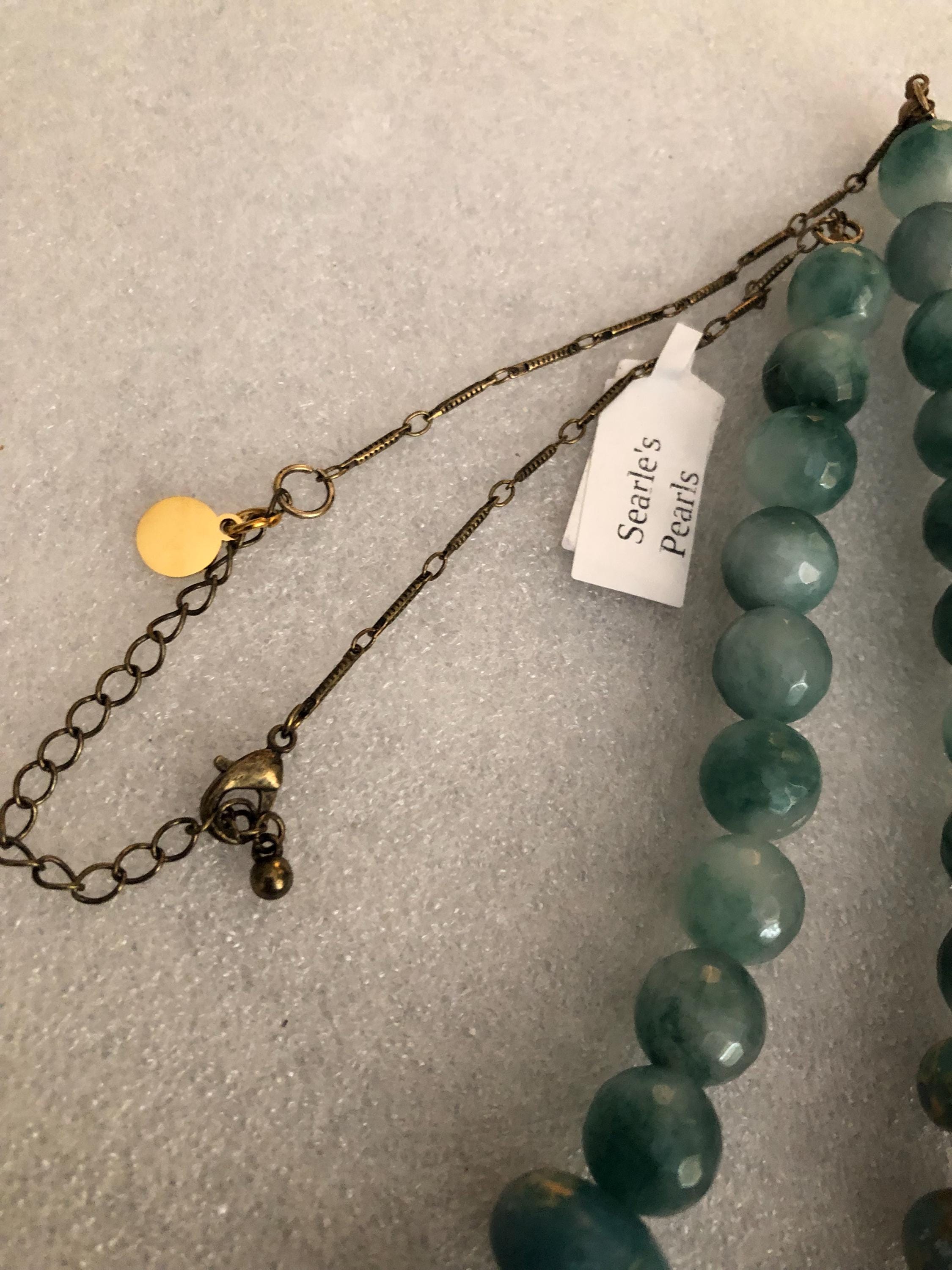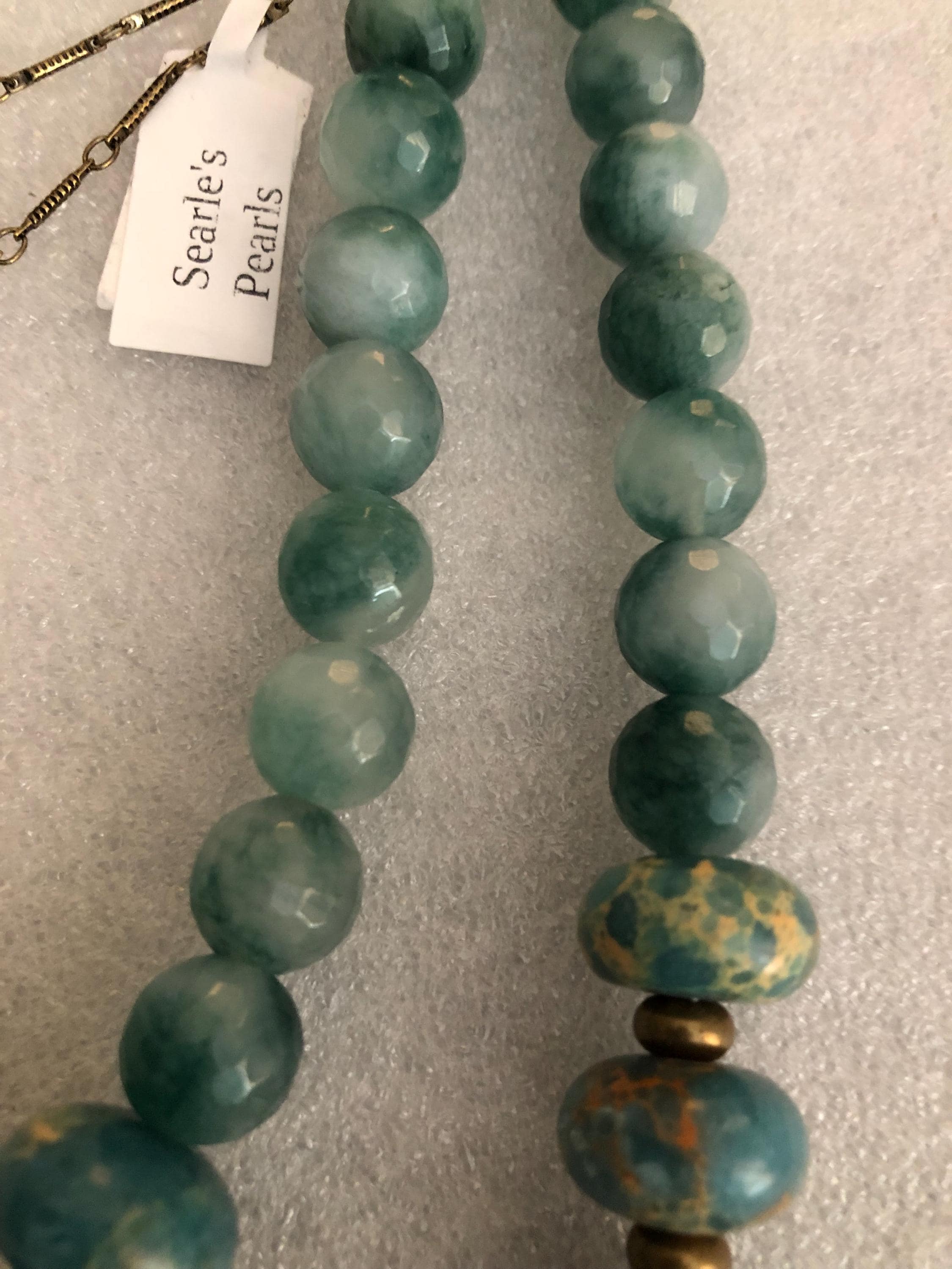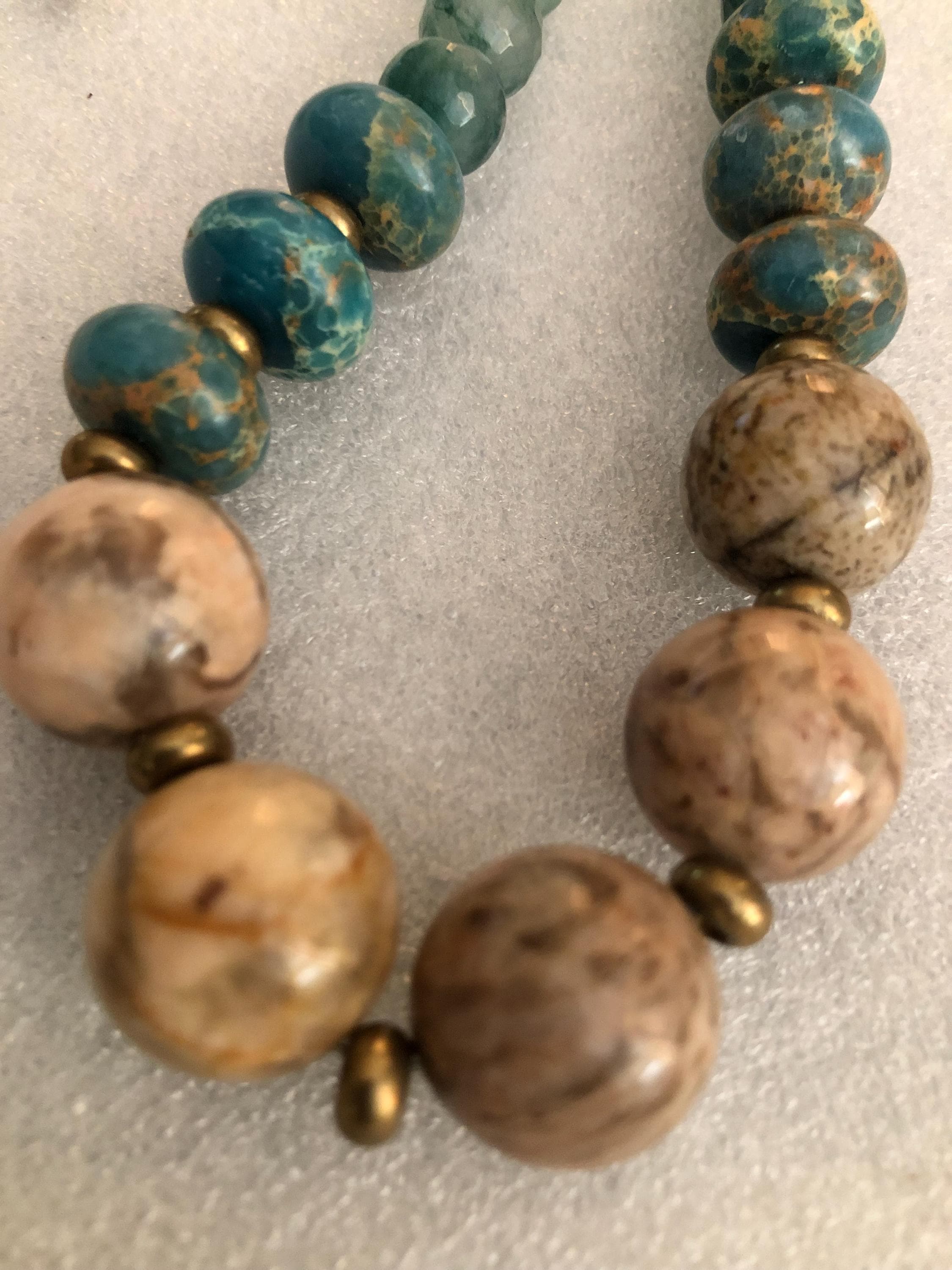 This 24" necklace is made of tan and blue agates with blue crystals.