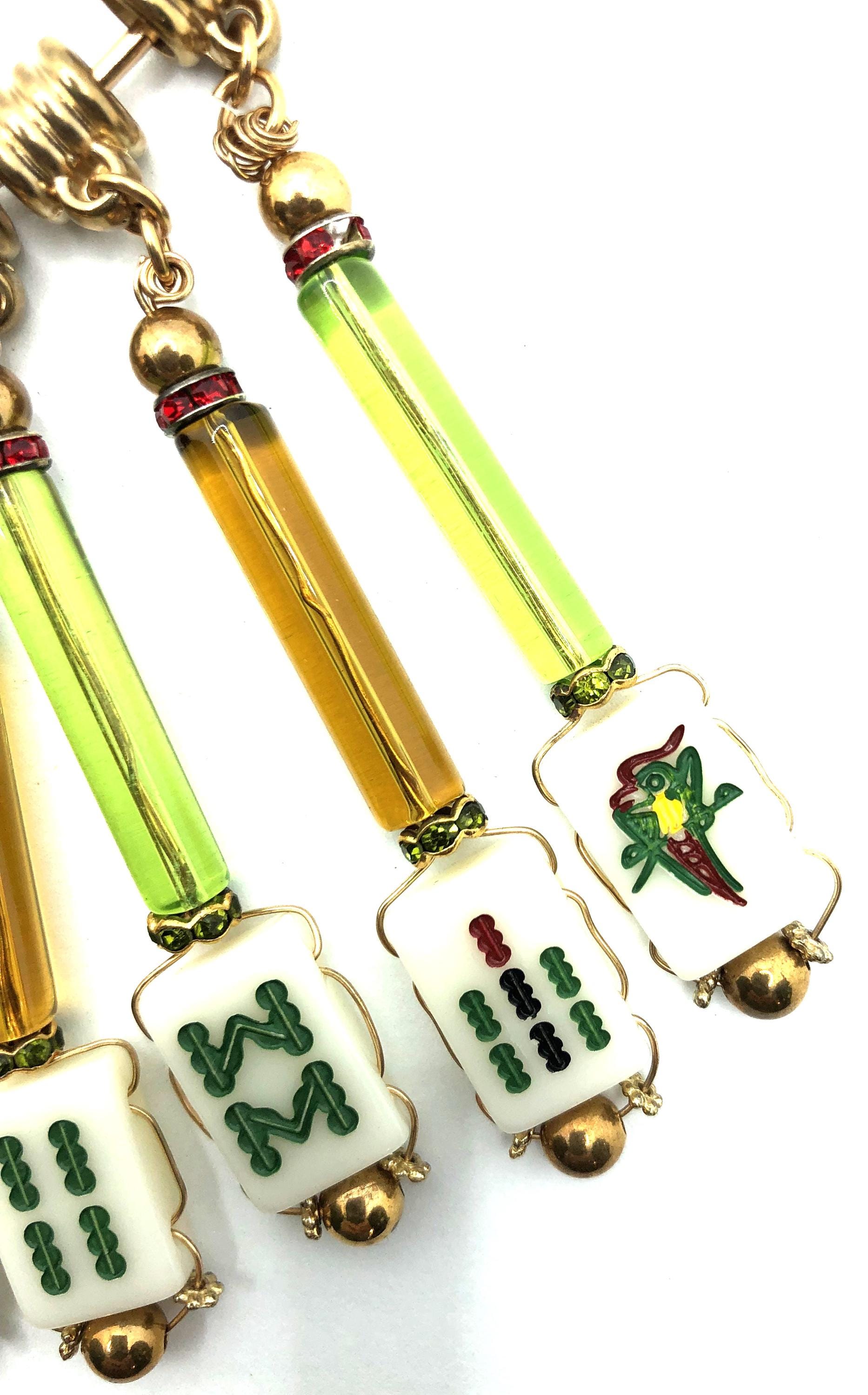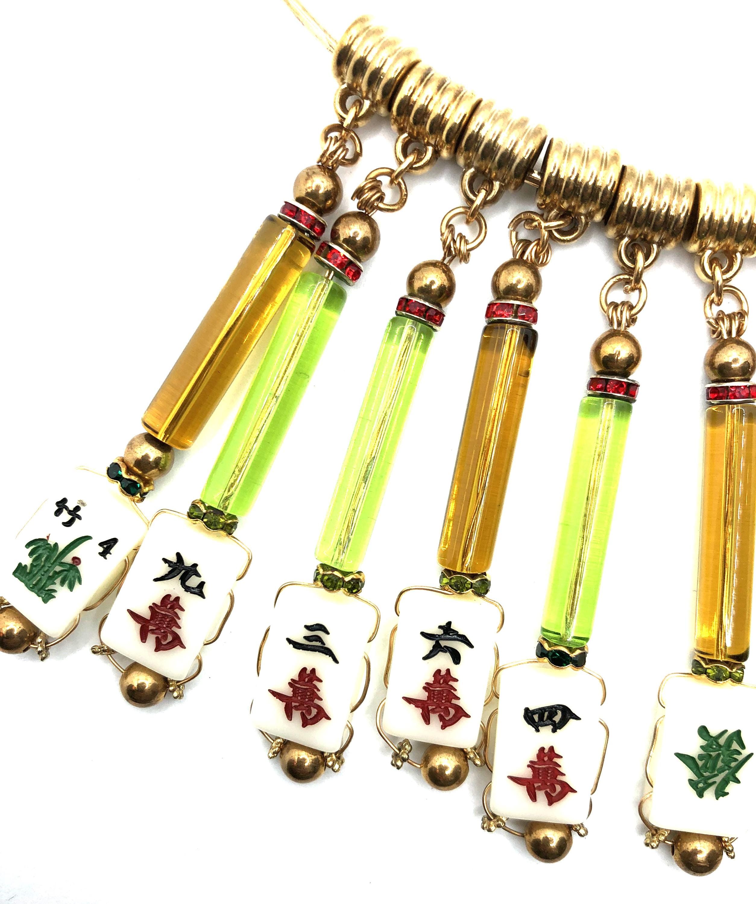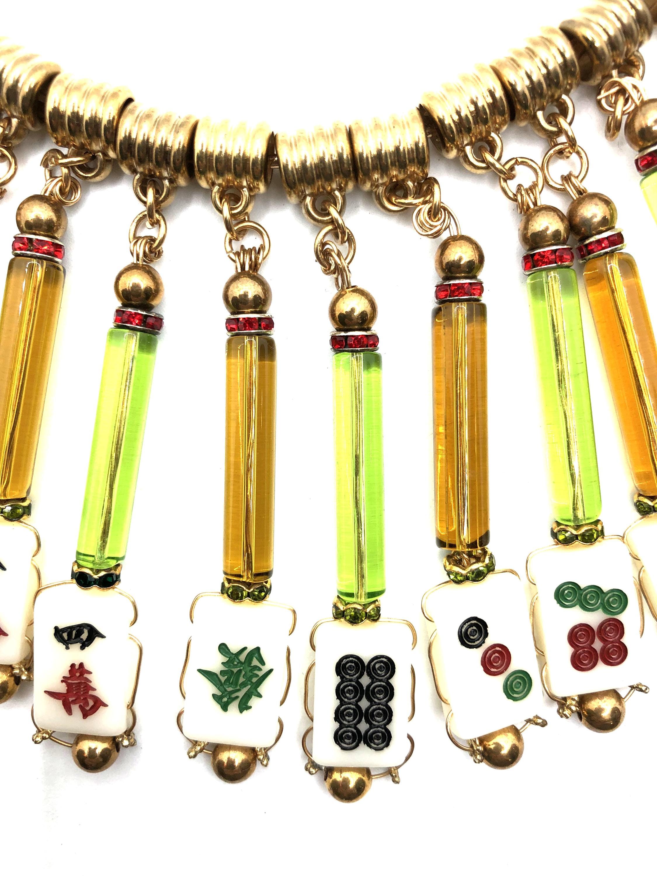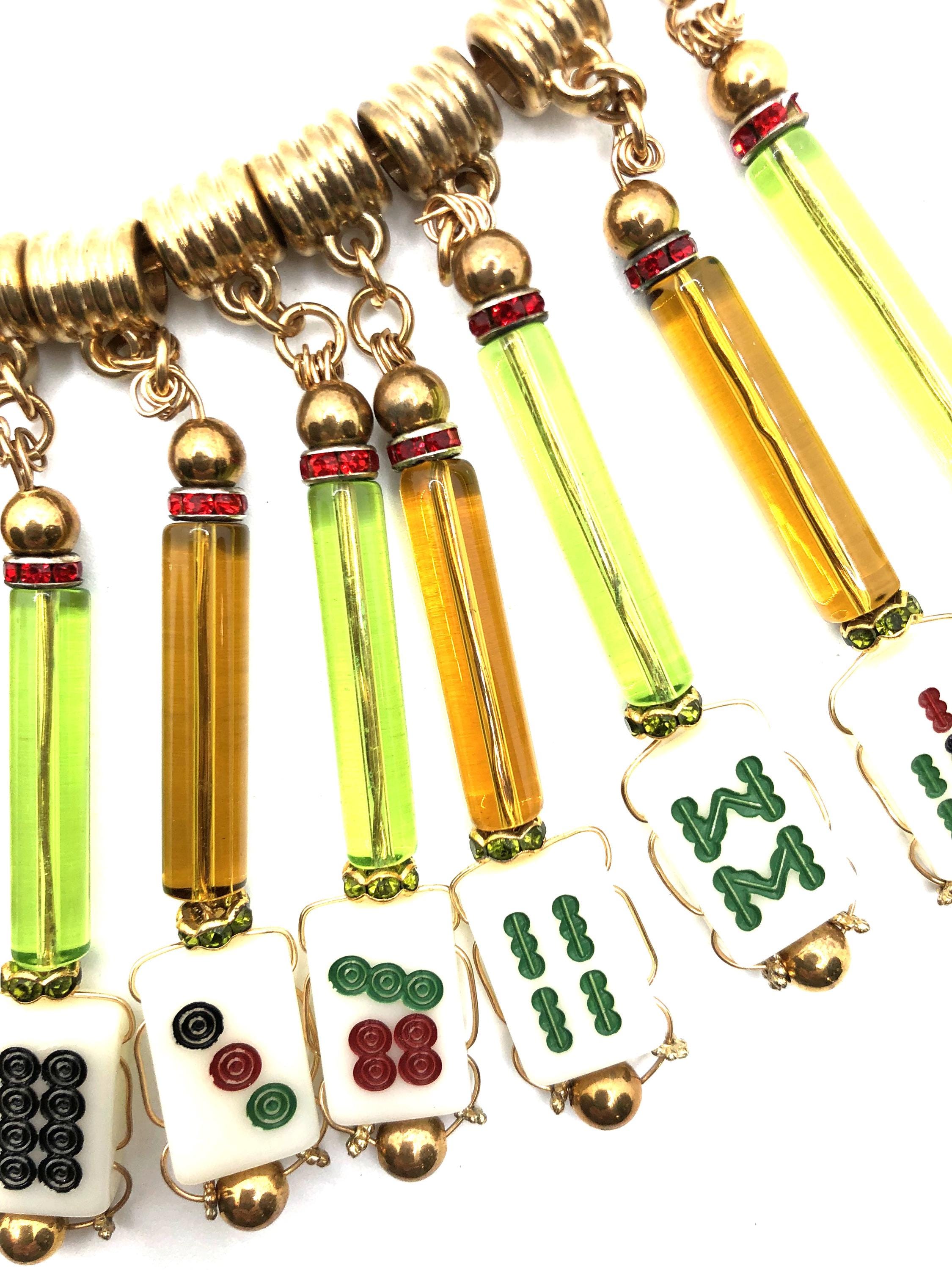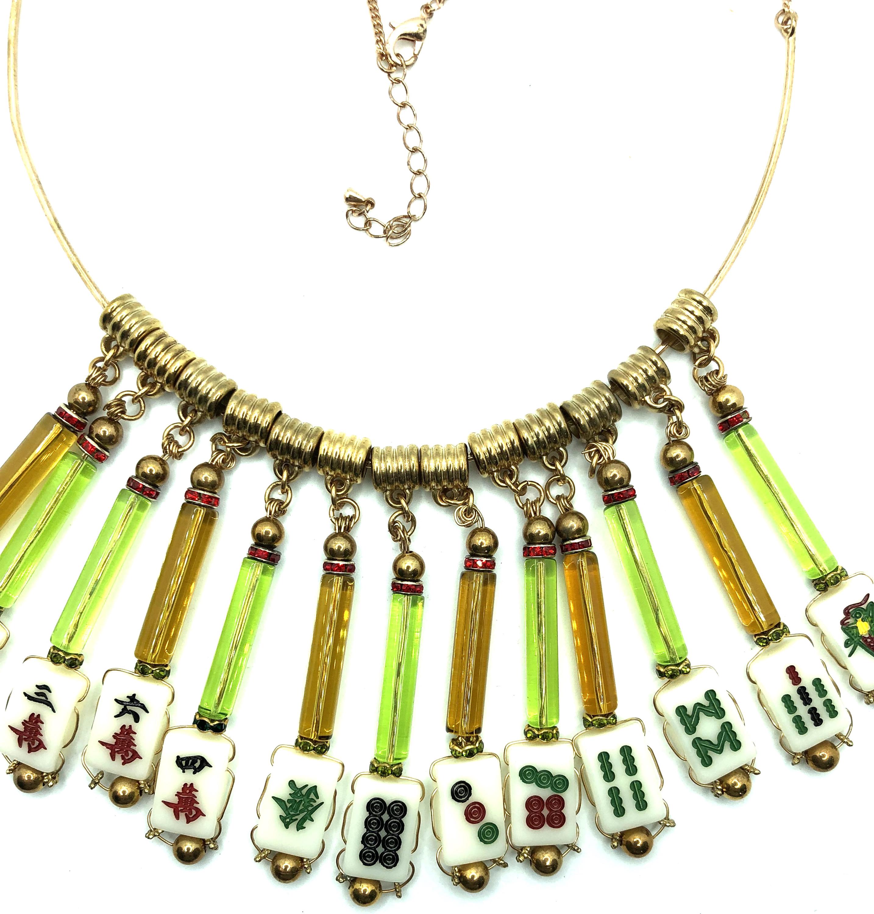 Mahjong collar necklace with 13 green and gold glass tubes and 13 small tiles.