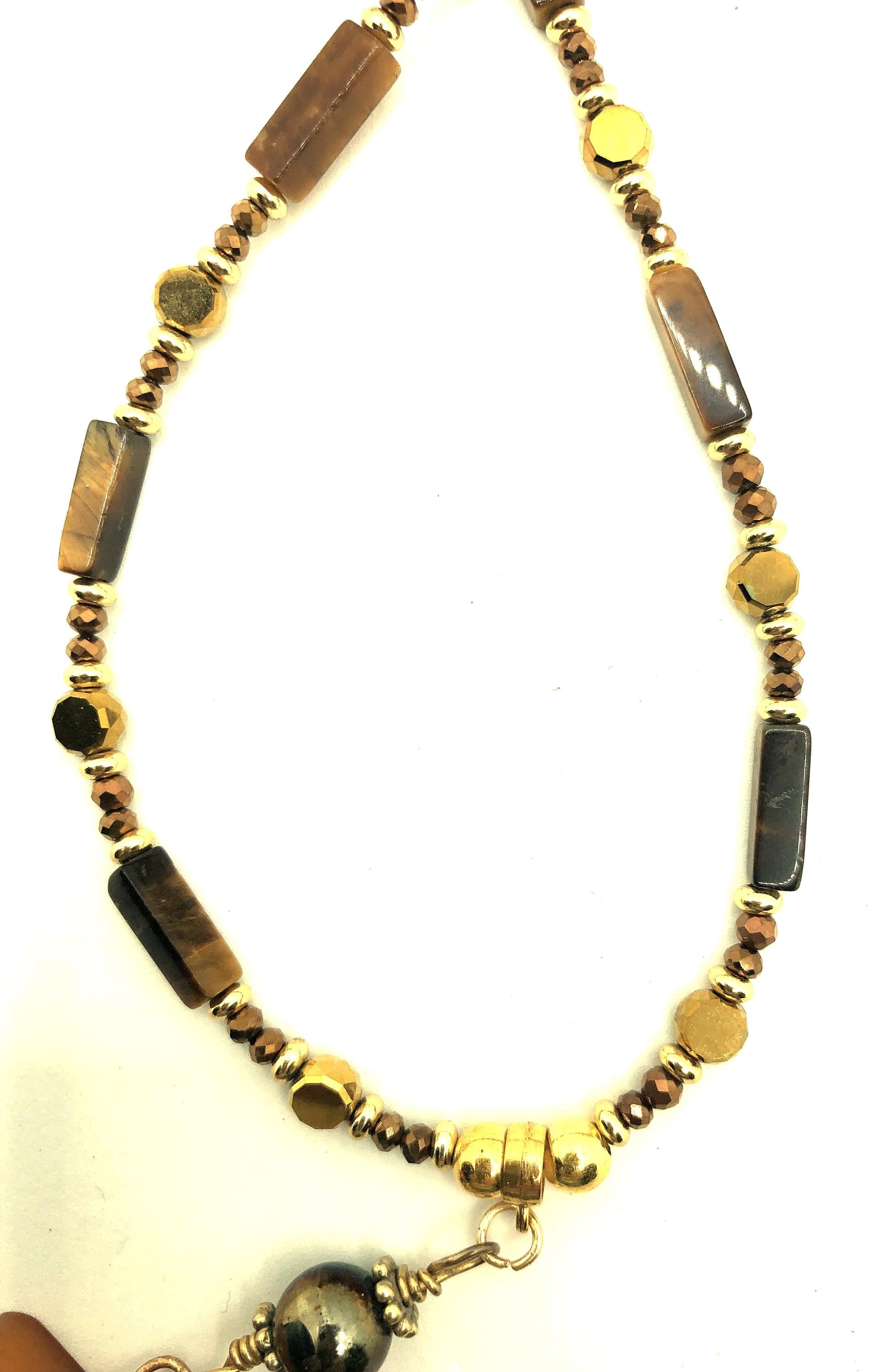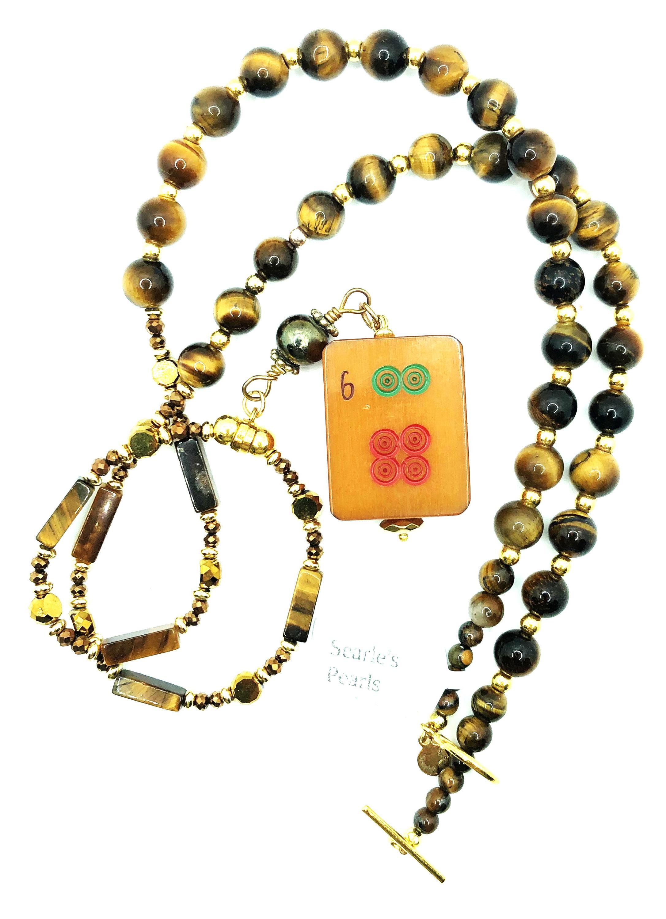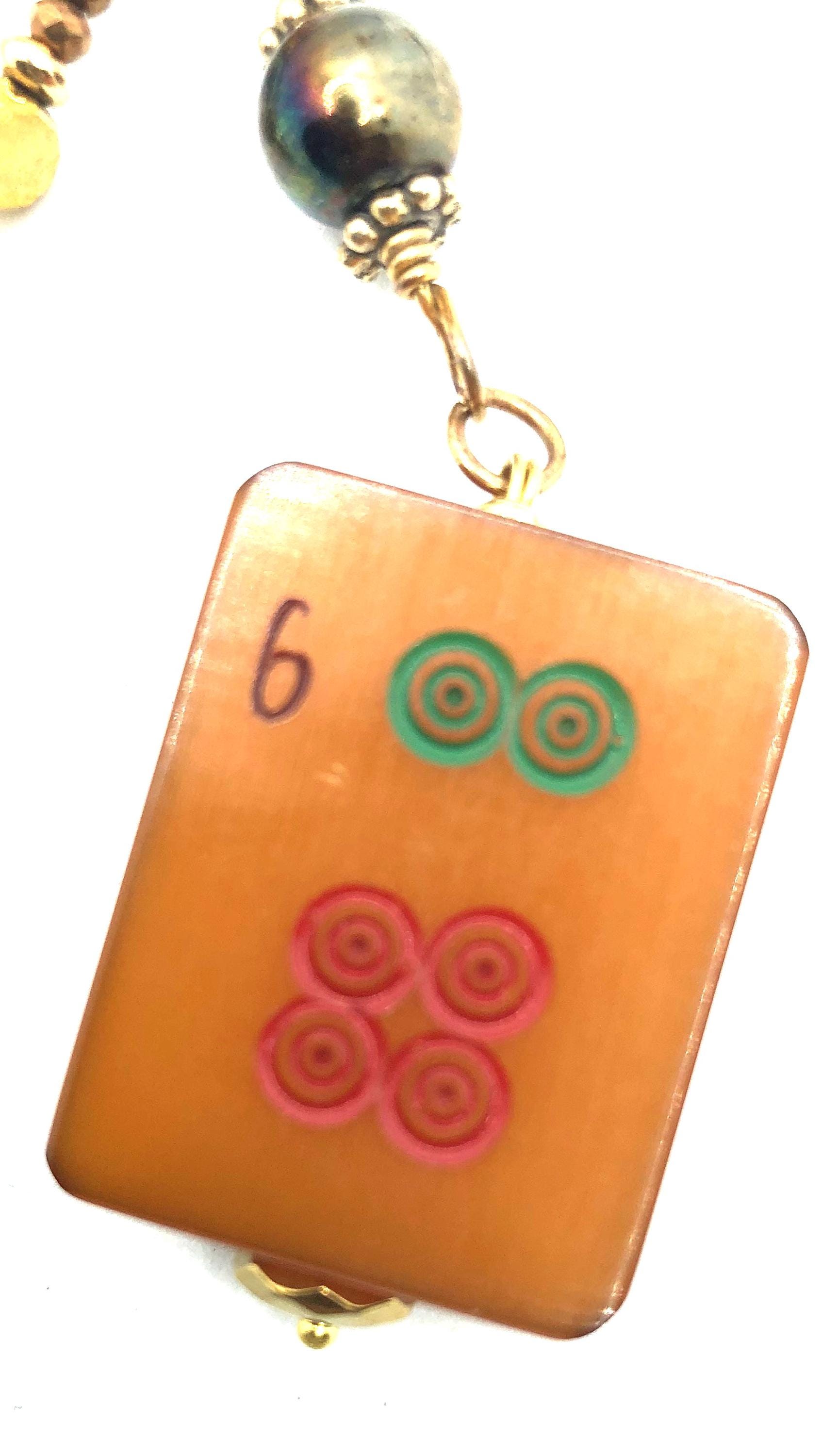 This is a 14.5" mahjong necklace with round and long shaped cat's eye beads which are interspersed with small, golden beads. It has a 3" pendant with an antique Bakelite 6 dot tile