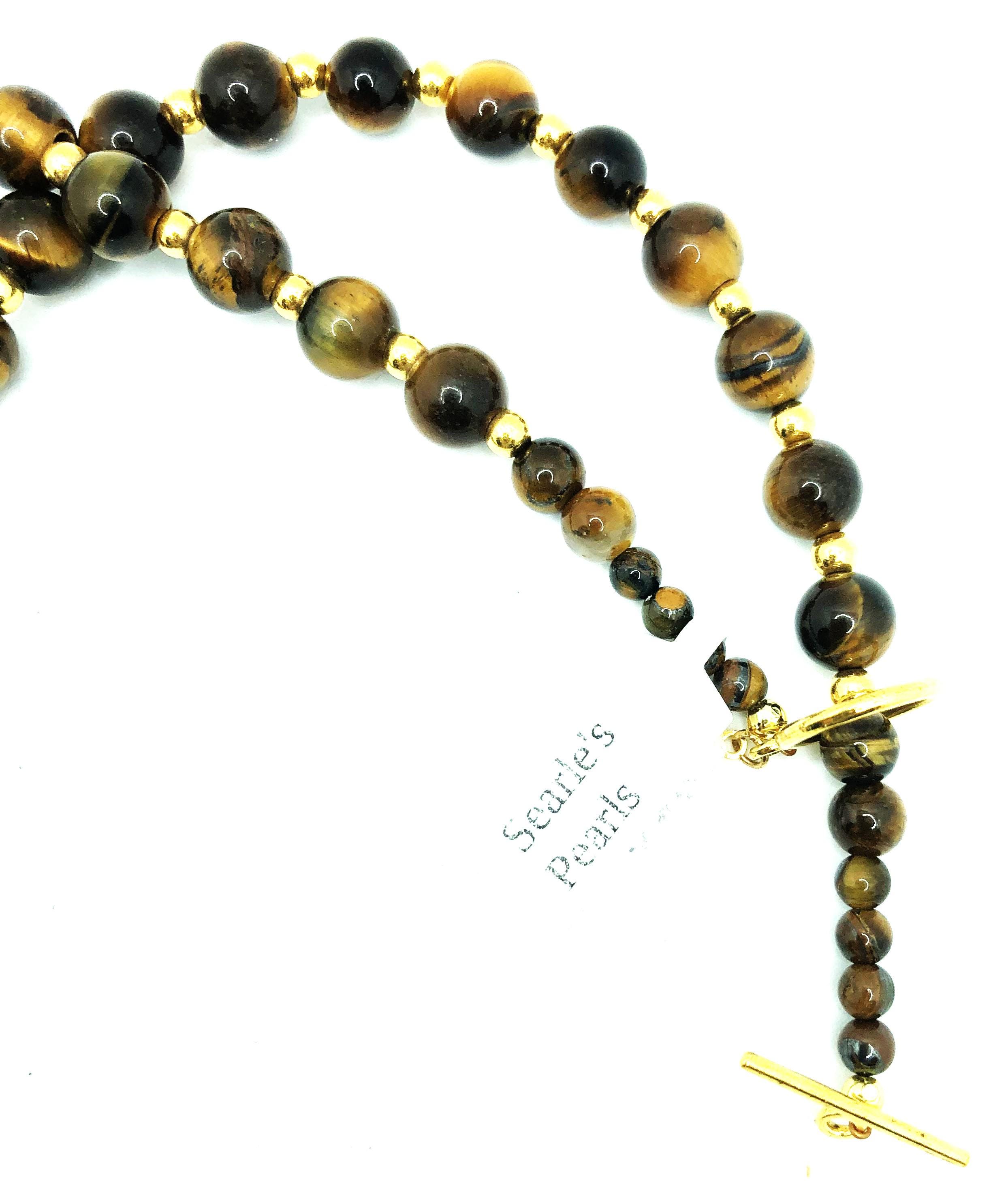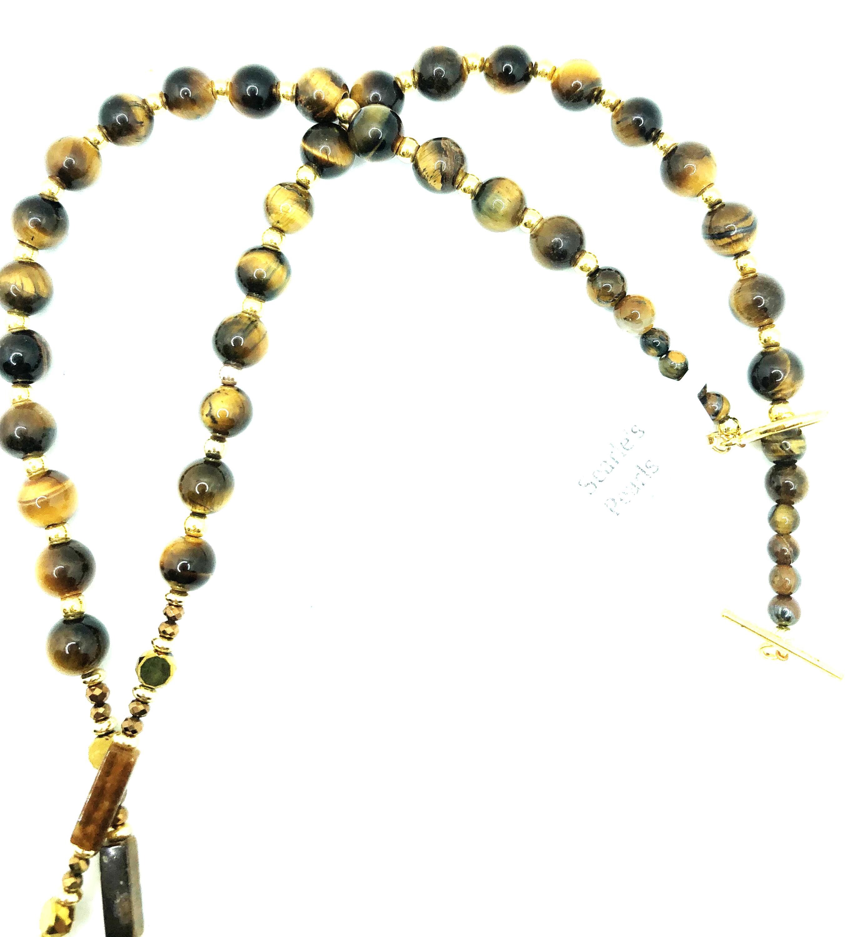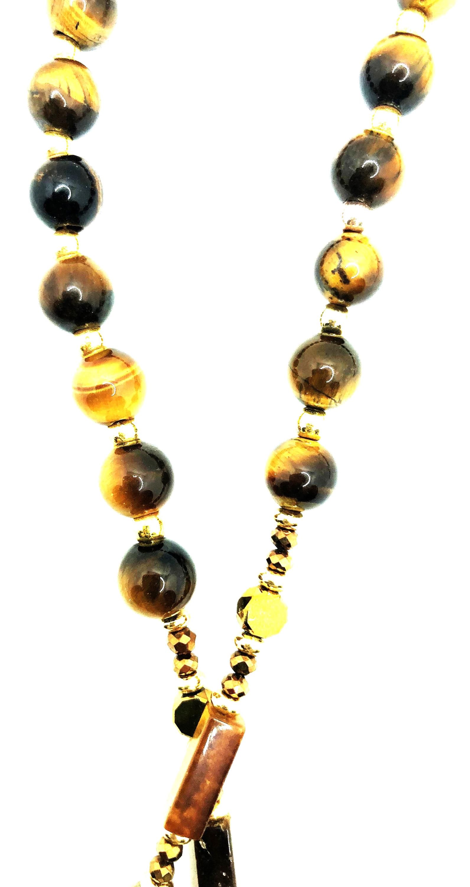 This is a 14.5" mahjong necklace with round and long shaped cat's eye beads which are interspersed with small, golden beads. It has a 3" pendant with an antique Bakelite 6 dot tile