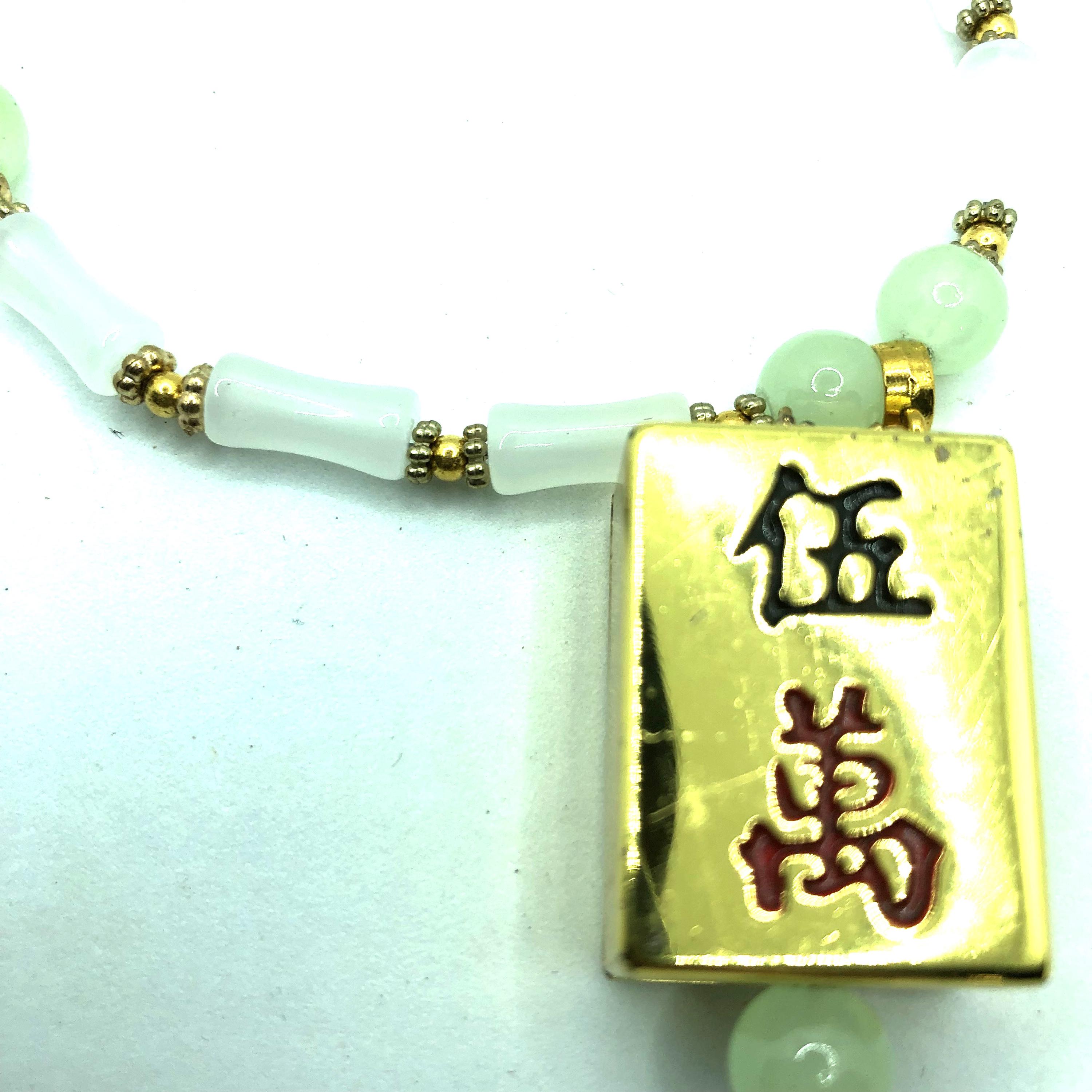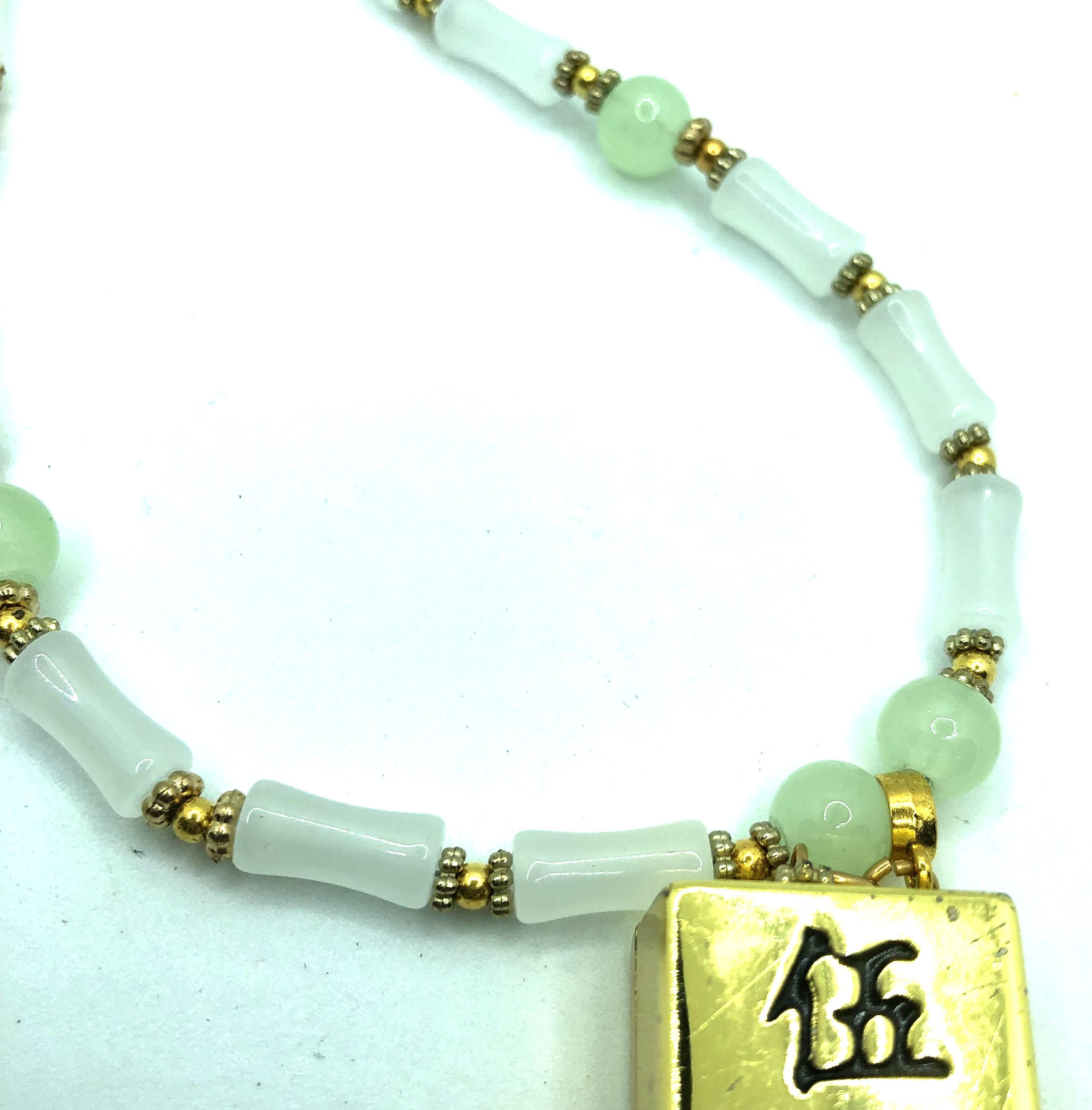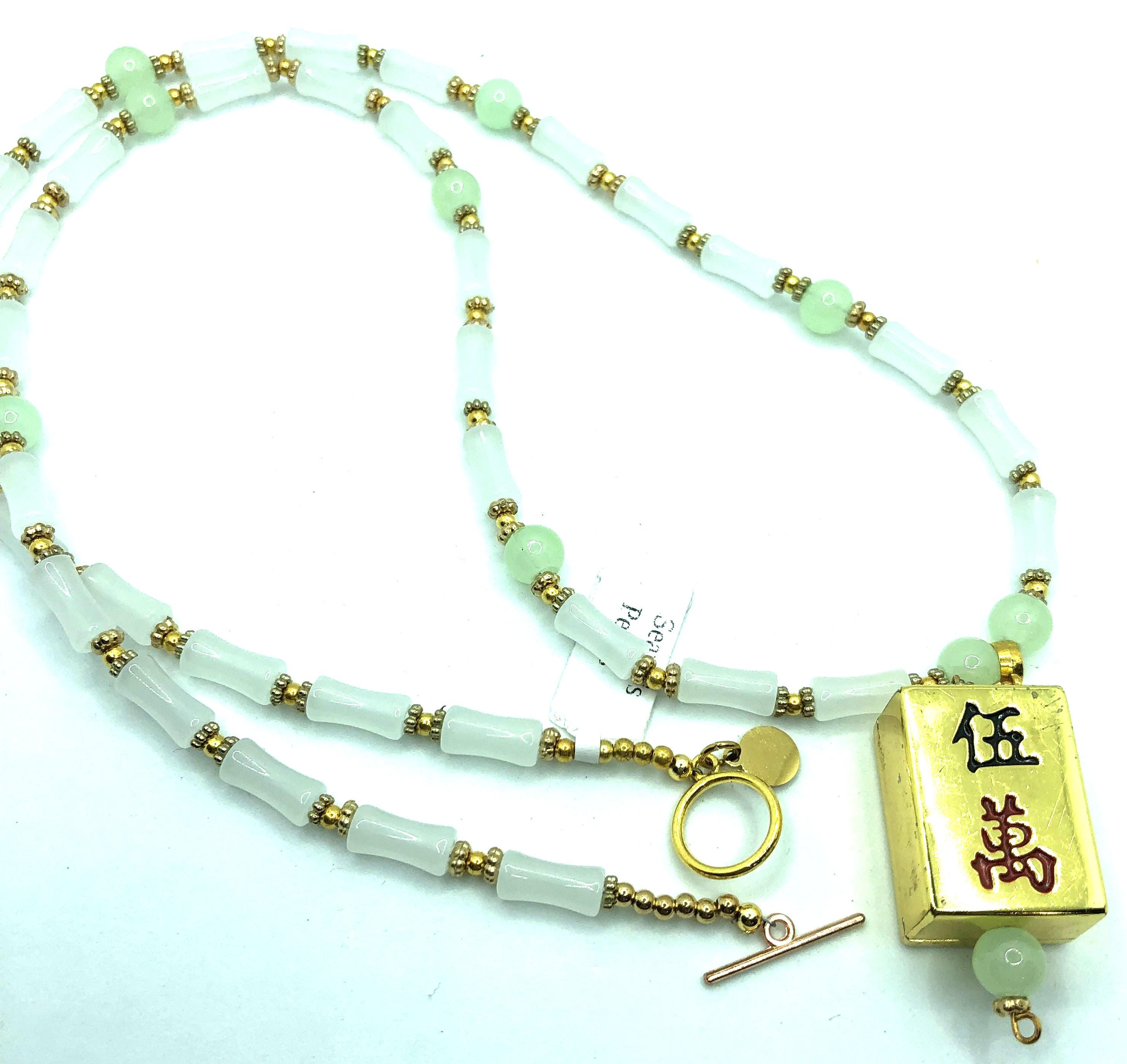 This 17" necklace is made of pale green jade and golden beads with a 2" pendent made of a golden metal crack tile.
