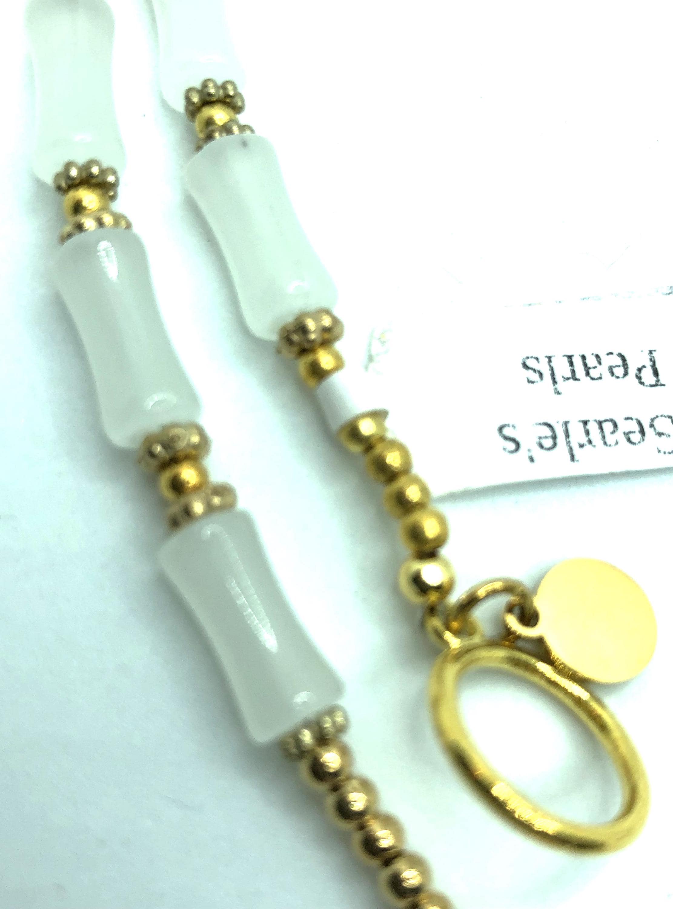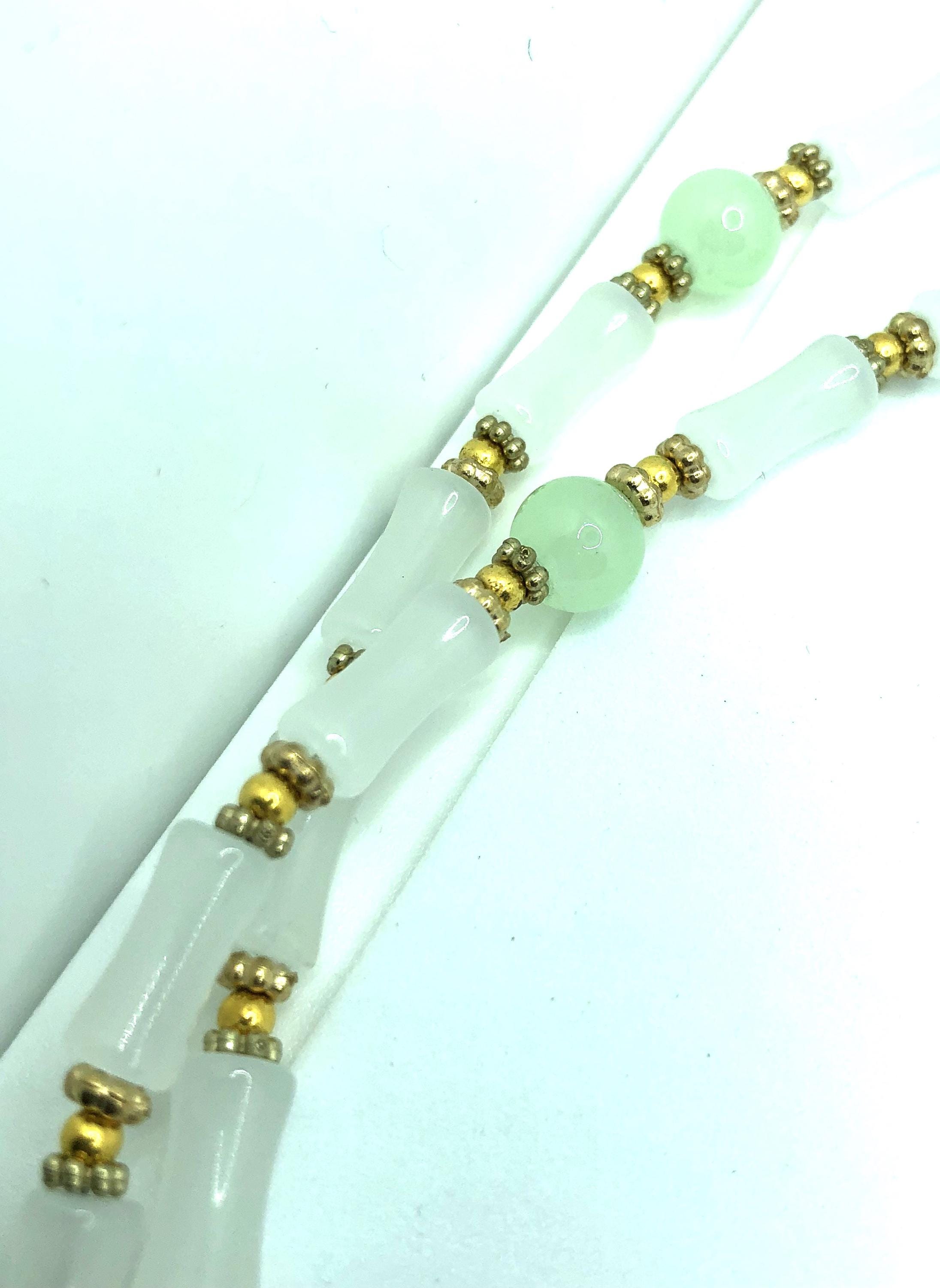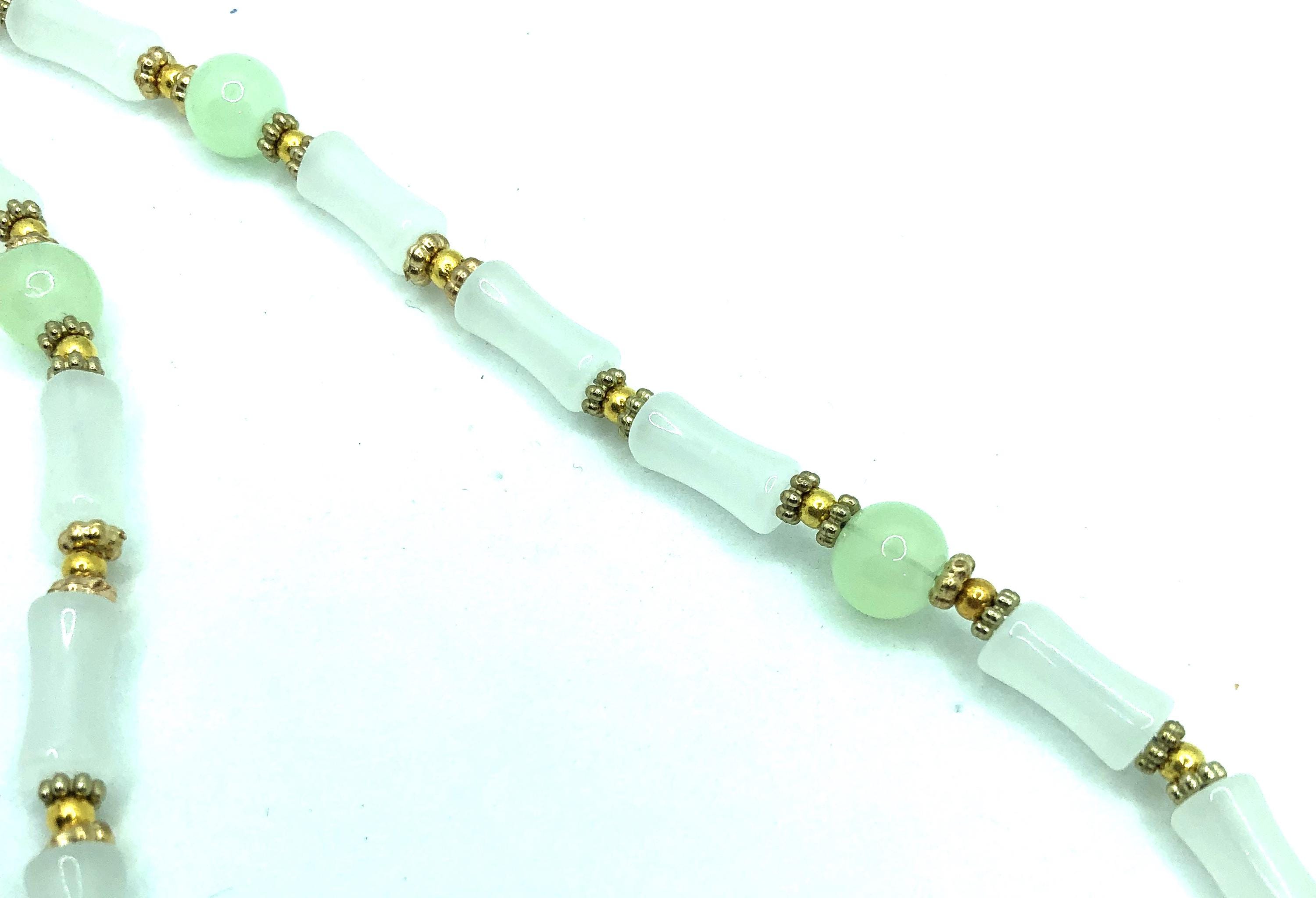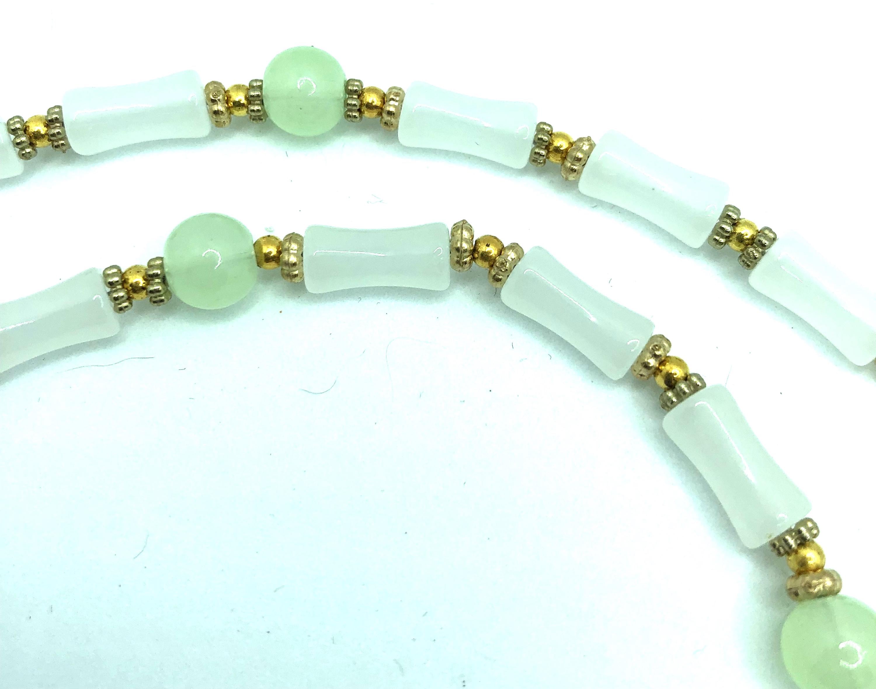 This 17" necklace is made of pale green jade and golden beads with a 2" pendent made of a golden metal crack tile.