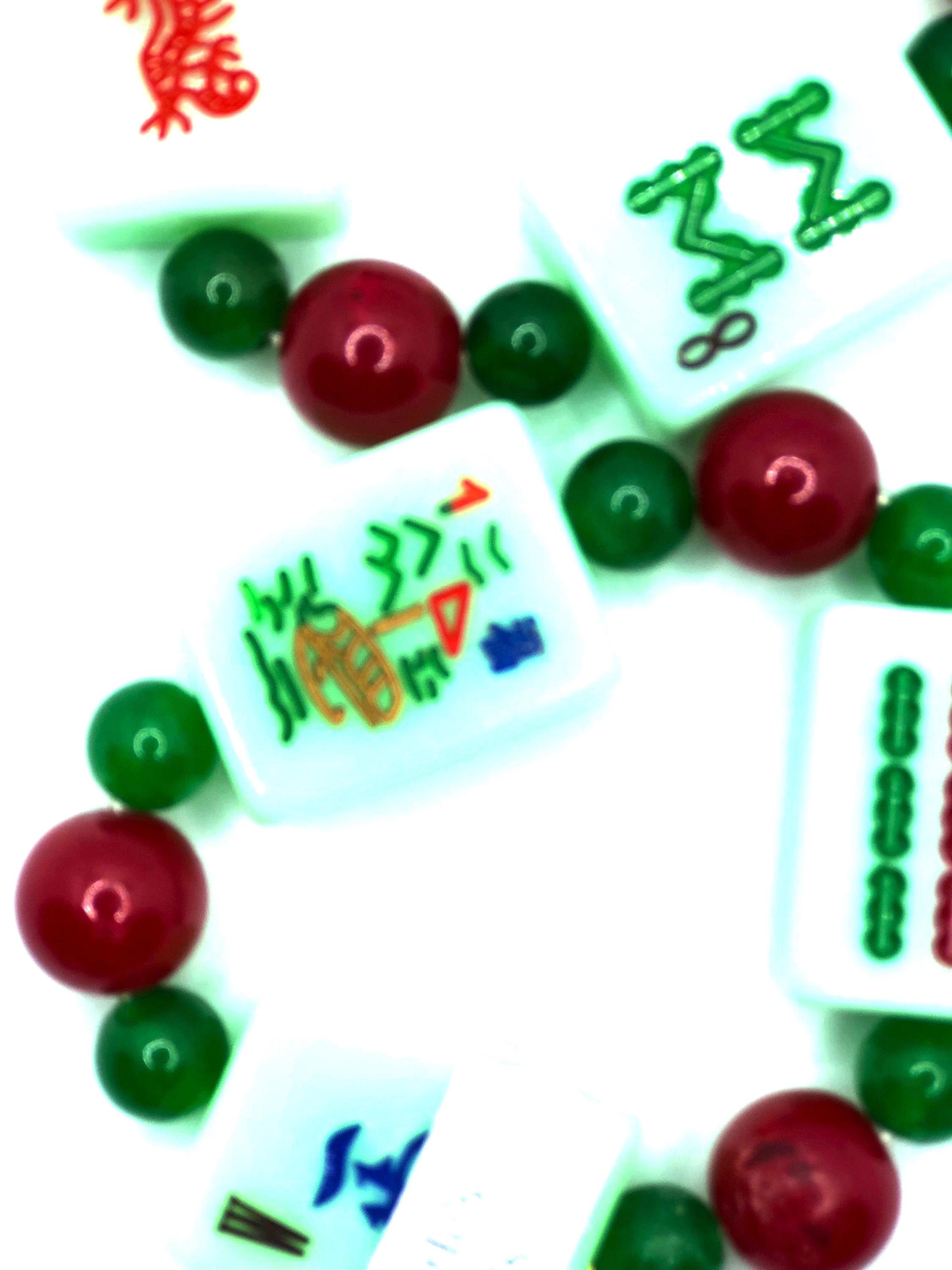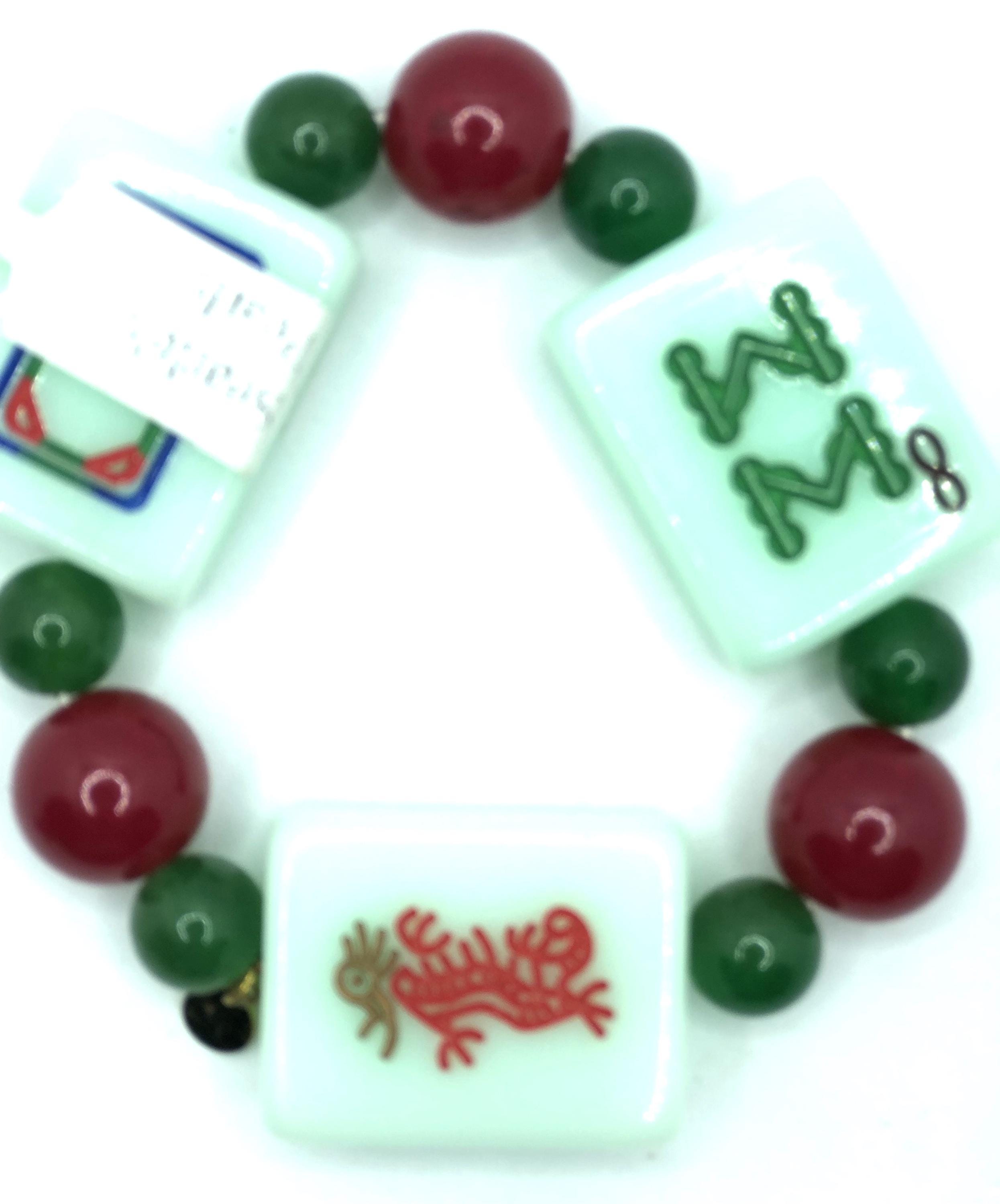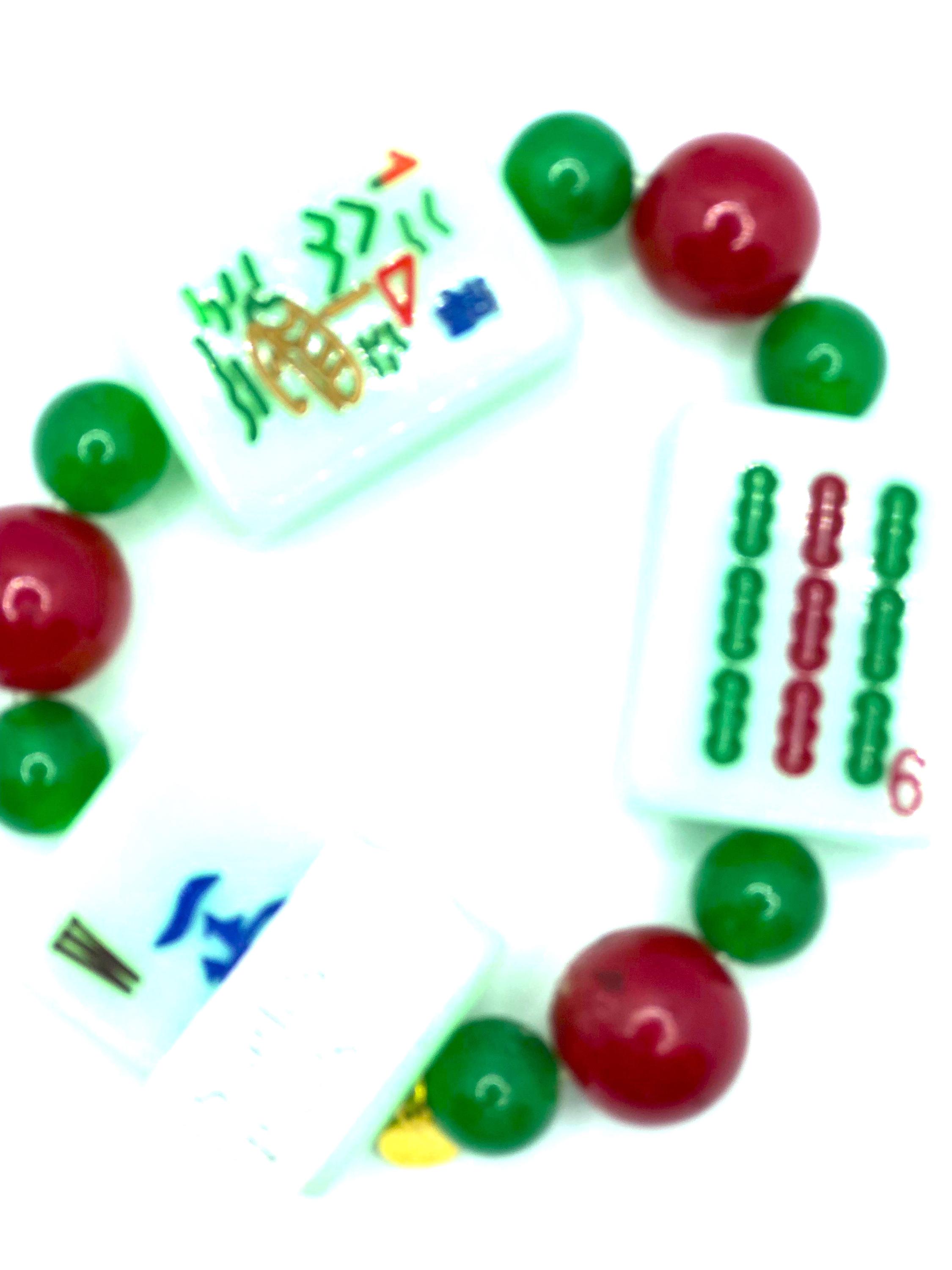 2 elastic bracelets with 3 green mahjong tiles and red and green beads: