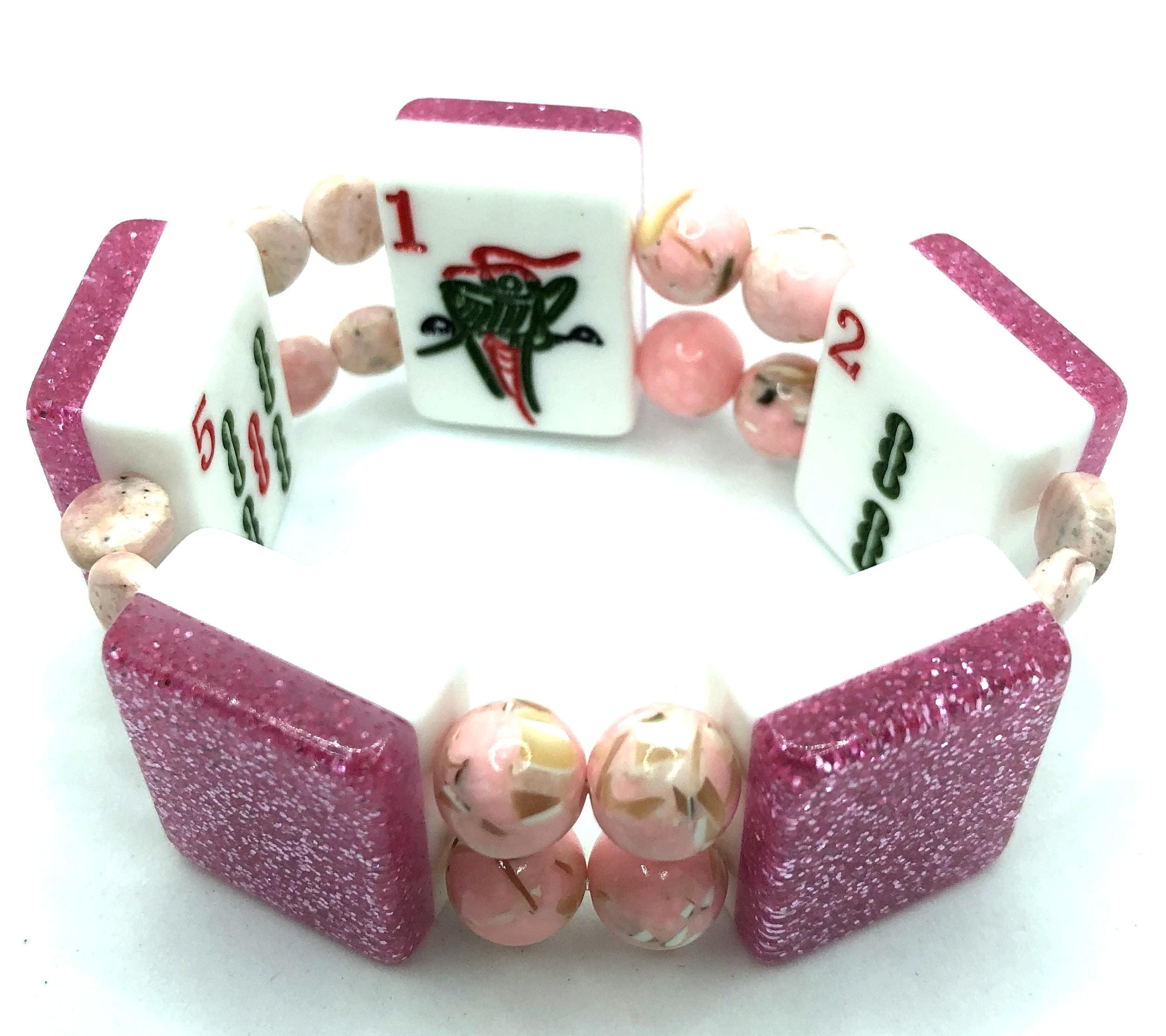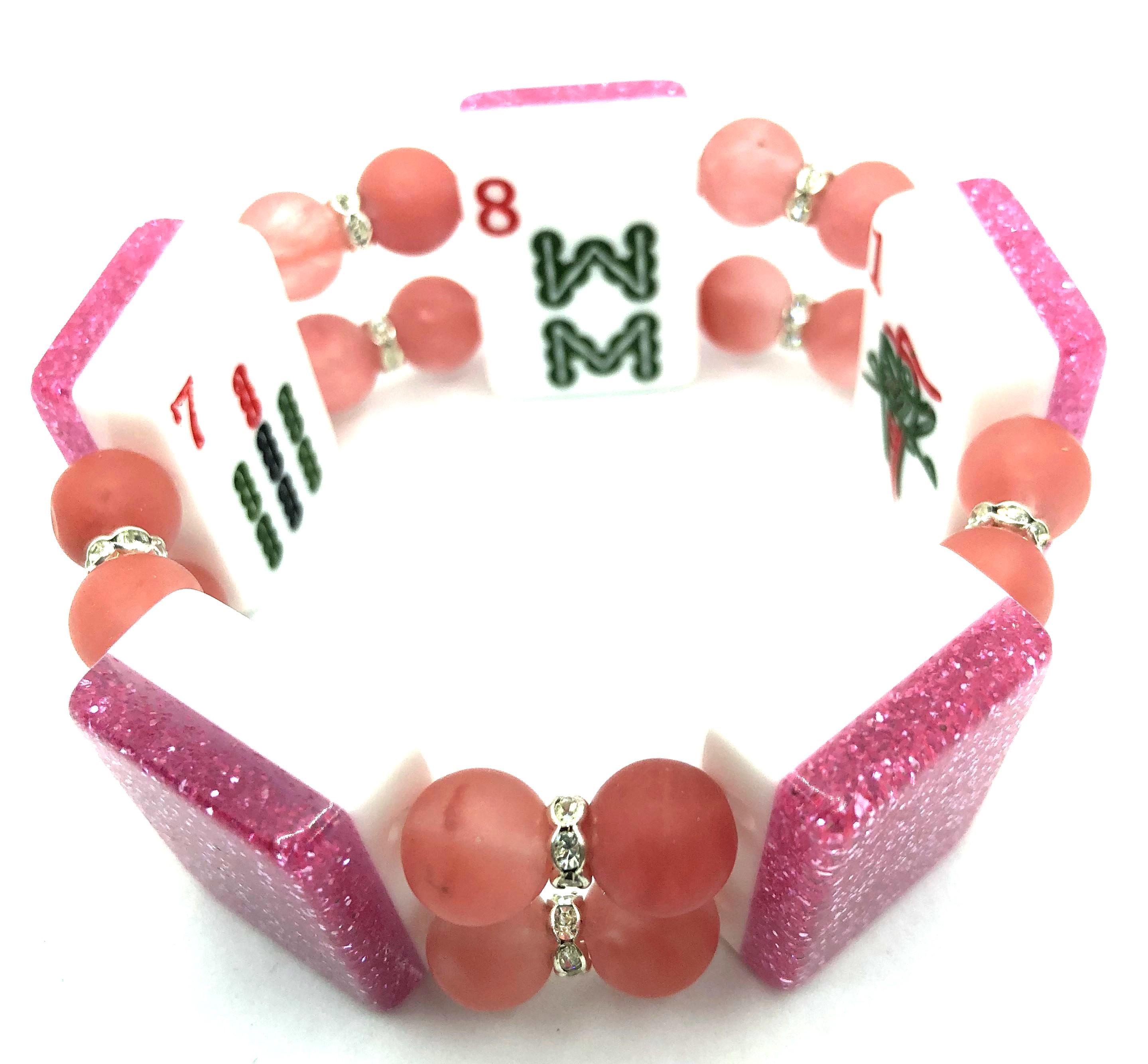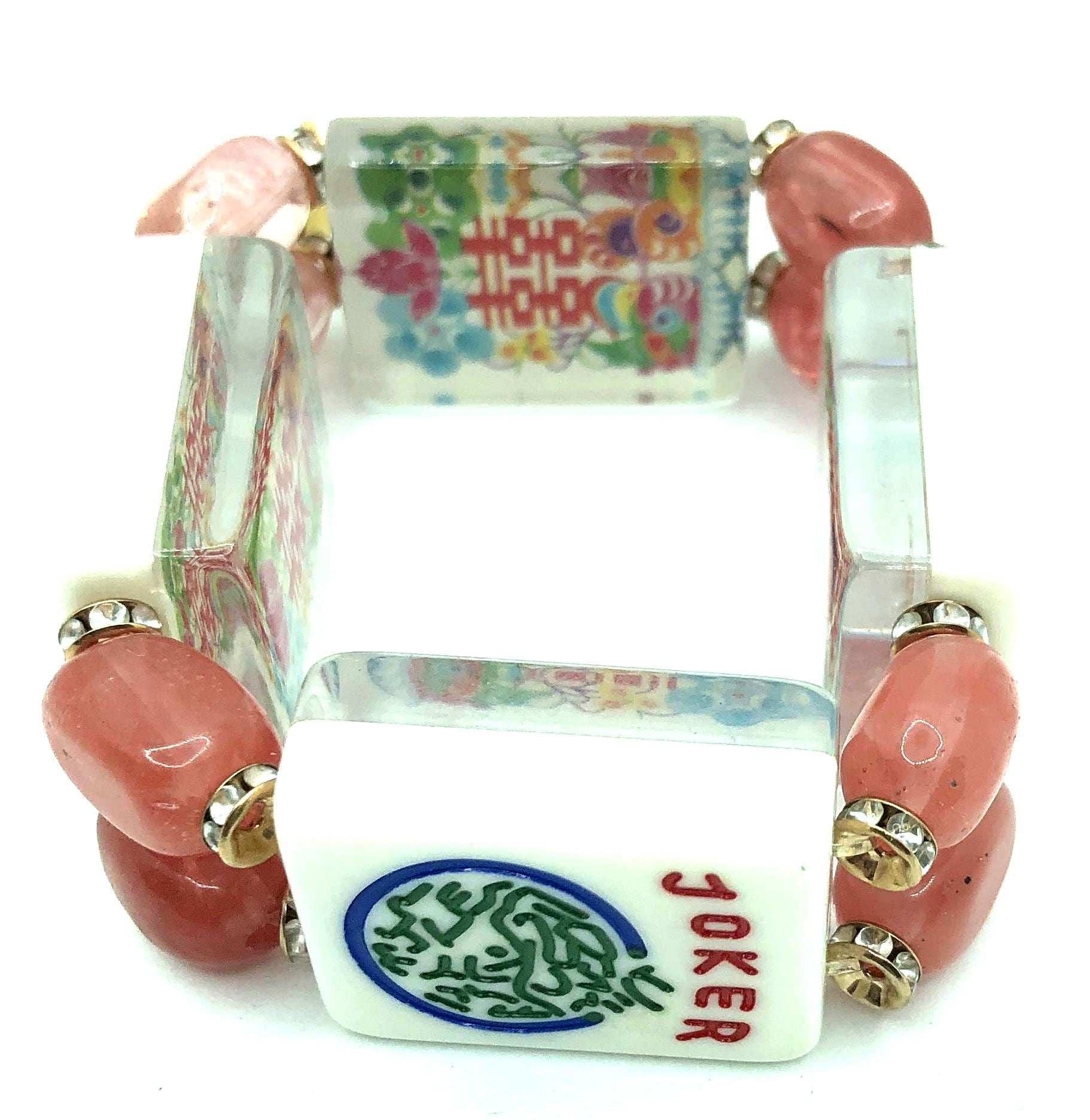 3. oriental design back, 4.5" clear pink beads, 5 Bam, Joker, Green Dragon, and Flower Tile