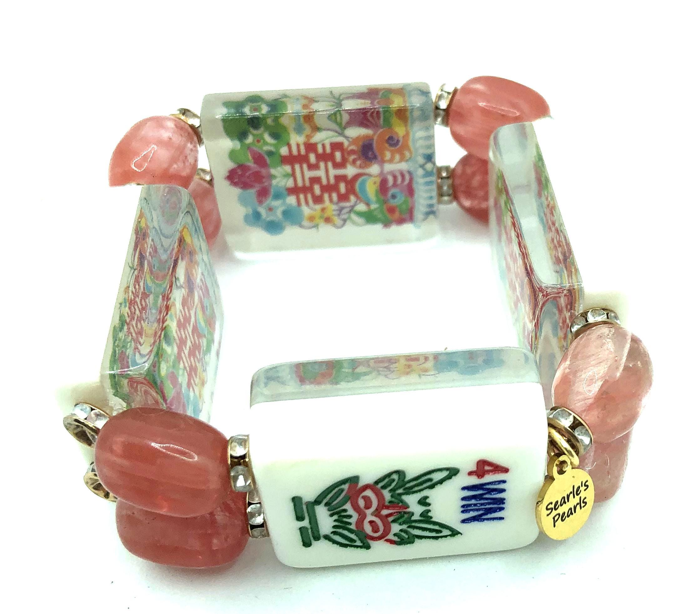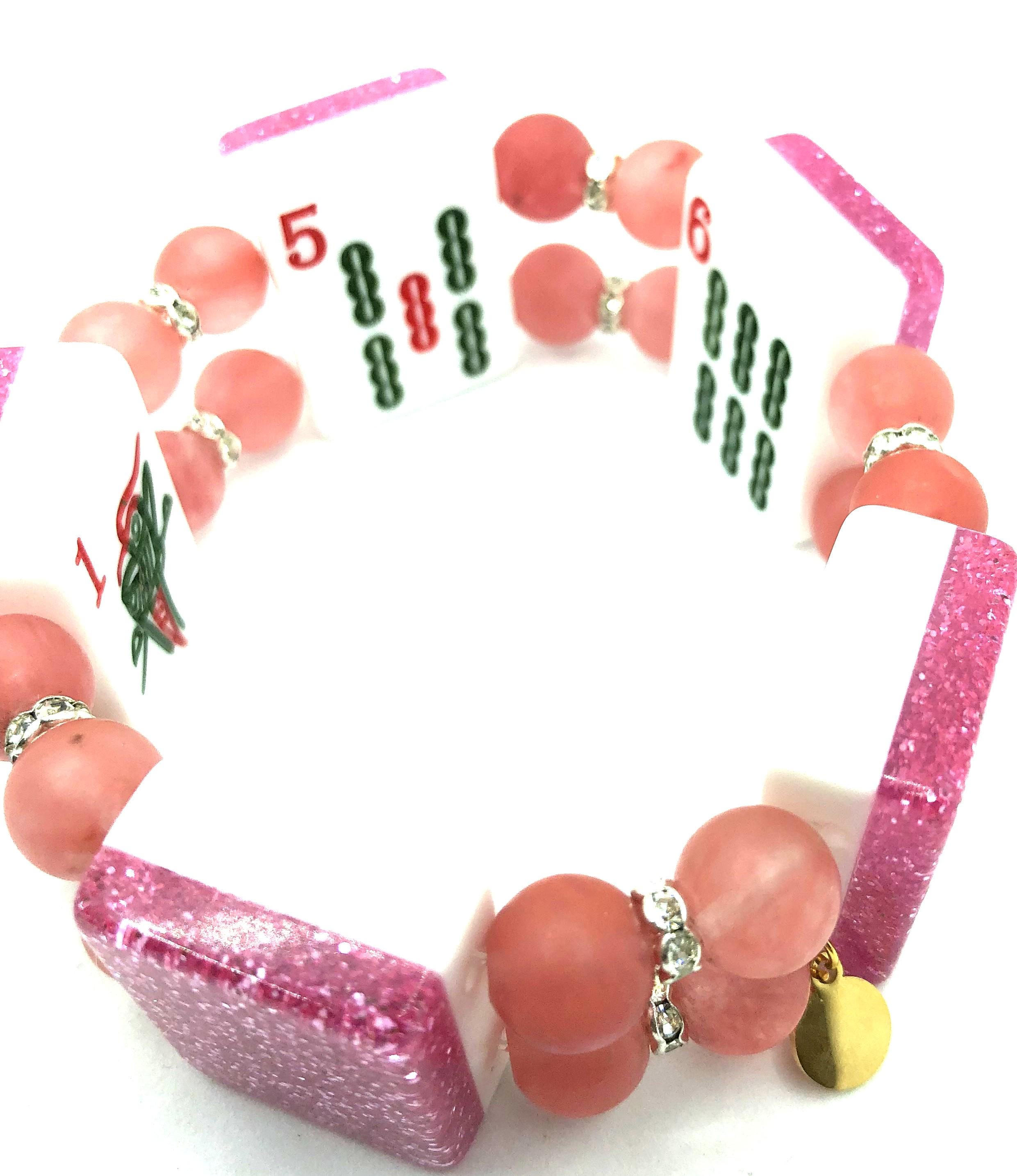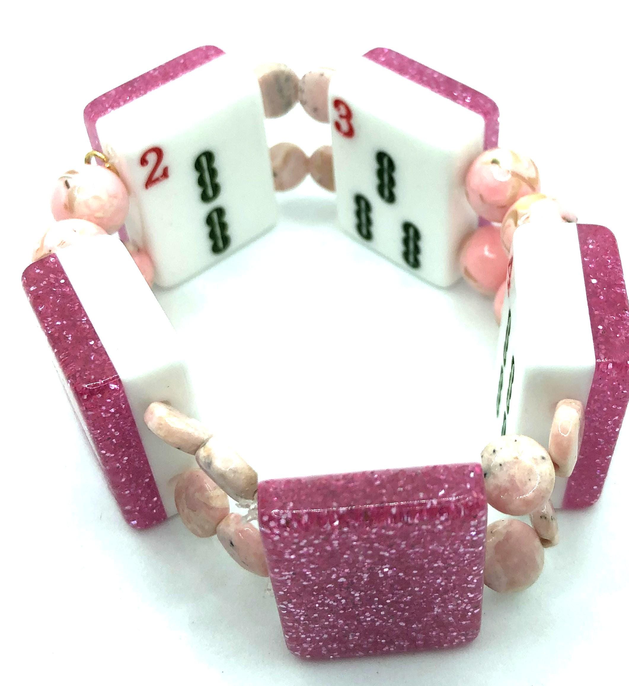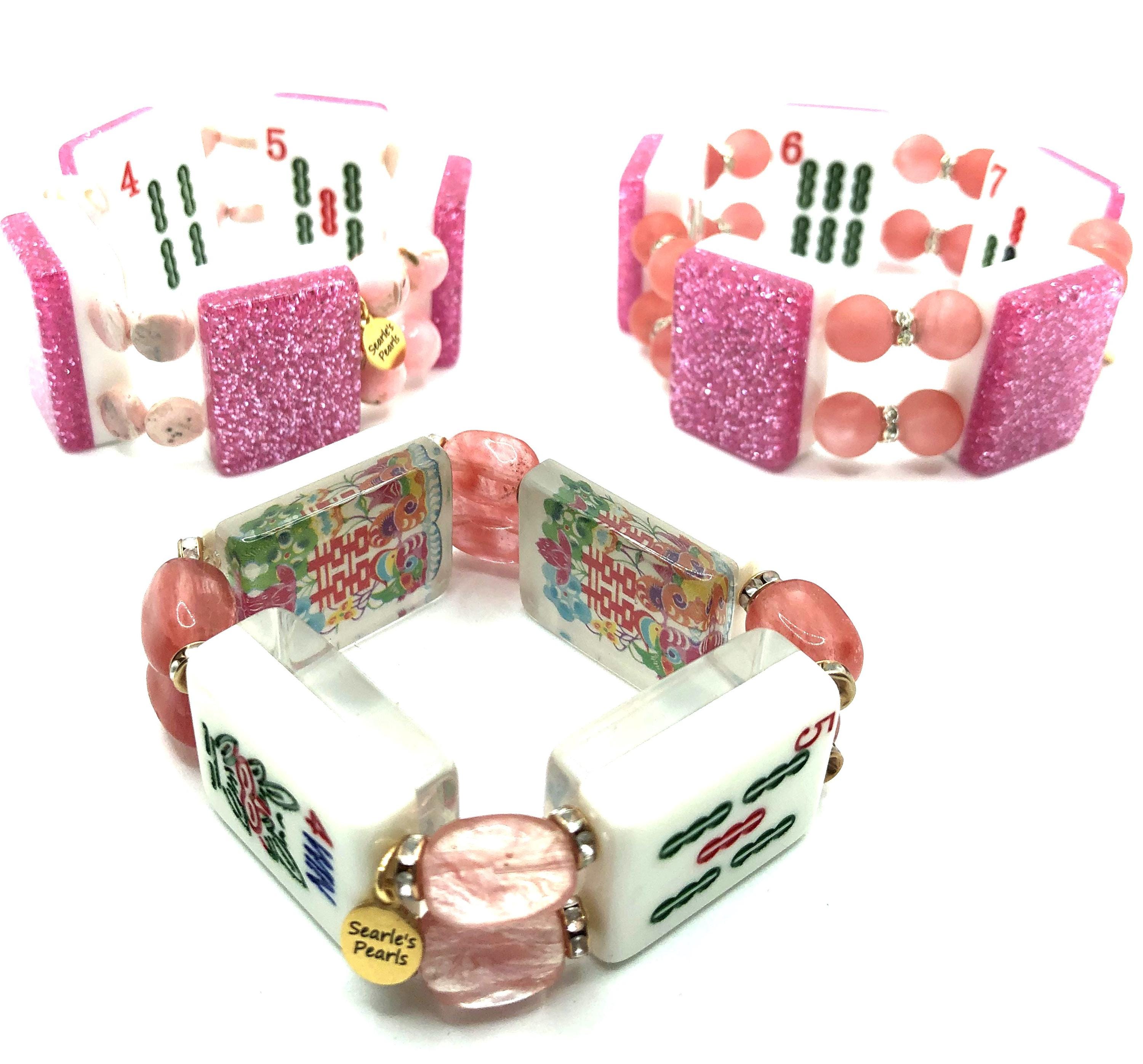 3. oriental design back, 4.5" clear pink beads, 5 Bam, Joker, Green Dragon, and Flower Tile