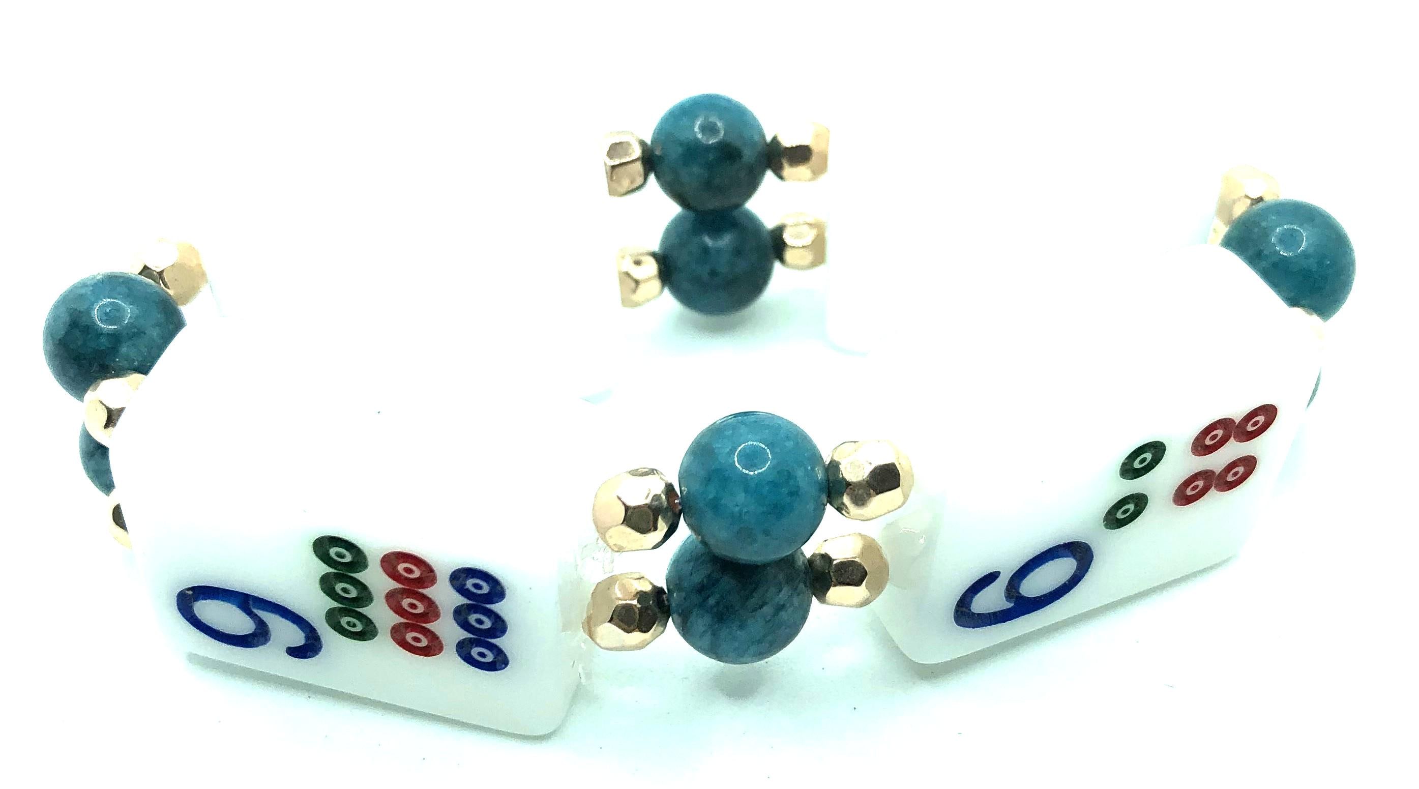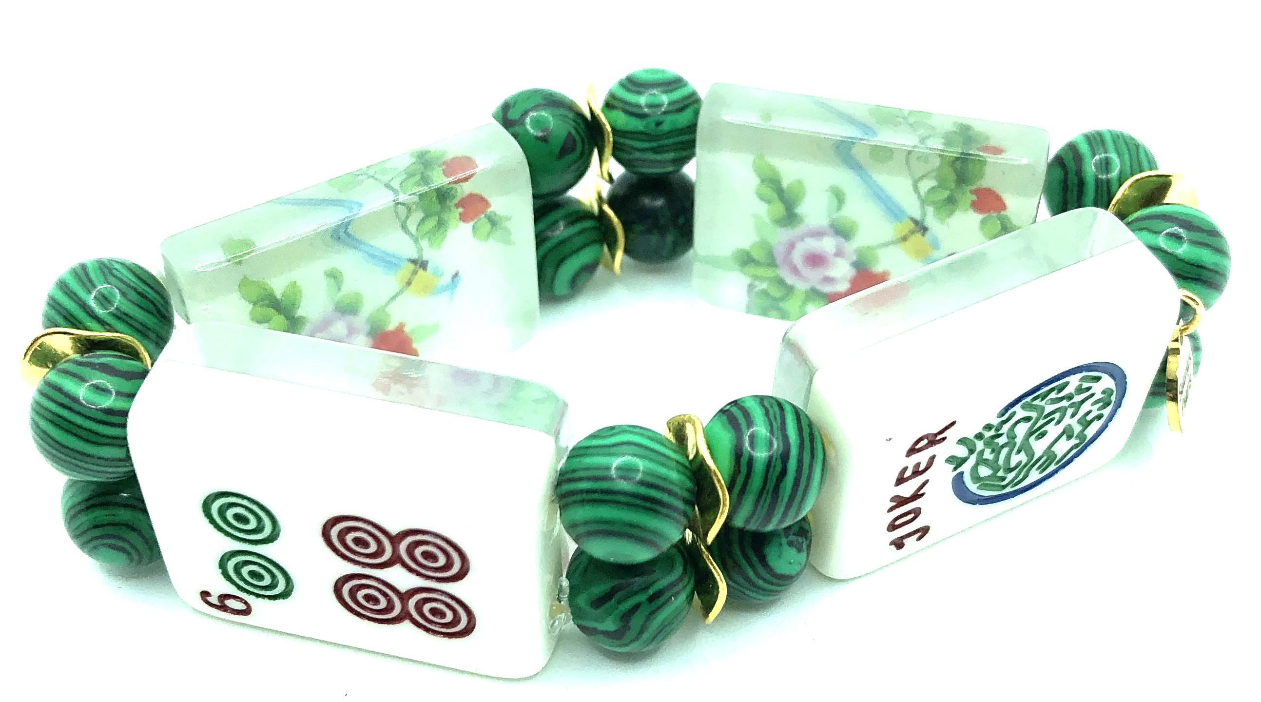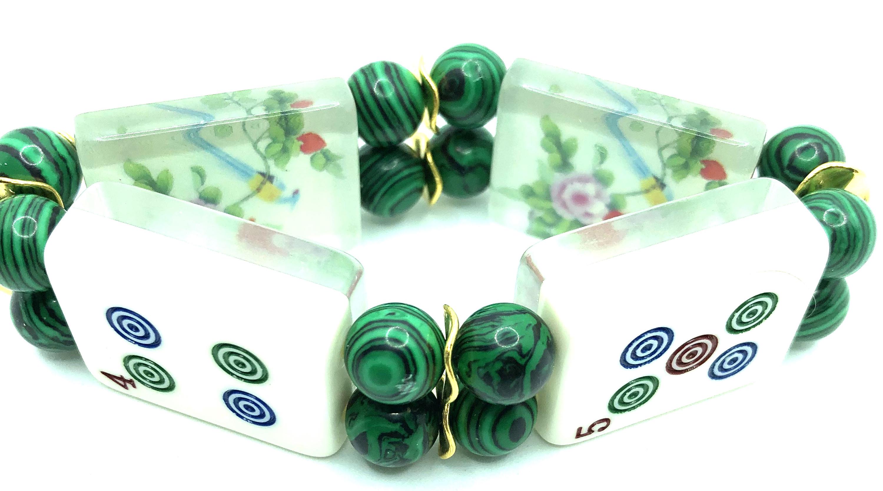2. 7.5" green malachite beads with golden flat spacers, 4,5,6 dot and joker tiles.