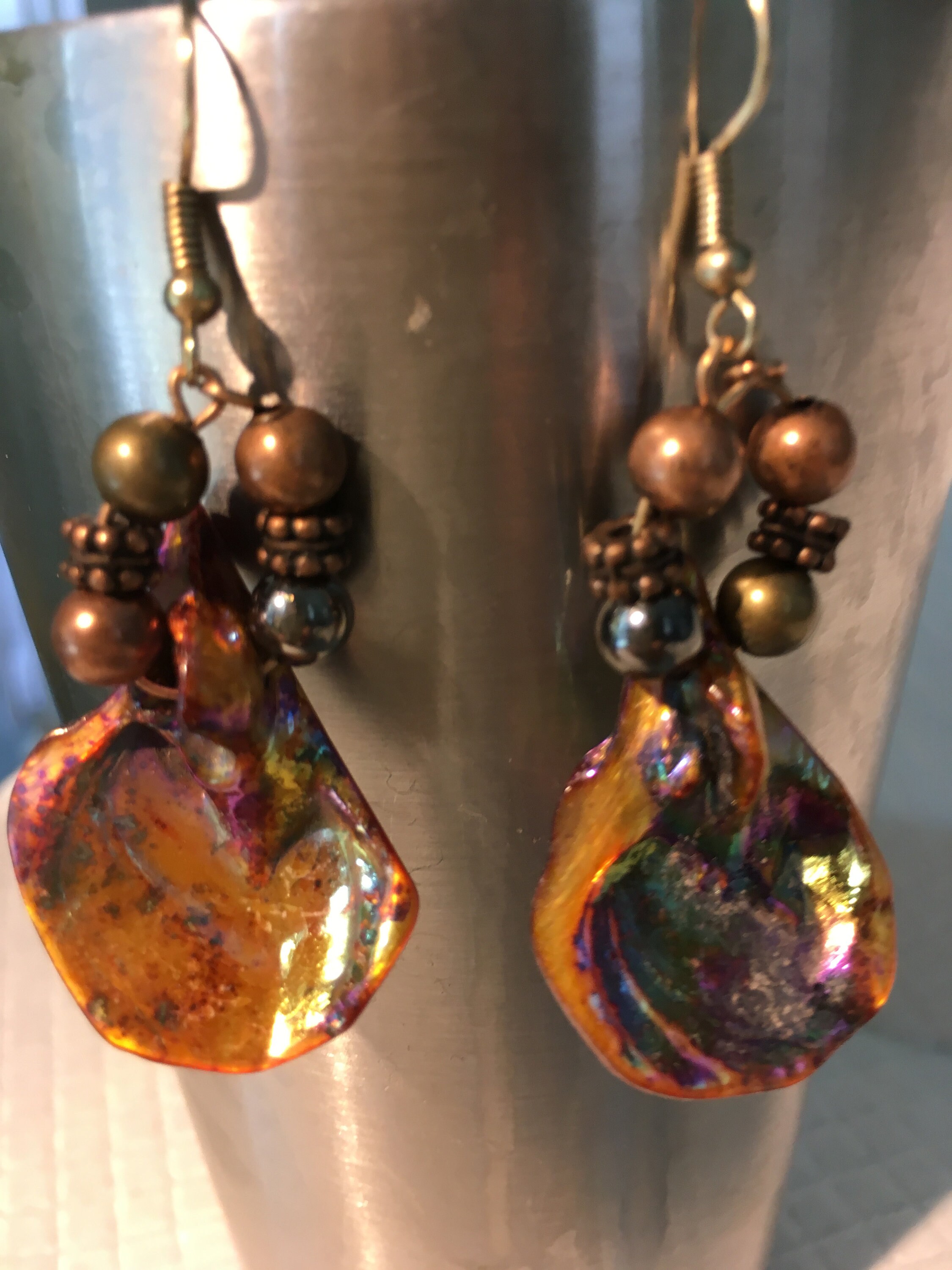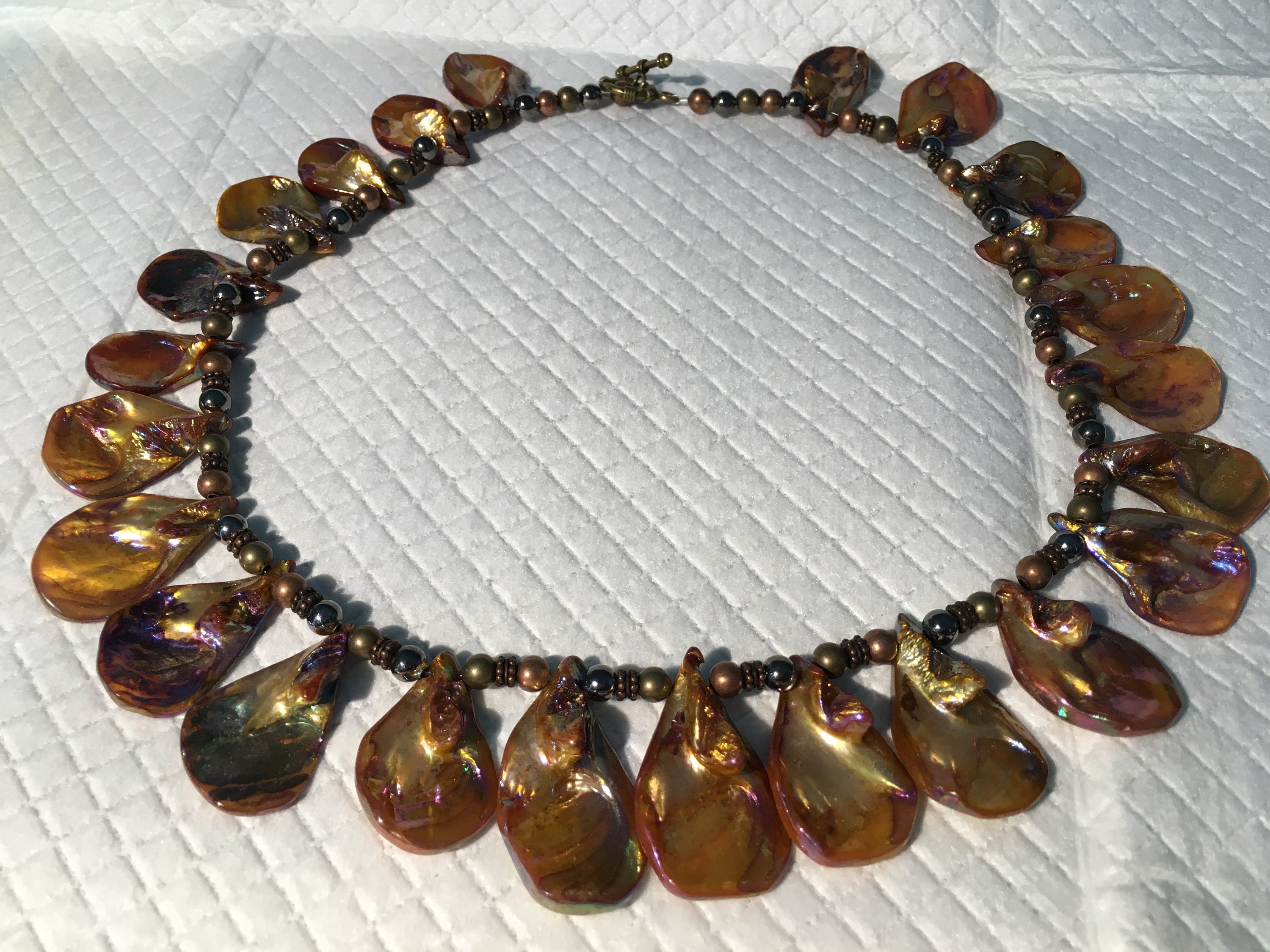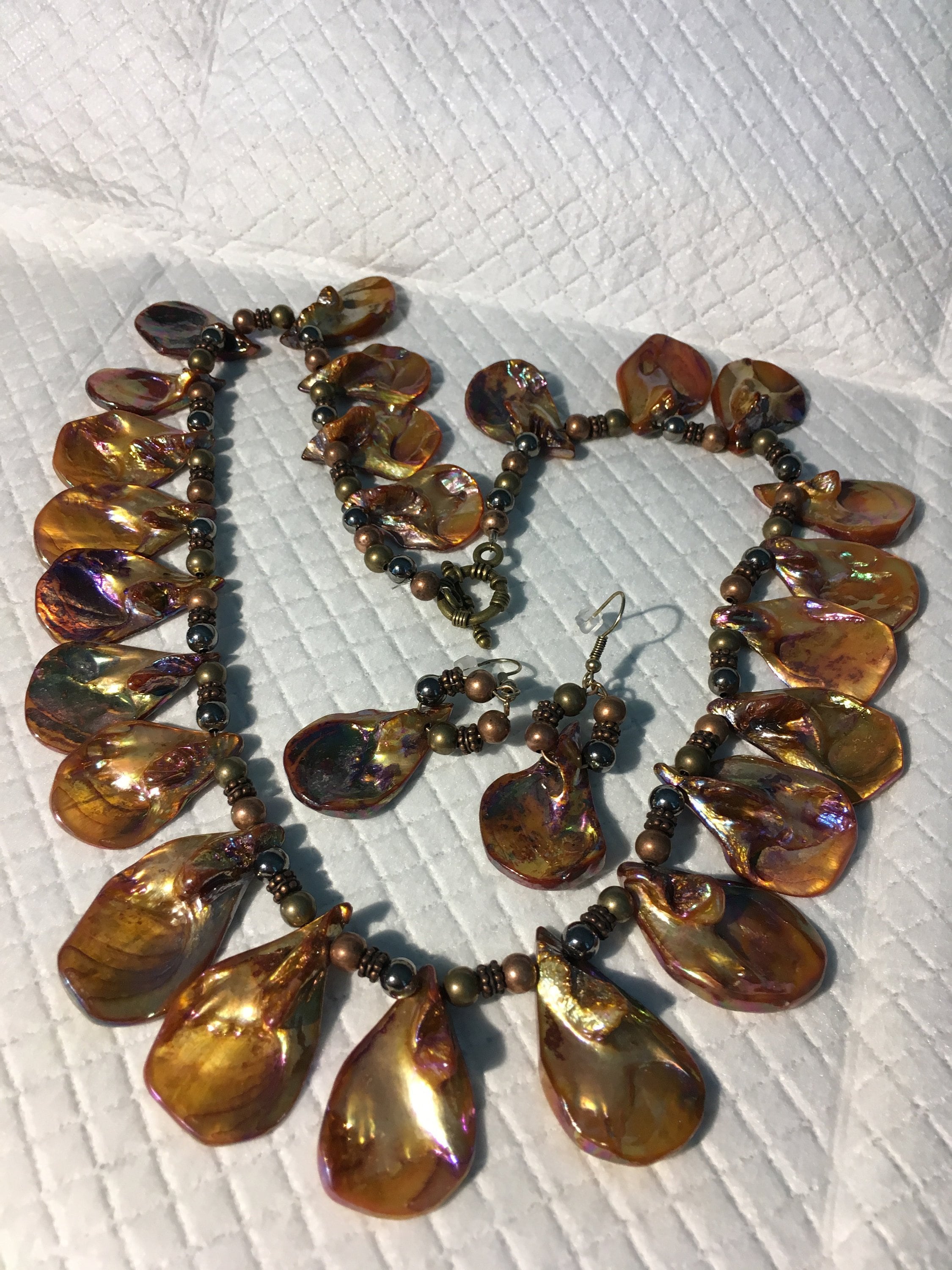 Beautiful pearlized bronze colored blister pearl shell and pearl necklace and earrings. Great gift for any occasion. Sold as a set.