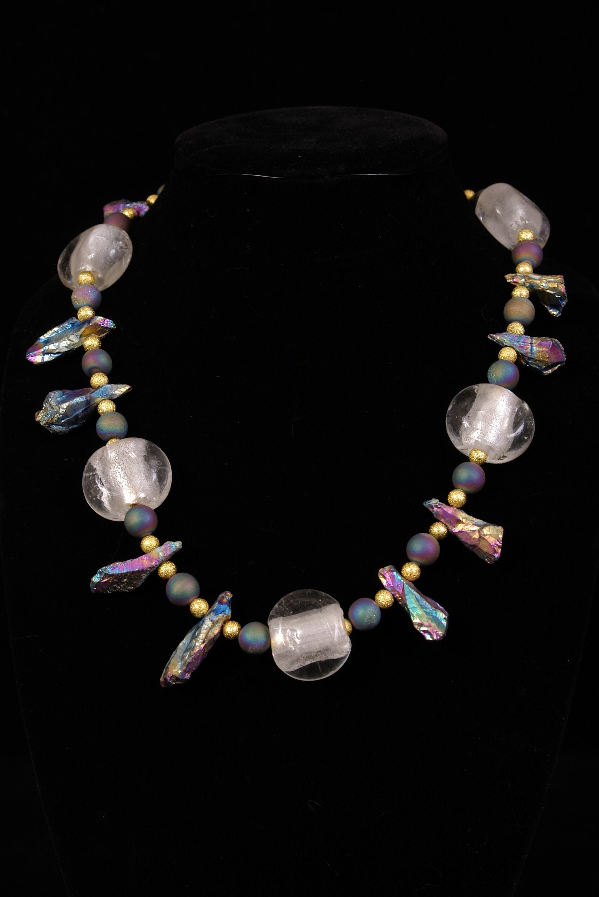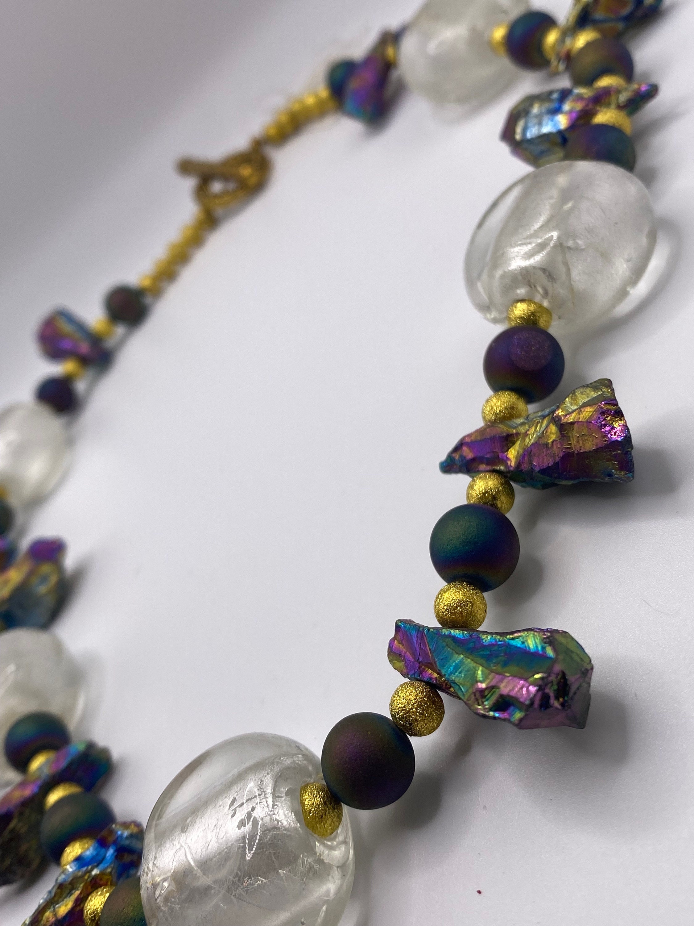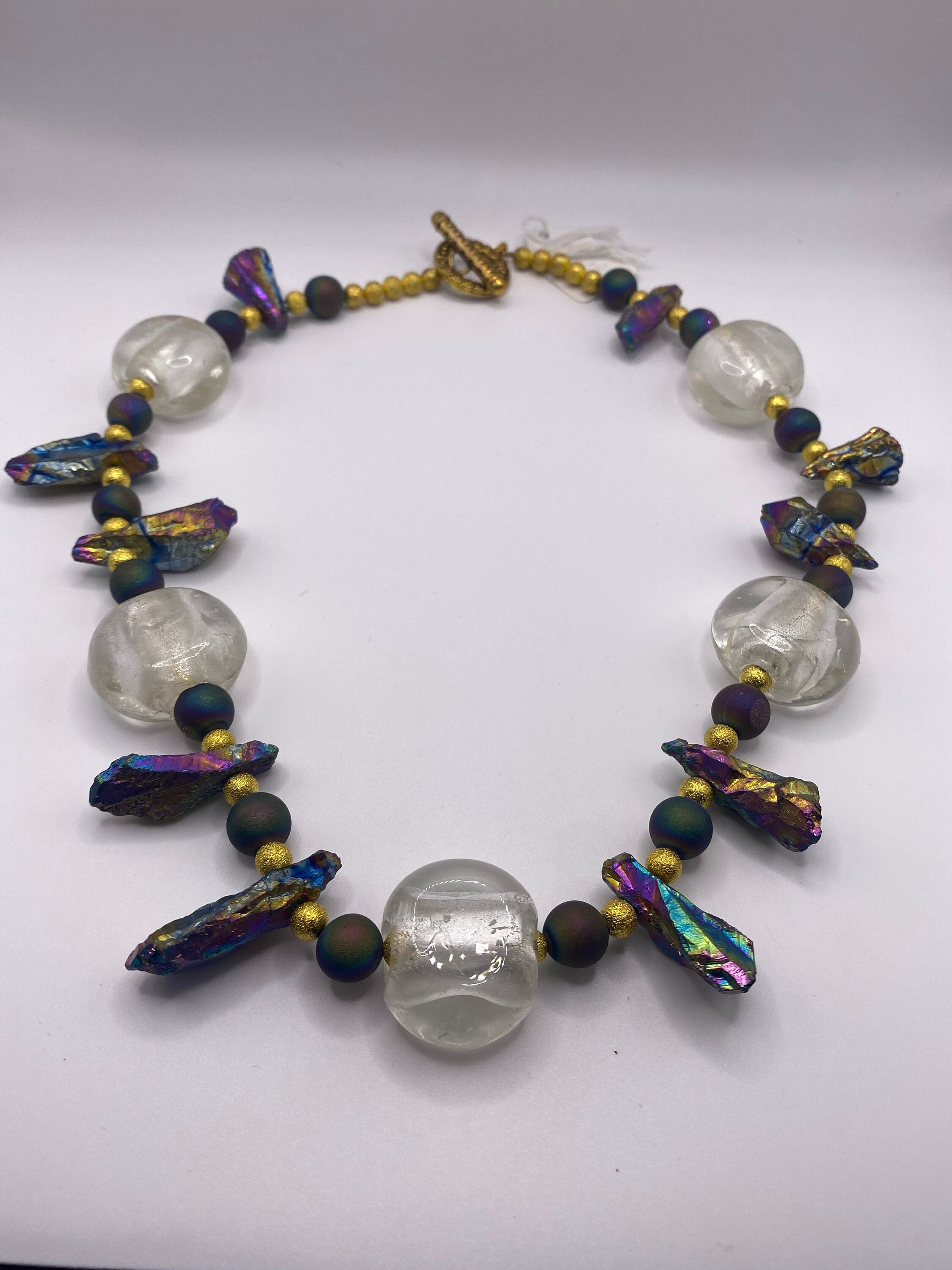 Ask a questionUnique, large crystal like beads, iridescent stones, and peacock agates with gold bead necklace.
