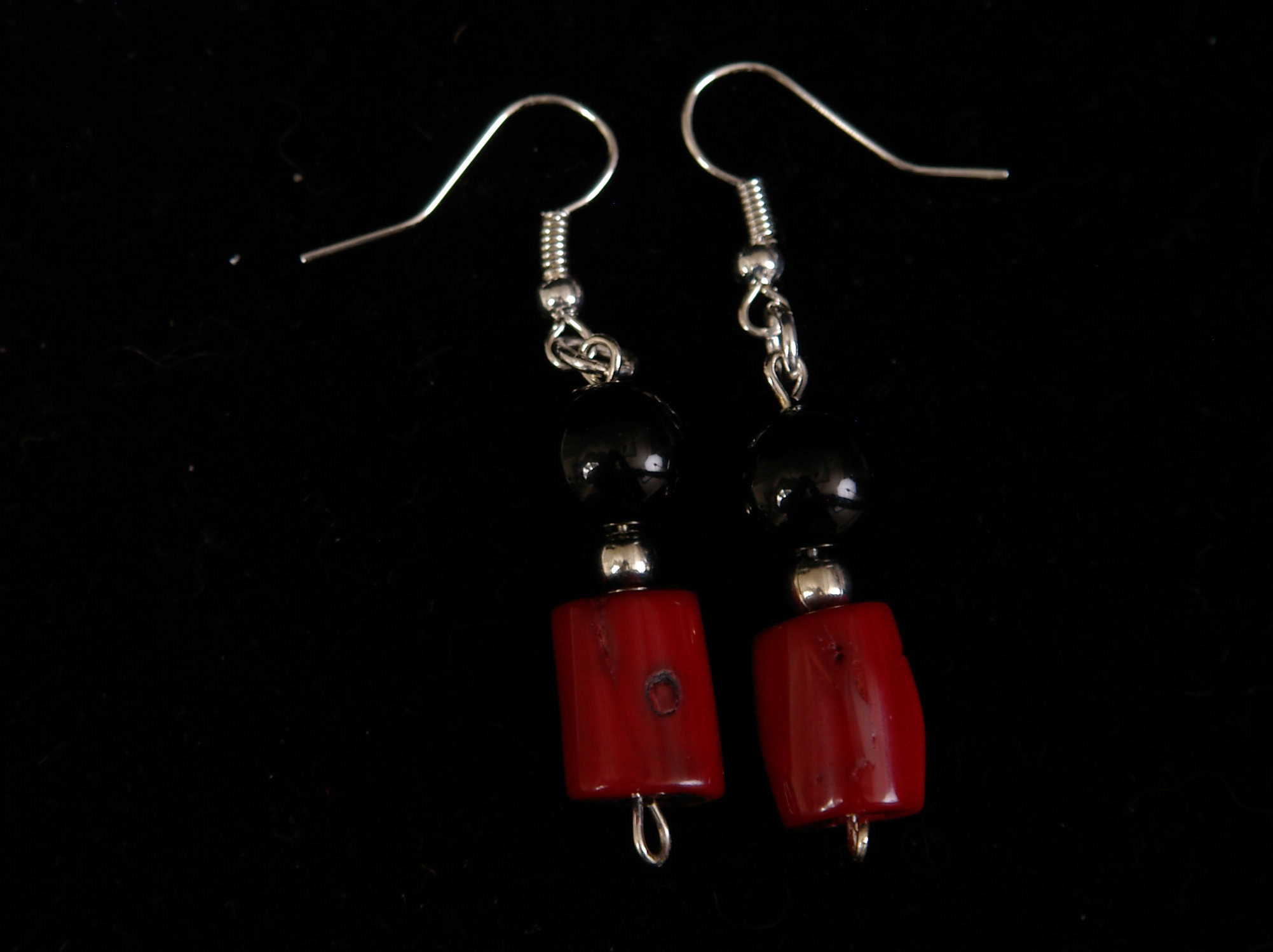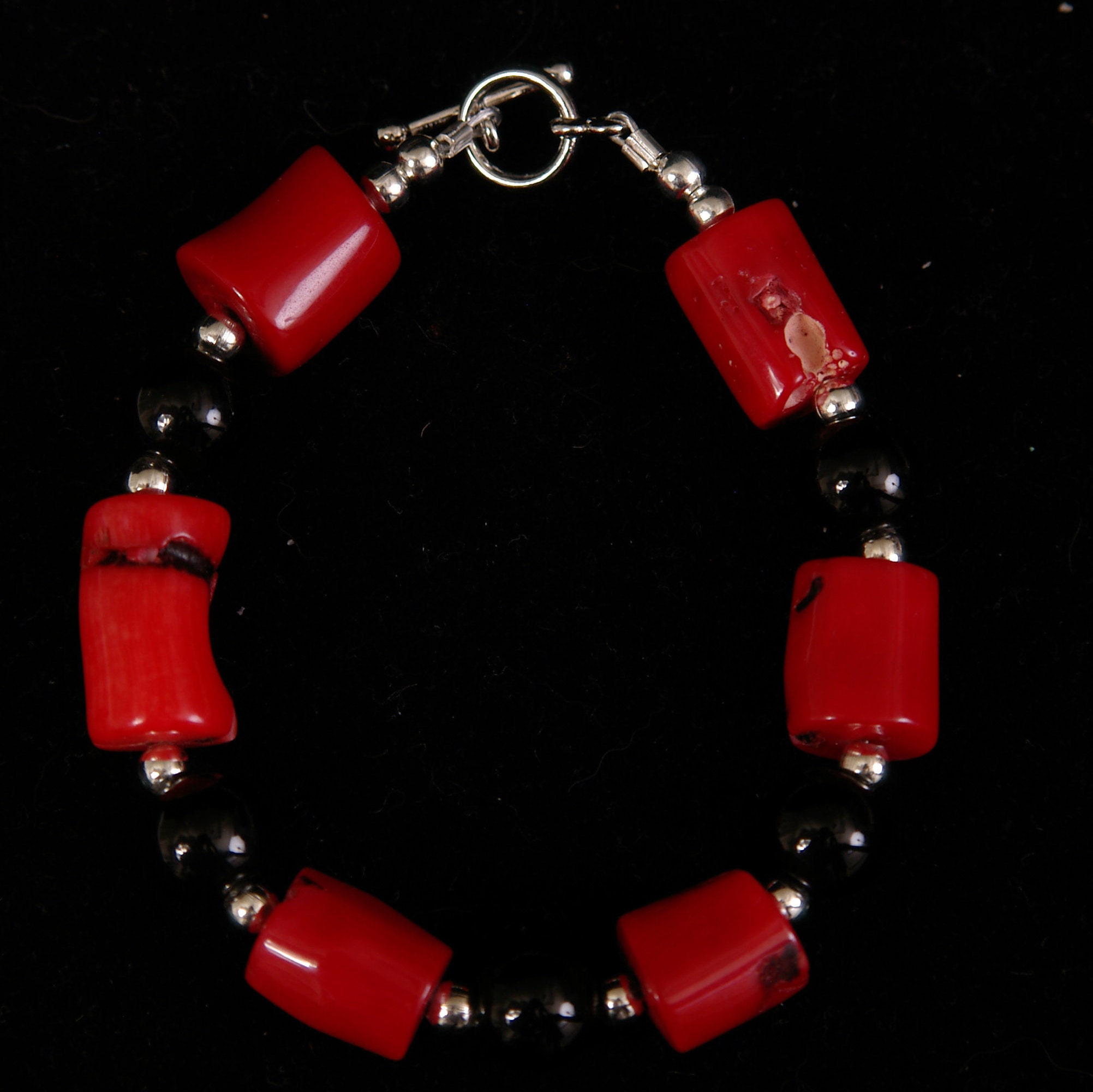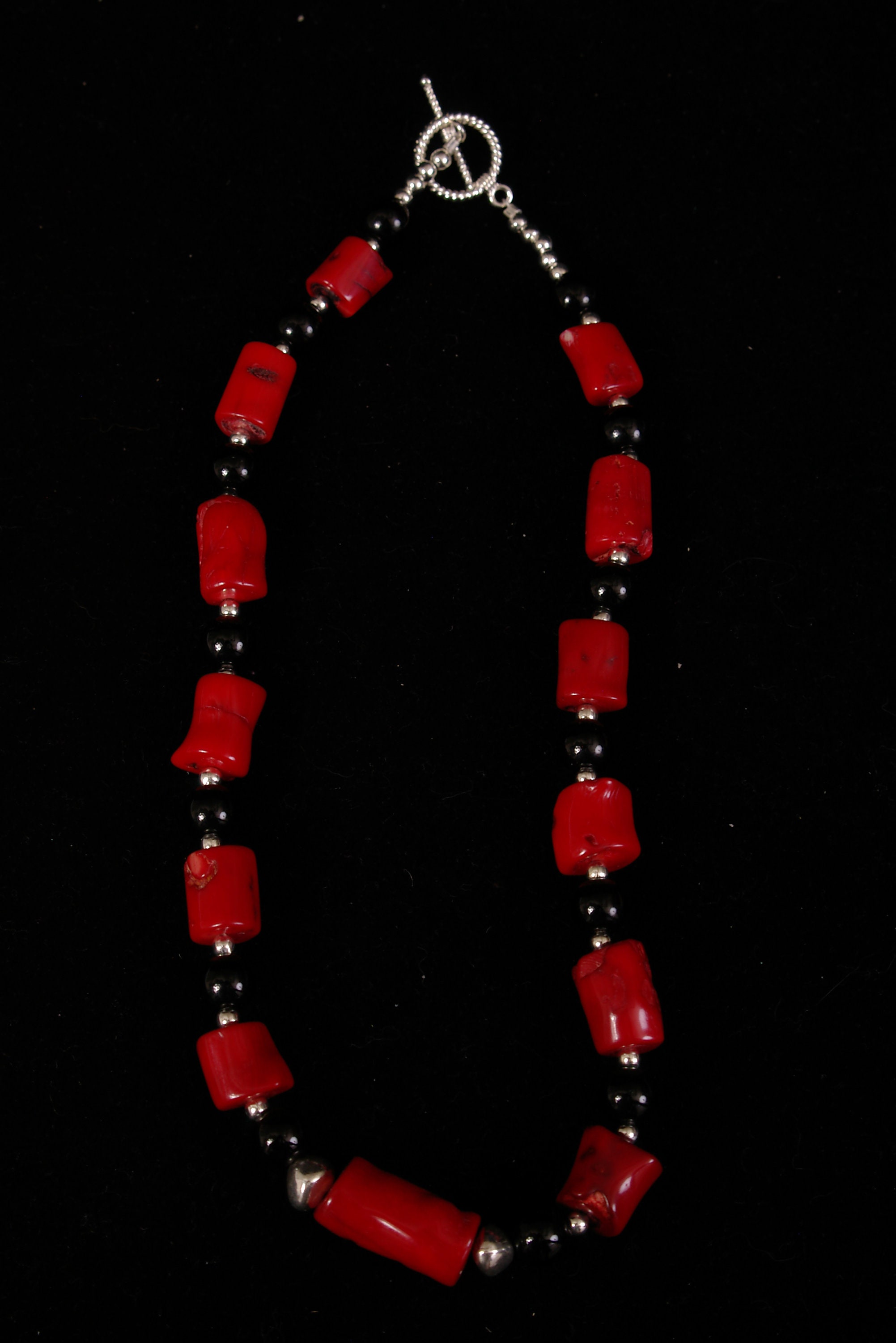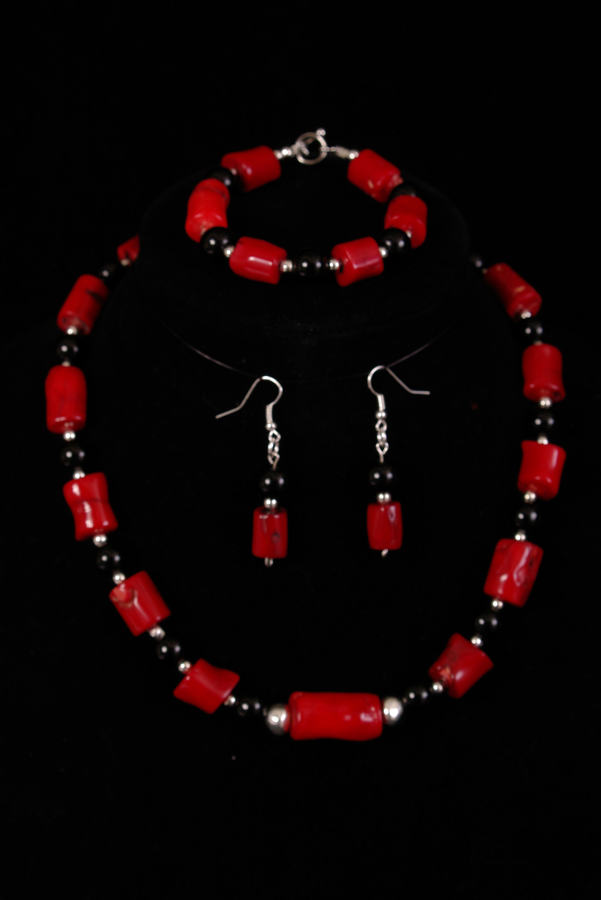 This jewelry set is made of bamboo, gold beads, and black onyx. All three pieces are sold as a set.